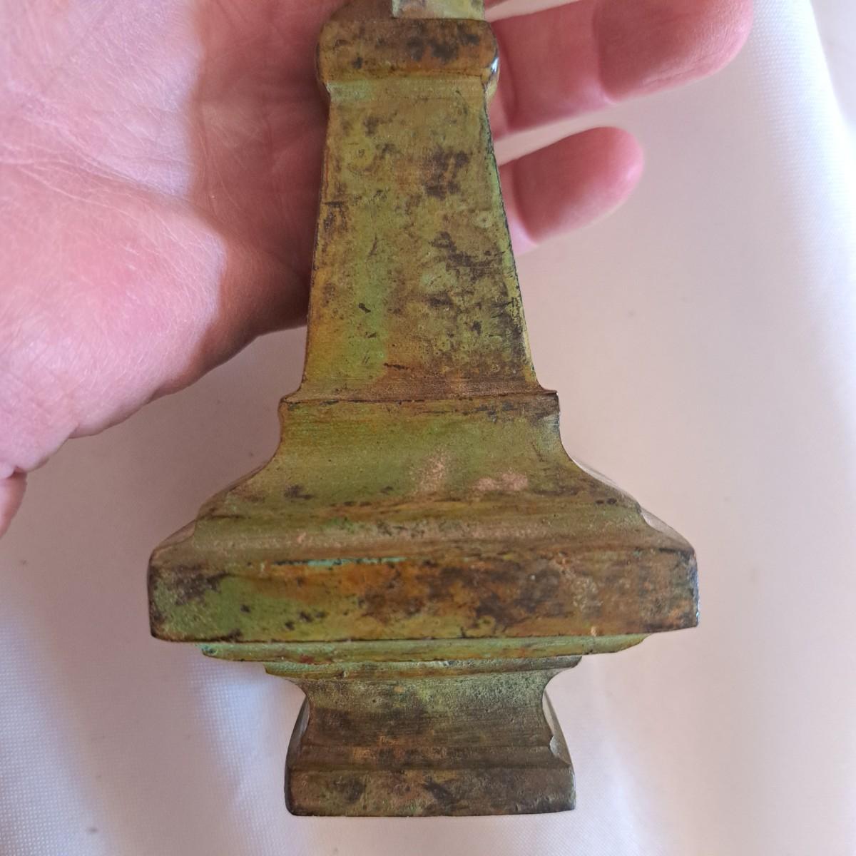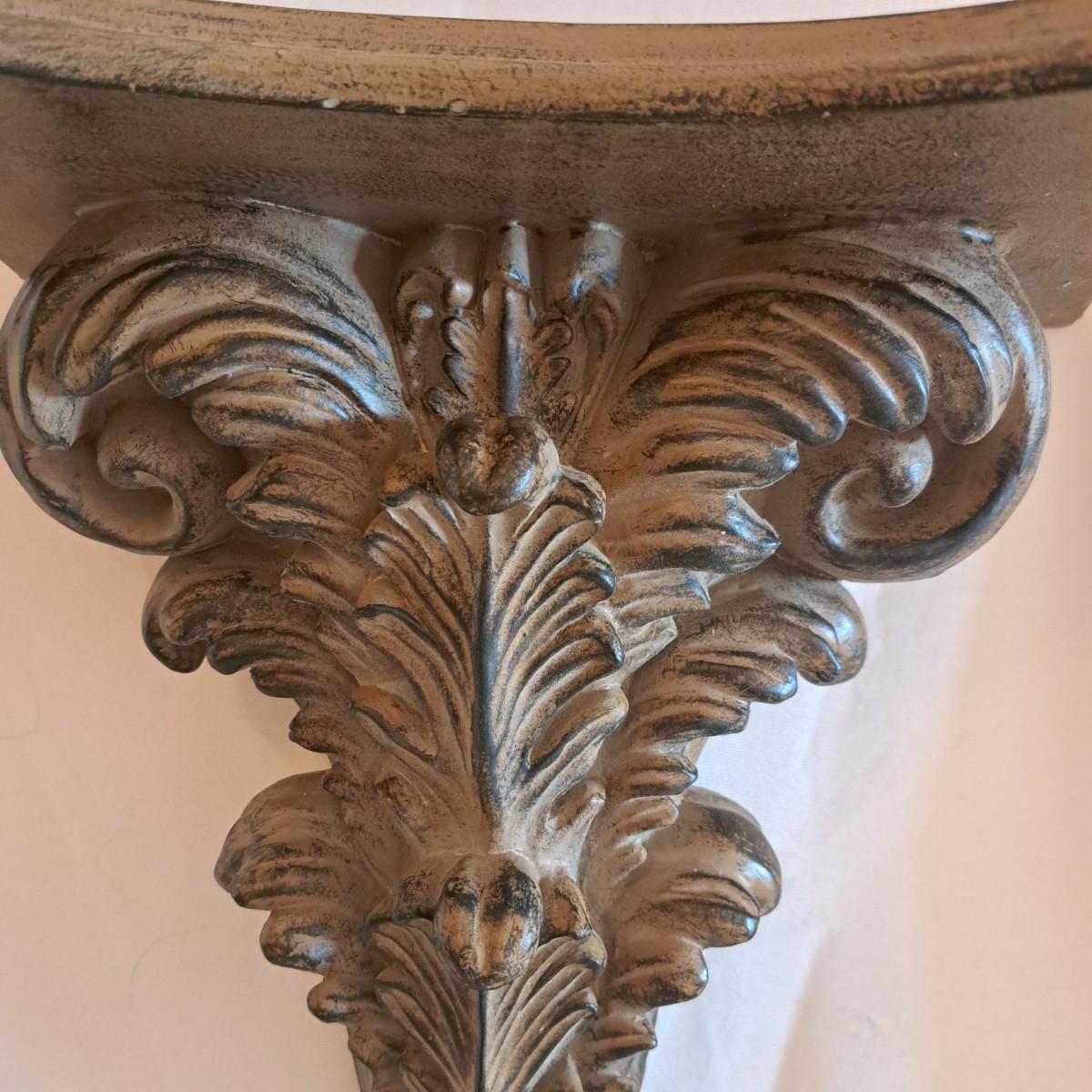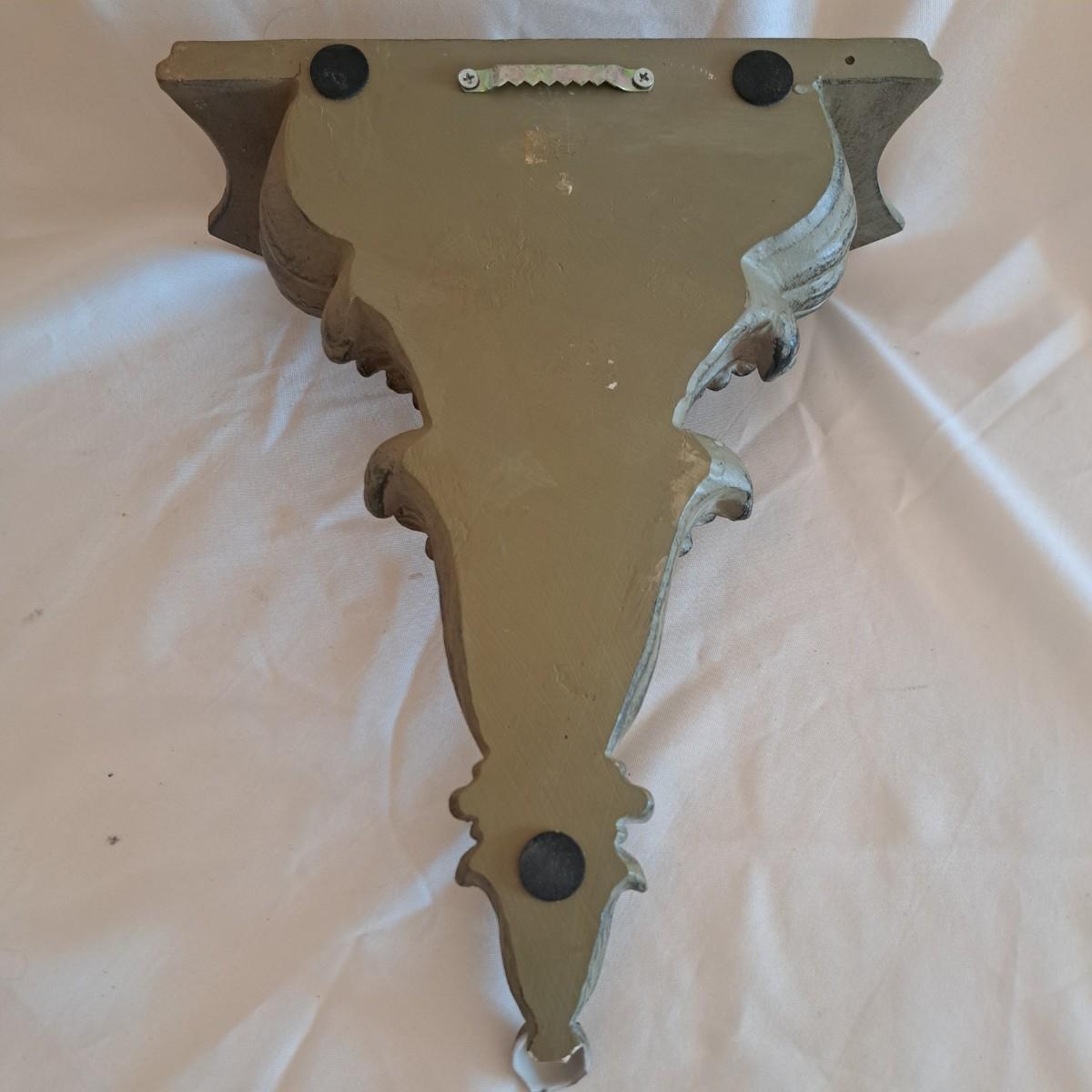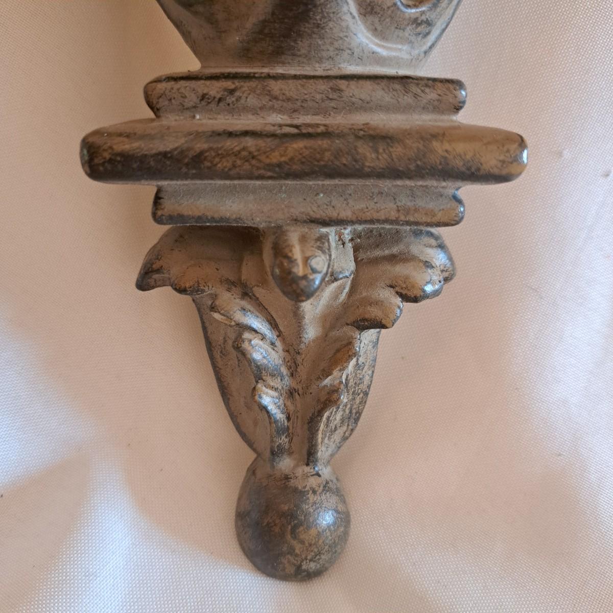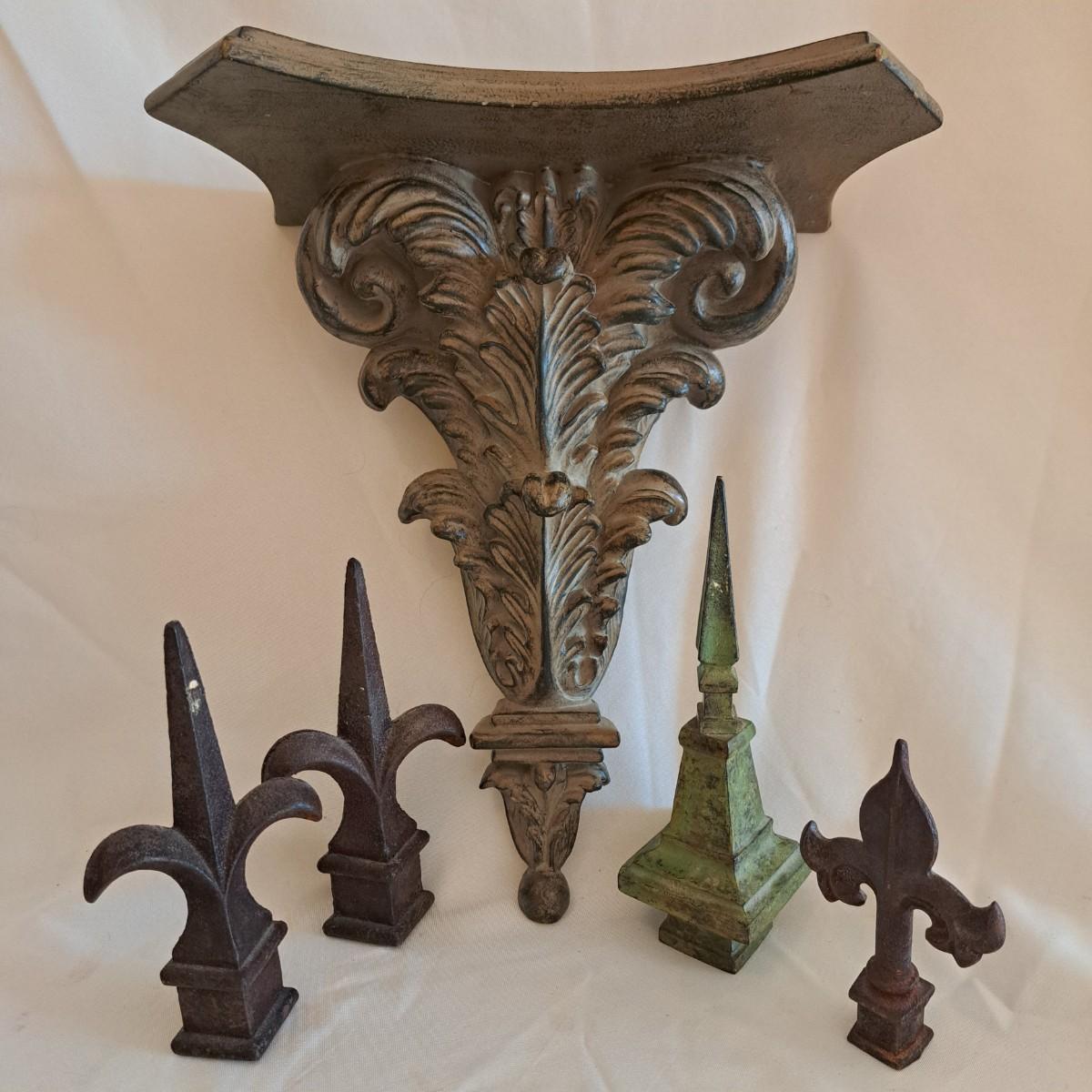 The four metal cast iron finals range from 5"H to 8"H, the largest having a verdegris finish. The ornate composite corbel wall shelf is 12" x 6" x 14"H and has a groove at top for holding a plate, artwork, etc. Also of note, the backside of knob at bottom of the corbel is cracked as shown though the damage cannot be seen when hanging on wall as shown. Shipping available. Shipping can be costly. We suggest contacting our preferred local shipping provider, Postage Express, with dimensions and getting an estimate before bidding: (828) 255-9250 or shipping@postageexpressnc.com.