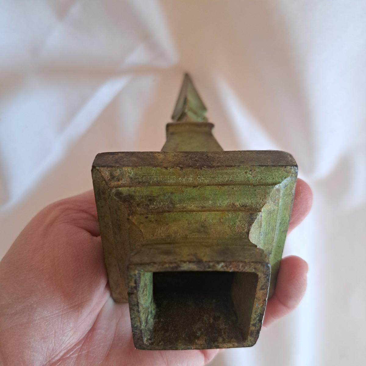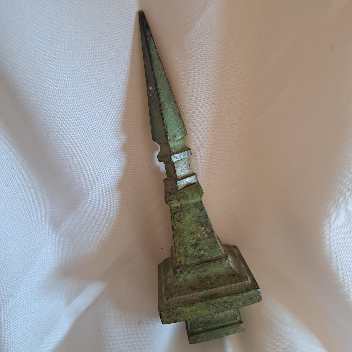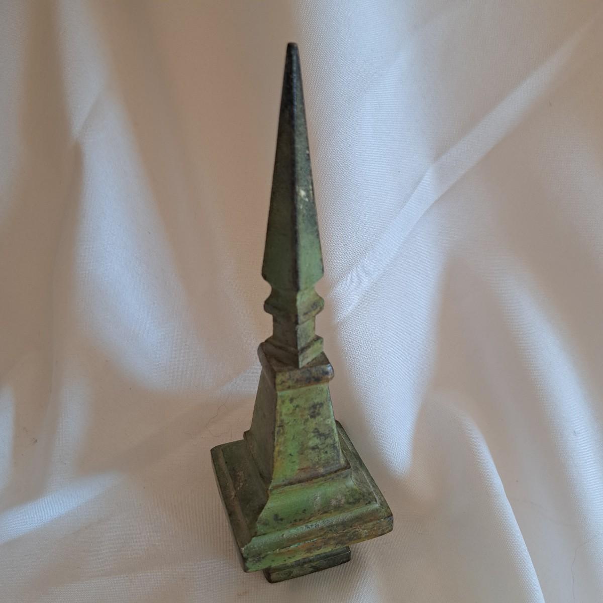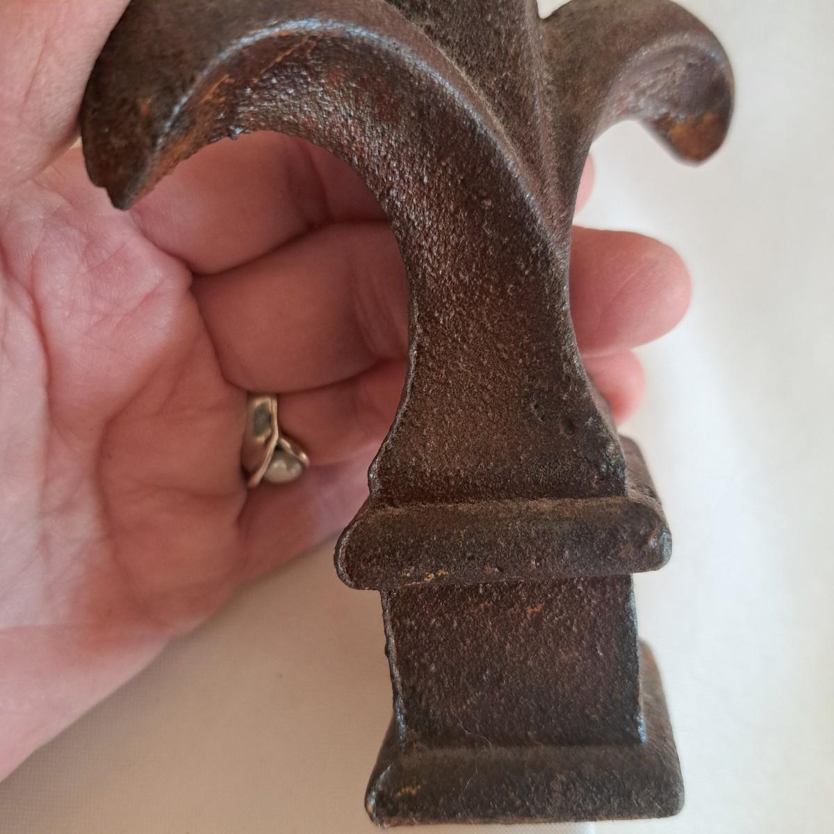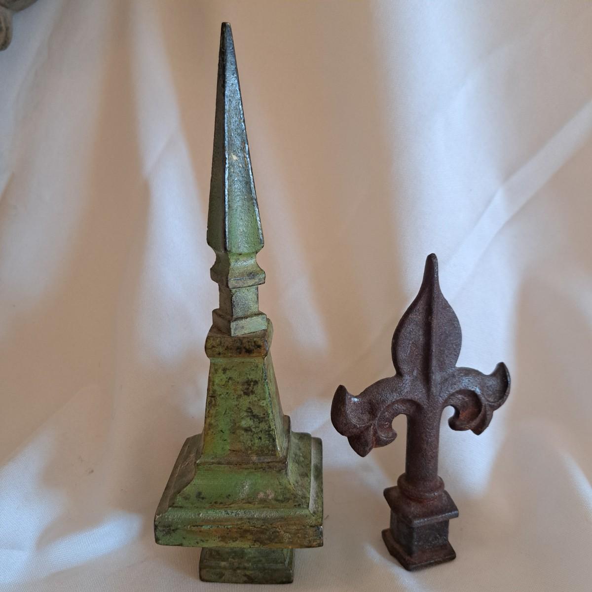 The four metal cast iron finals range from 5"H to 8"H, the largest having a verdegris finish. The ornate composite corbel wall shelf is 12" x 6" x 14"H and has a groove at top for holding a plate, artwork, etc. Also of note, the backside of knob at bottom of the corbel is cracked as shown though the damage cannot be seen when hanging on wall as shown. Shipping available. Shipping can be costly. We suggest contacting our preferred local shipping provider, Postage Express, with dimensions and getting an estimate before bidding: (828) 255-9250 or shipping@postageexpressnc.com.
