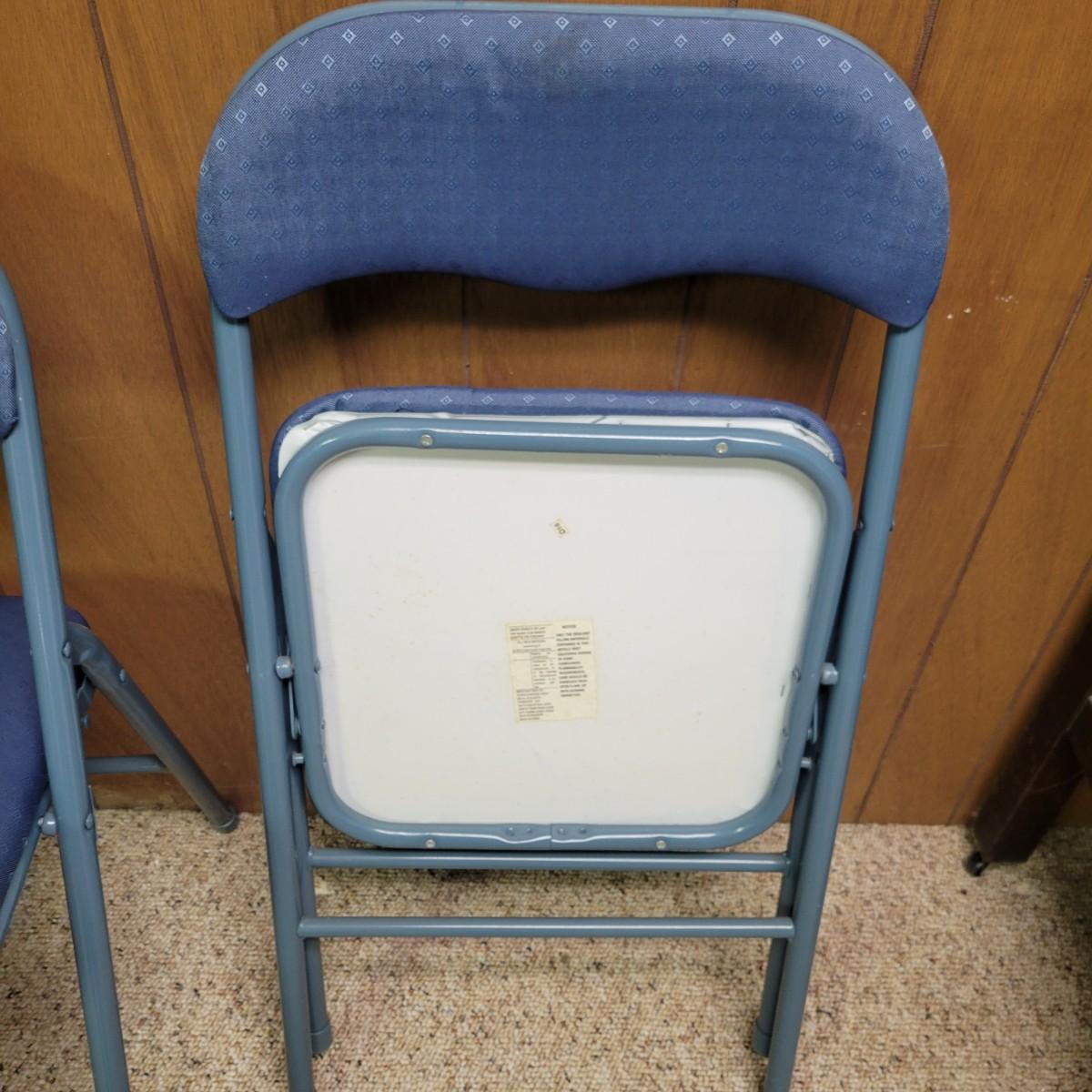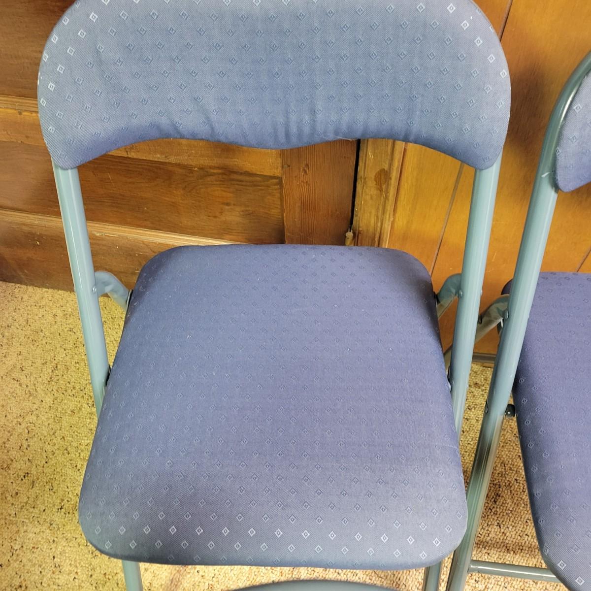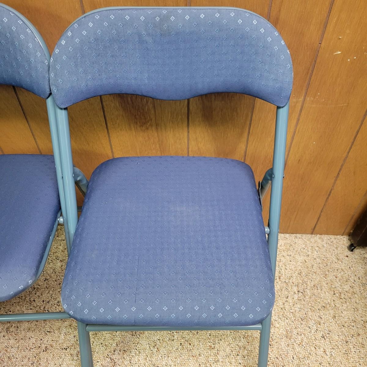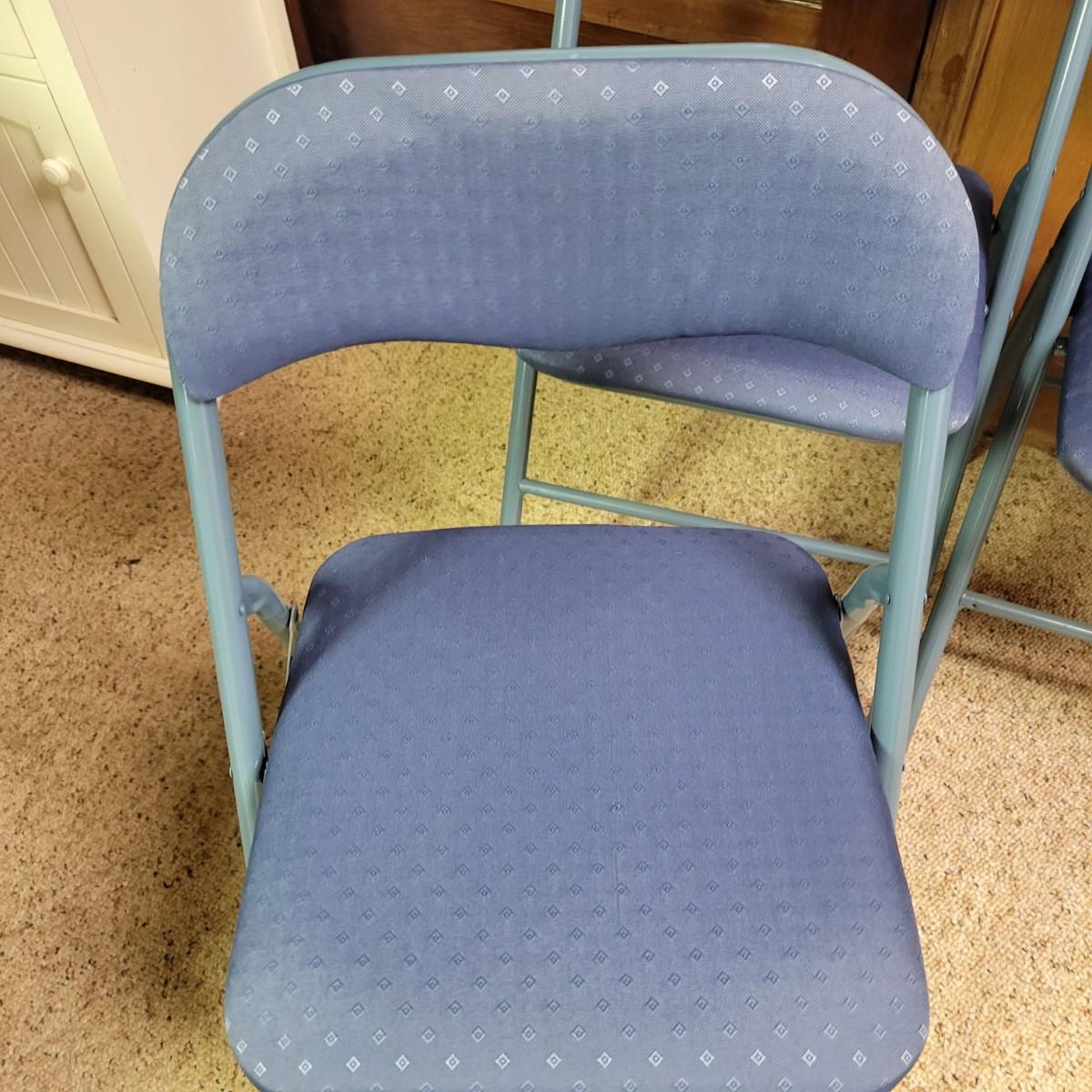 A set of four folding chairs in good condition with no notable damage. These folding chairs have padded seats and backs with a blue fabric. They measure approximately 17" x 15" x 30.5" with a seat height of 18.5". Local pickup only