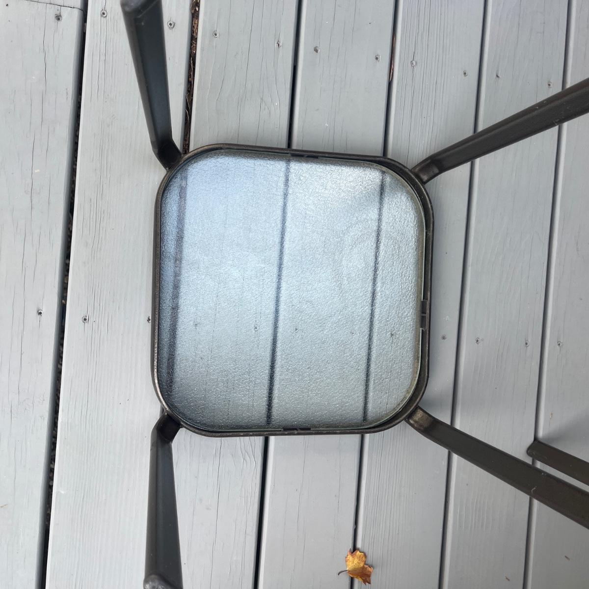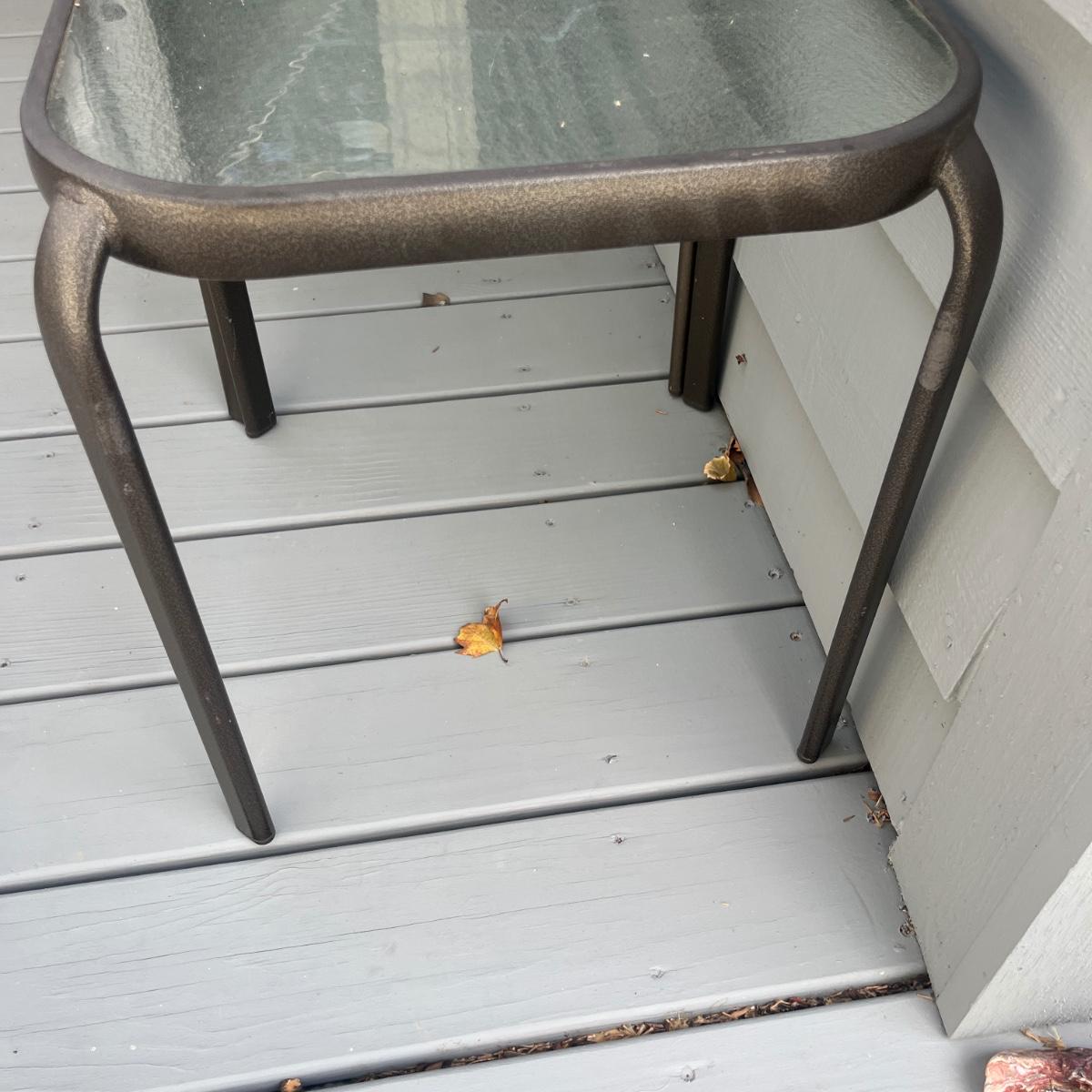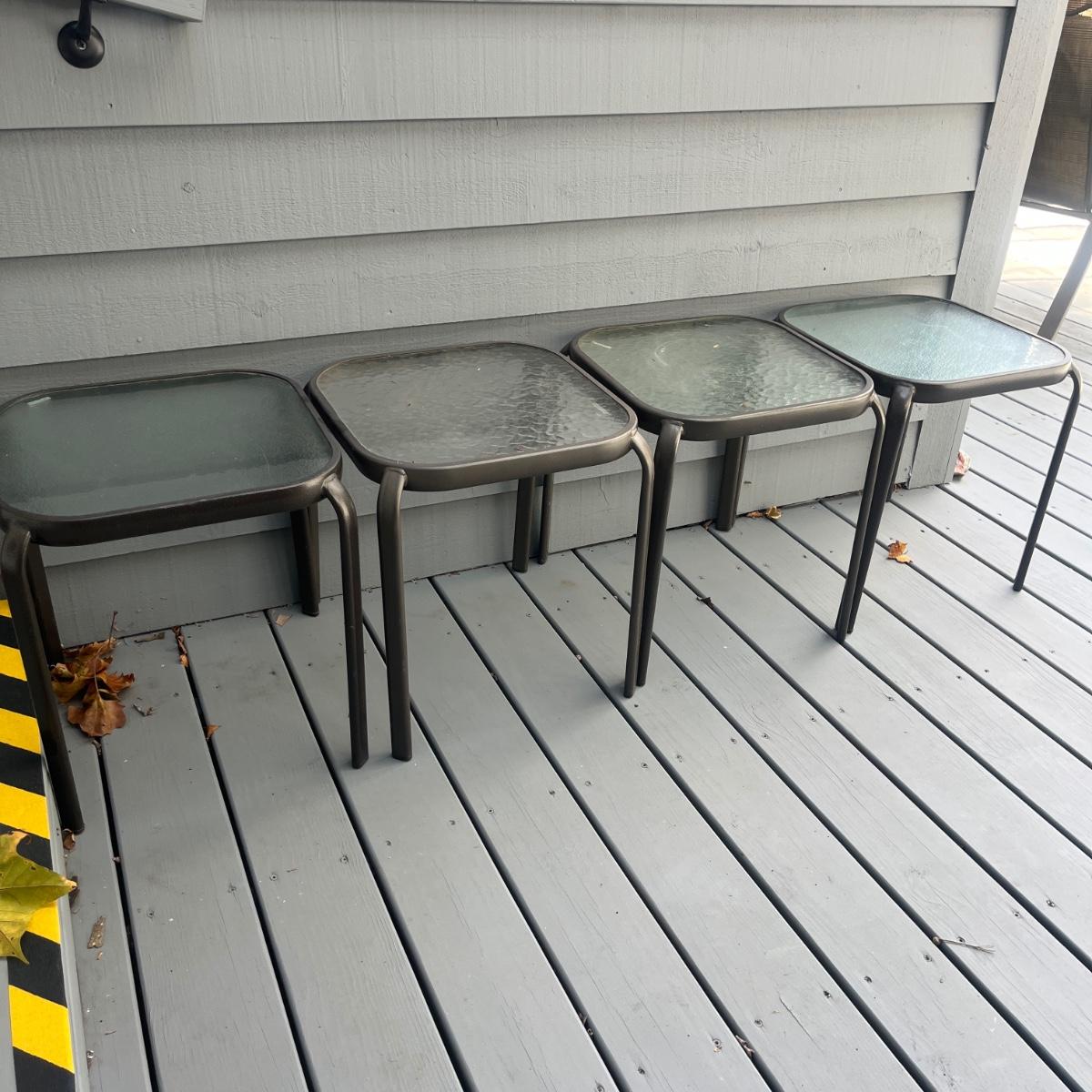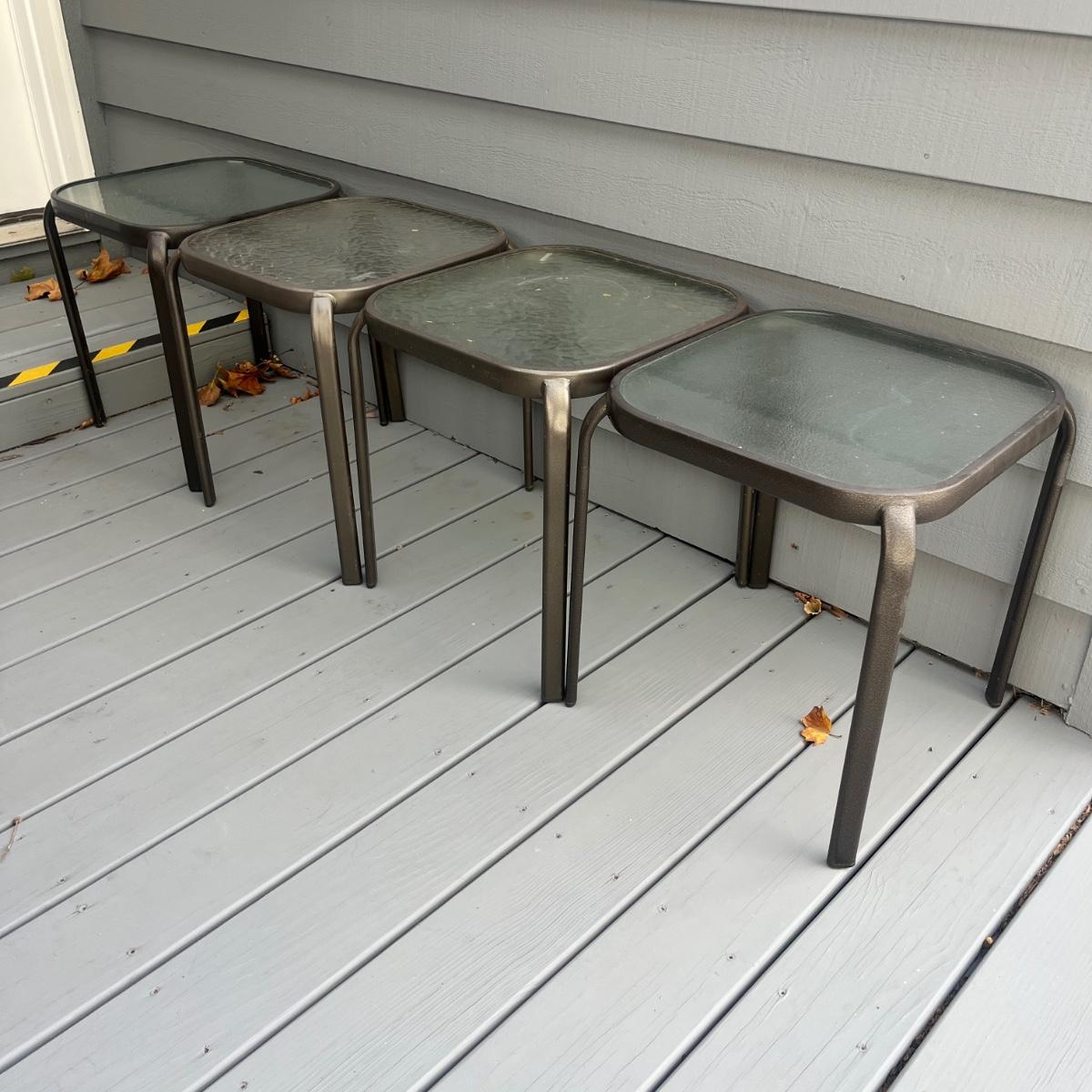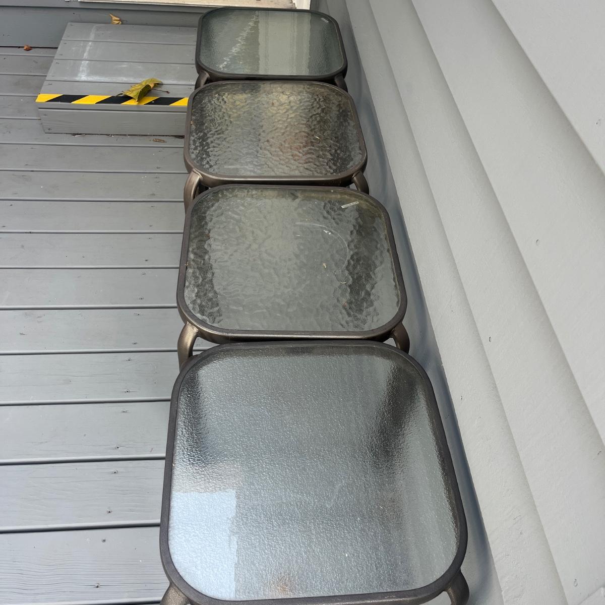 Lot includes four metal frame stacking tables with tempered glass tops. Amongst the four tables there are two styles of glass(one set of each style). Tables measure 15.5” x 15.5” x 17.5”H.