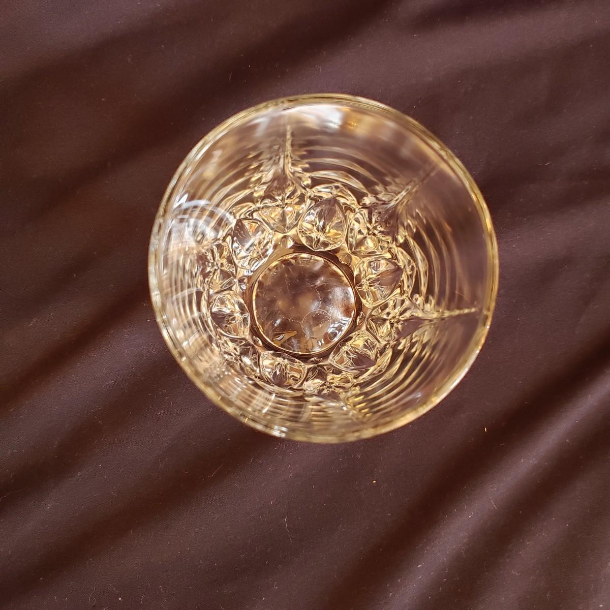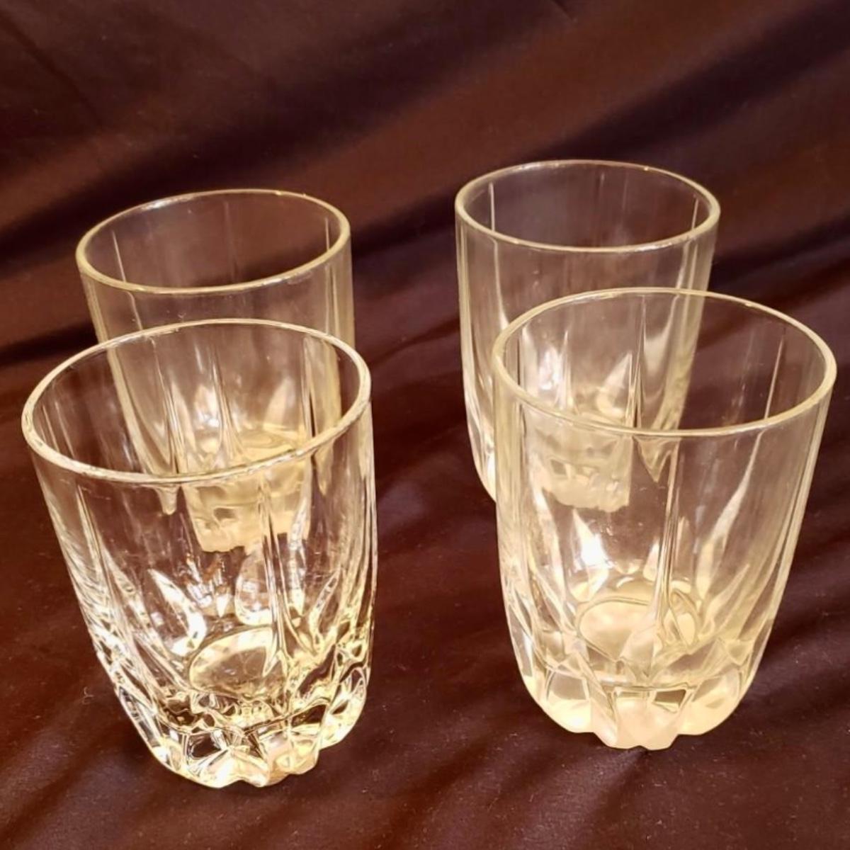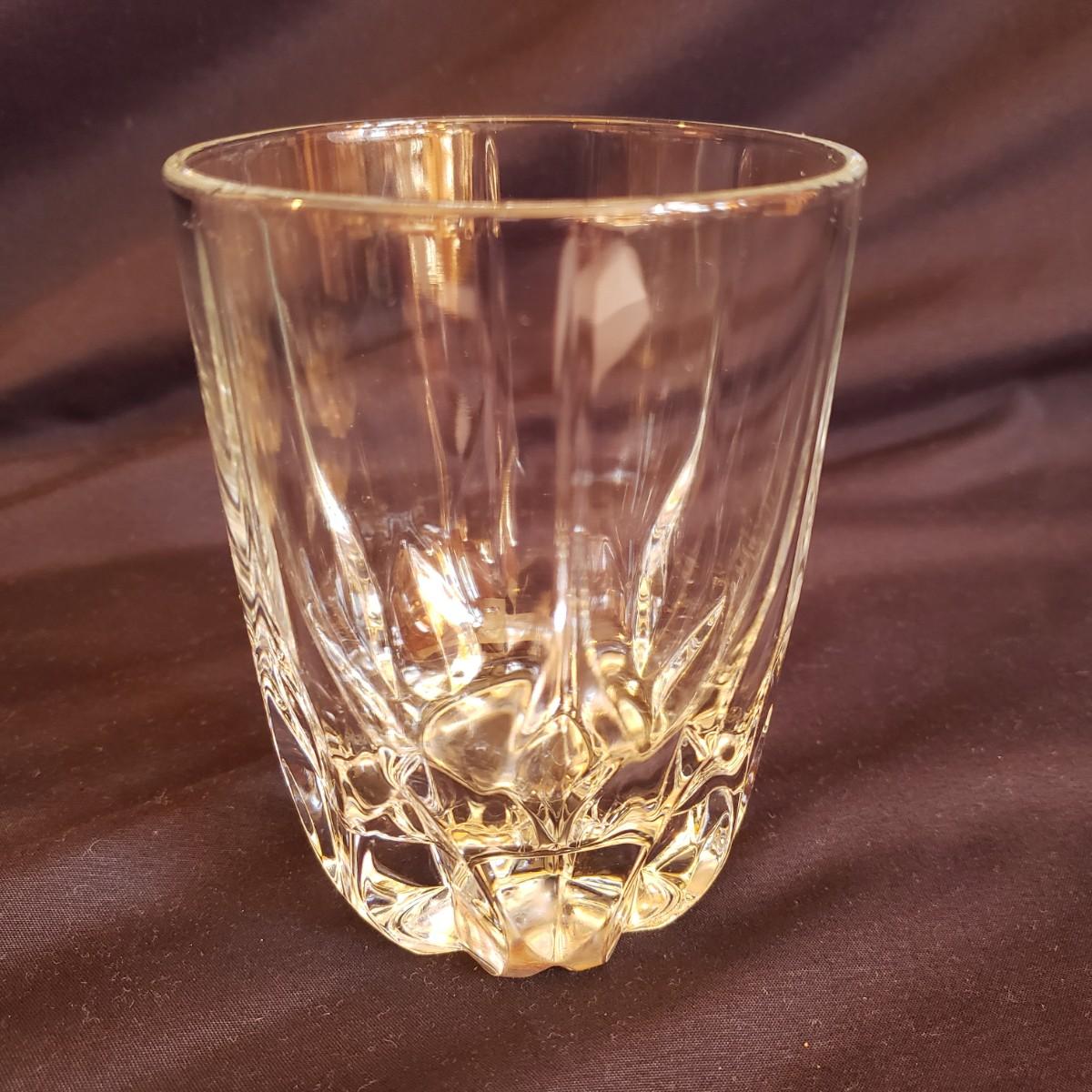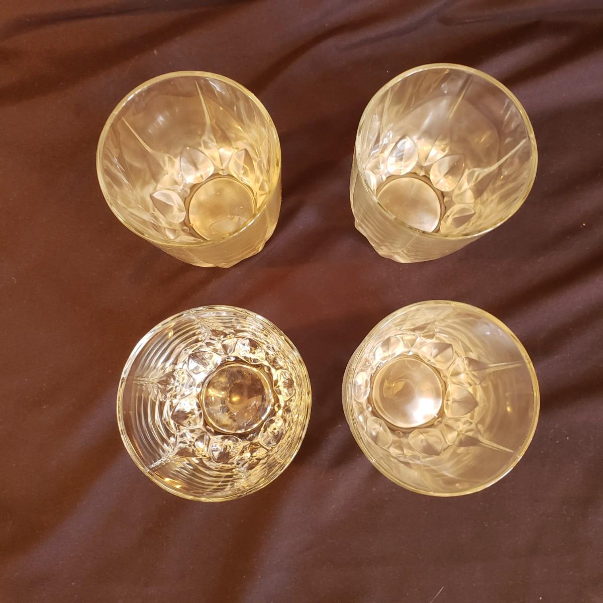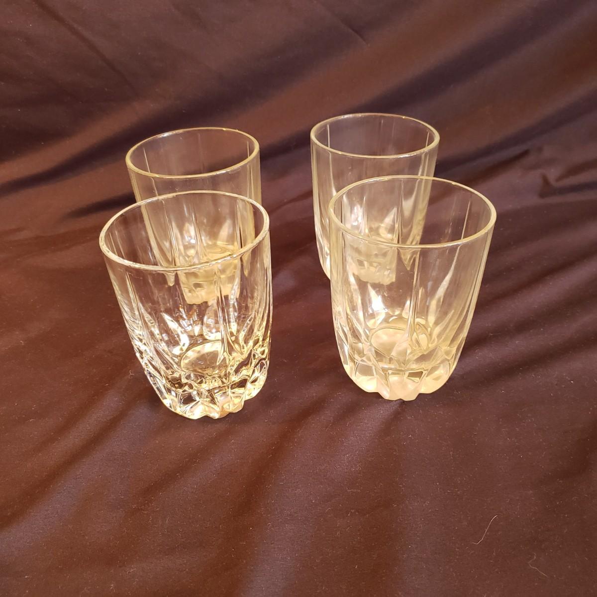 This lot features four what appears to be Mikasa Apollo Executive Double Old Fashion Glasses. Each glass measures approximately 3" x 4.5H. The glasses just need a good washing to sparkle!