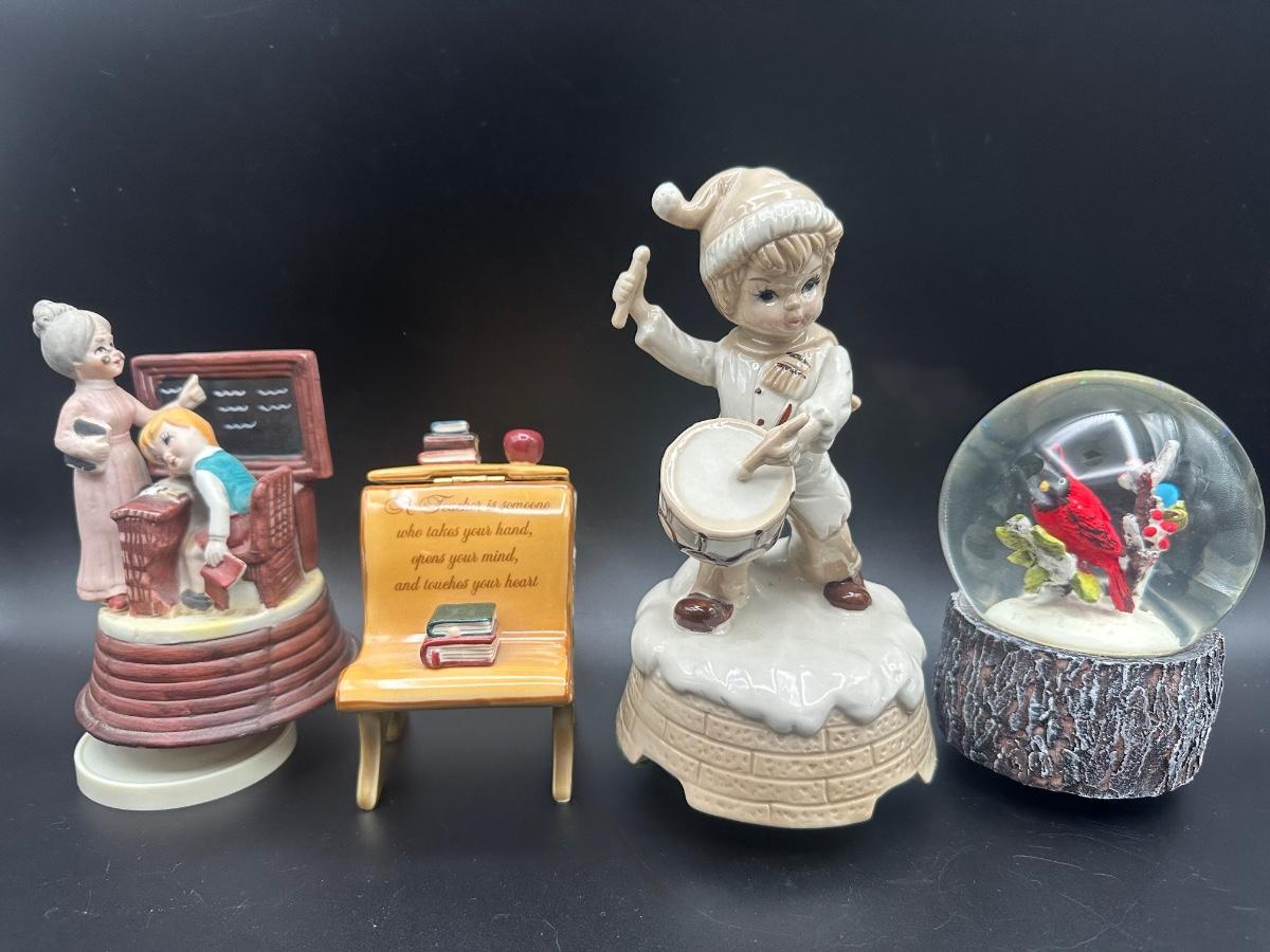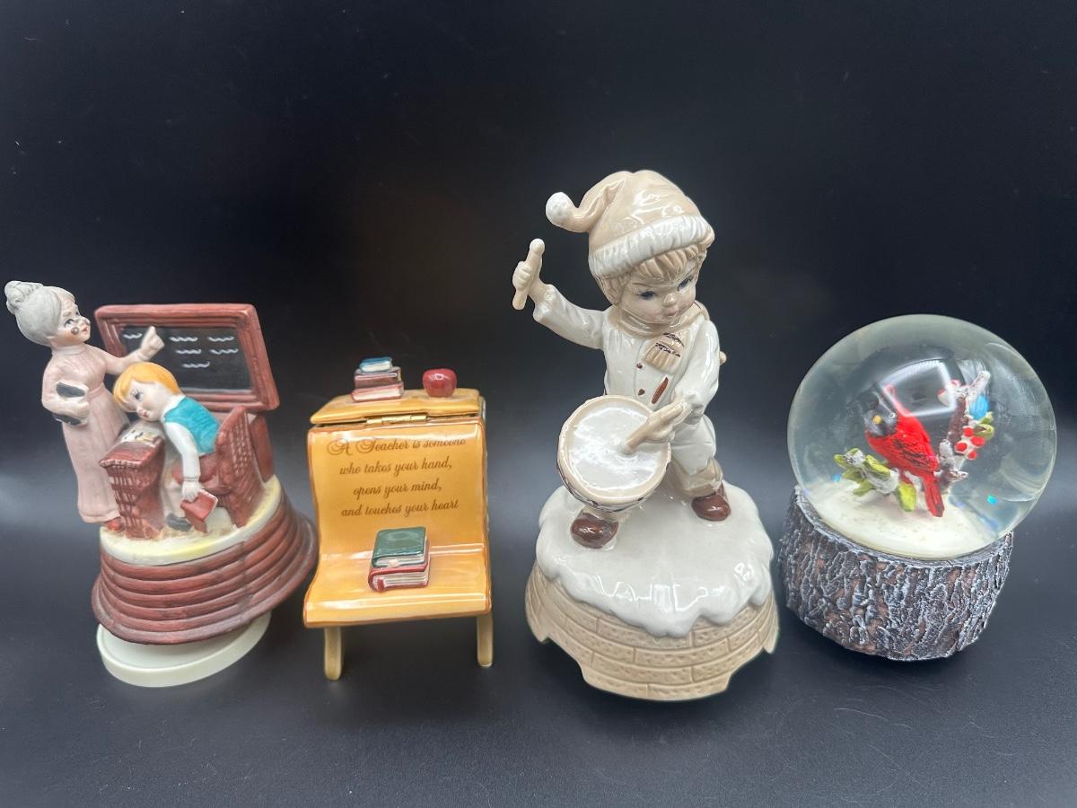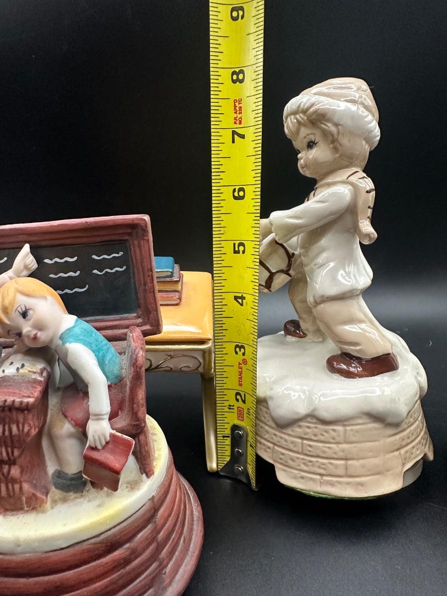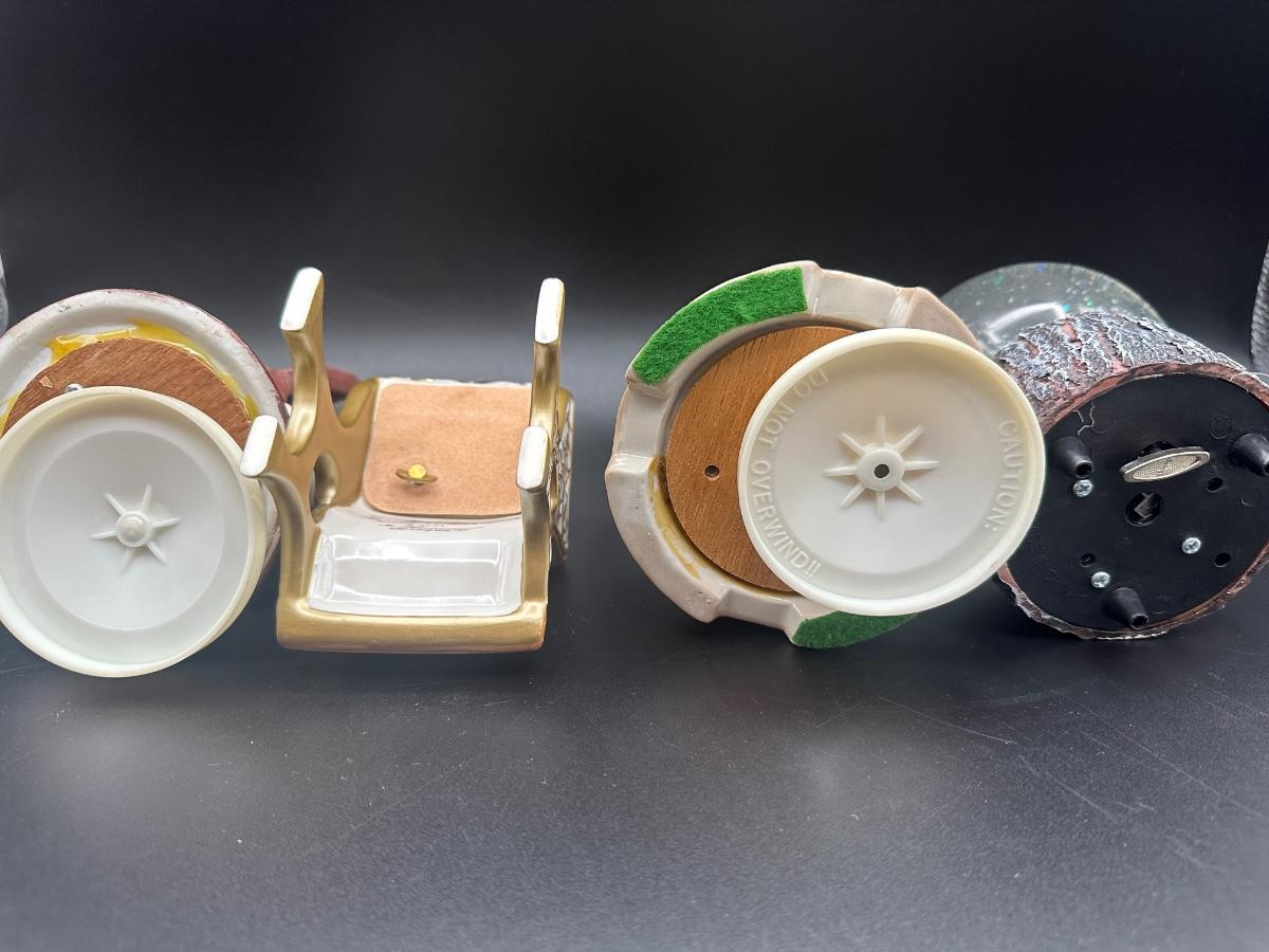 3 rotating music boxes and the piano is stand still and the back top lifts up and down to continue or stop the music.