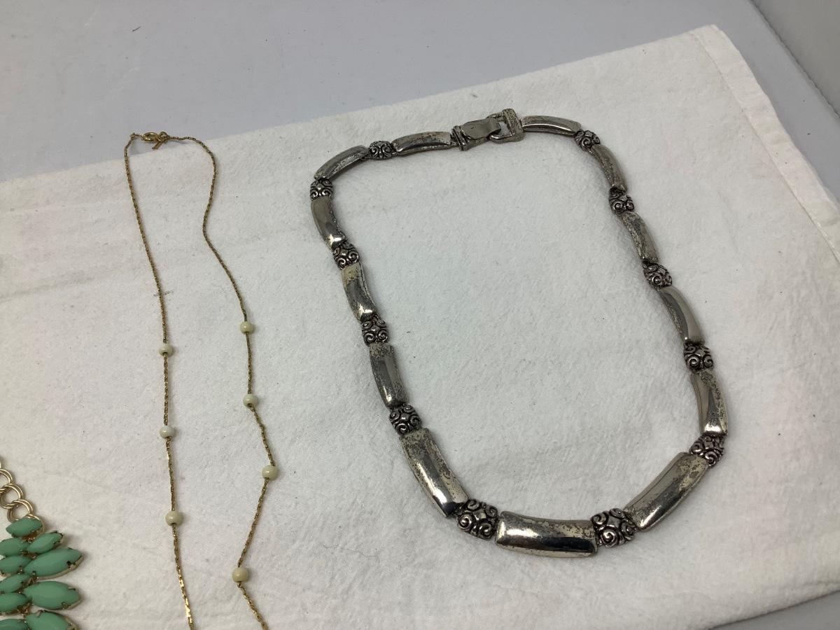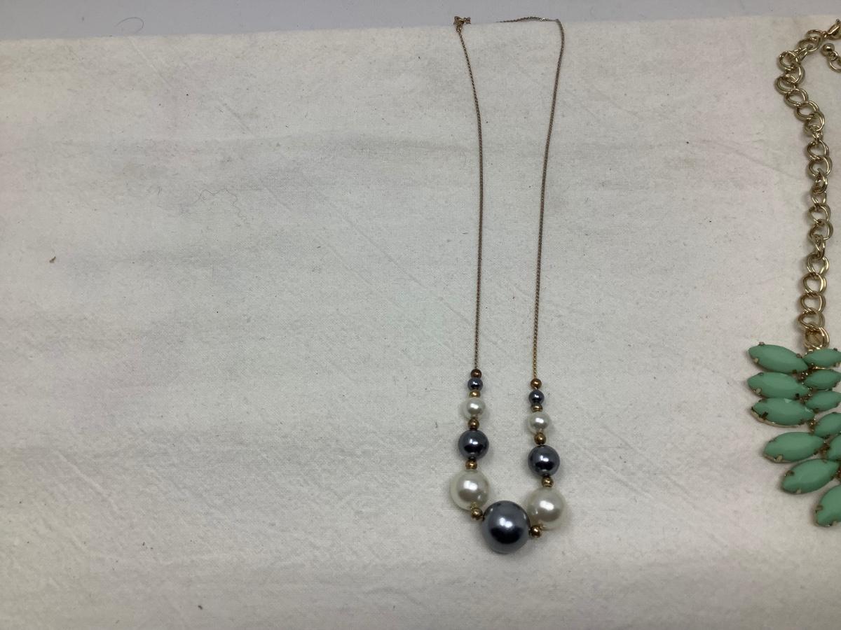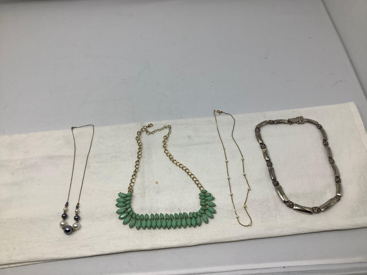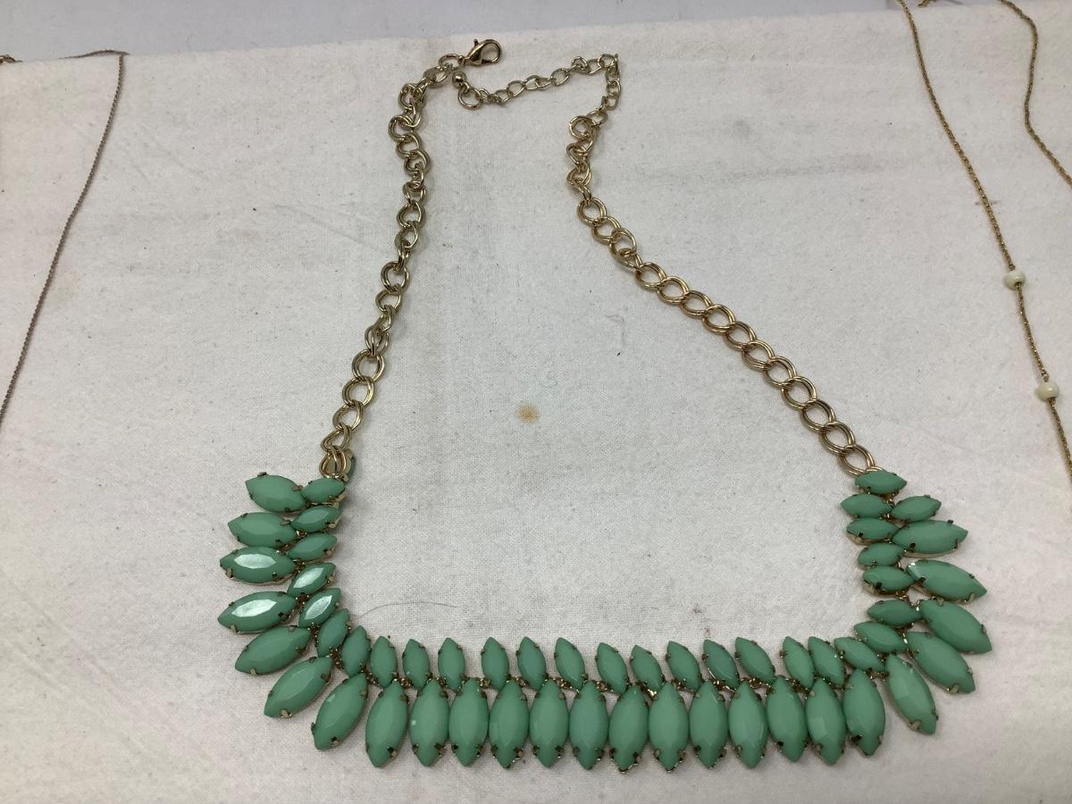 Beaded necklace, green plastic and metal choker, gold with white beads necklace and modern metal choker.