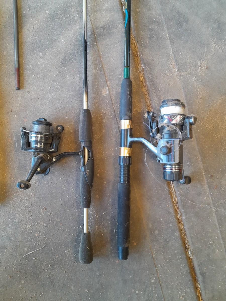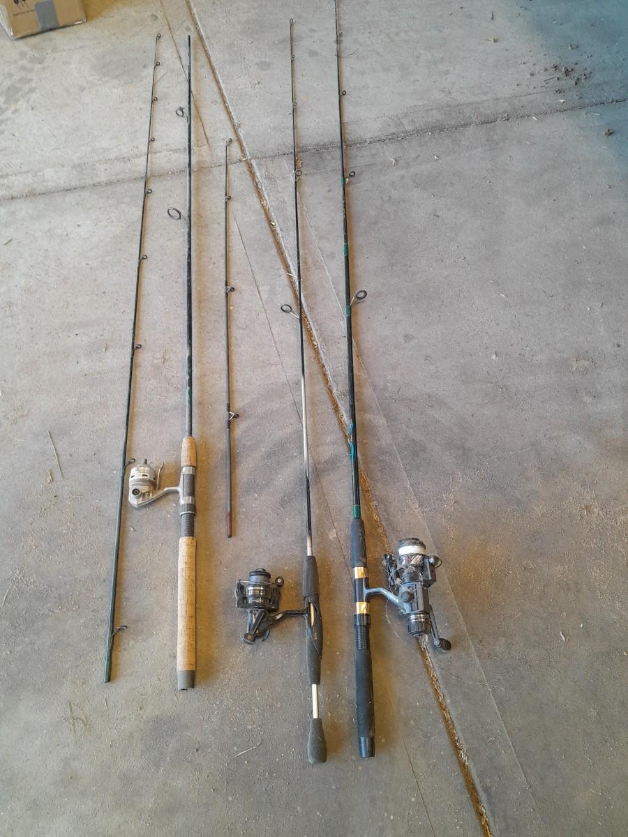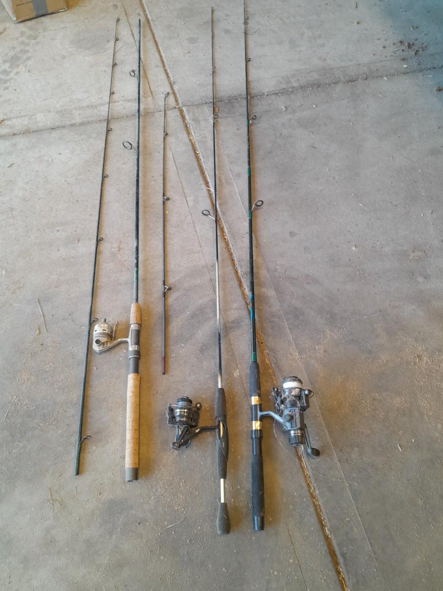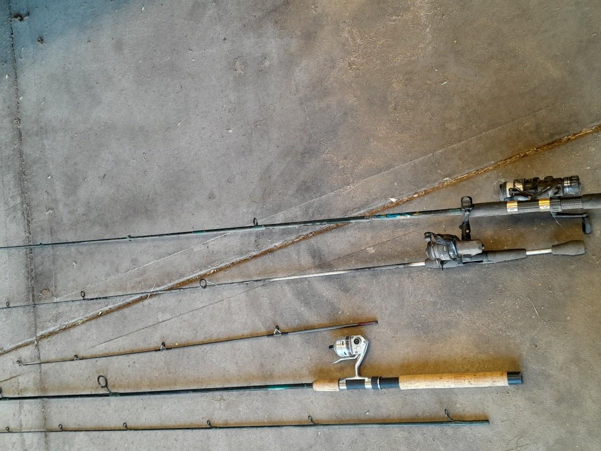 FOUR NICE FISHING POLES, THREE WITH REELS