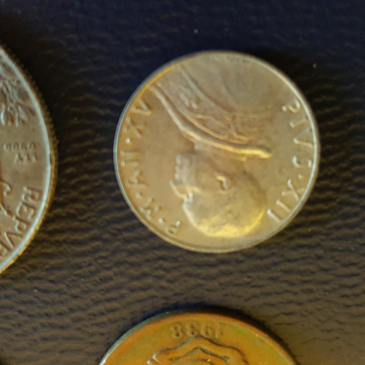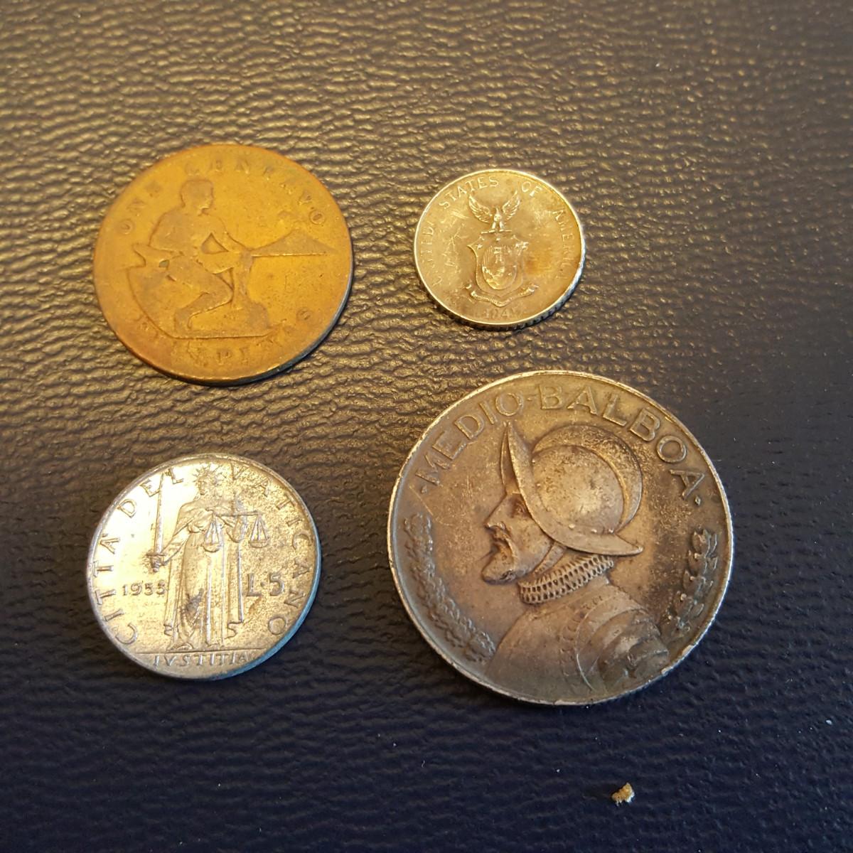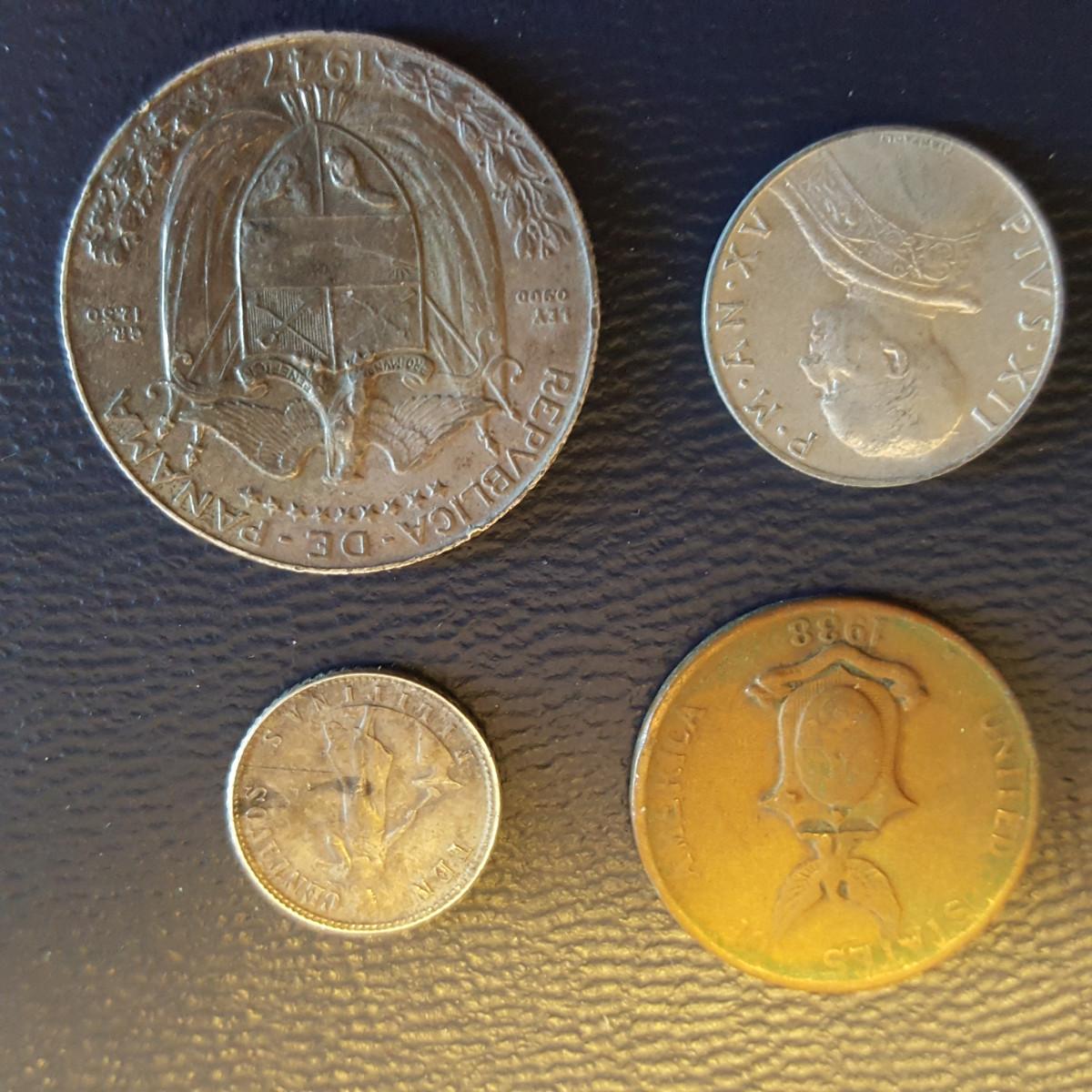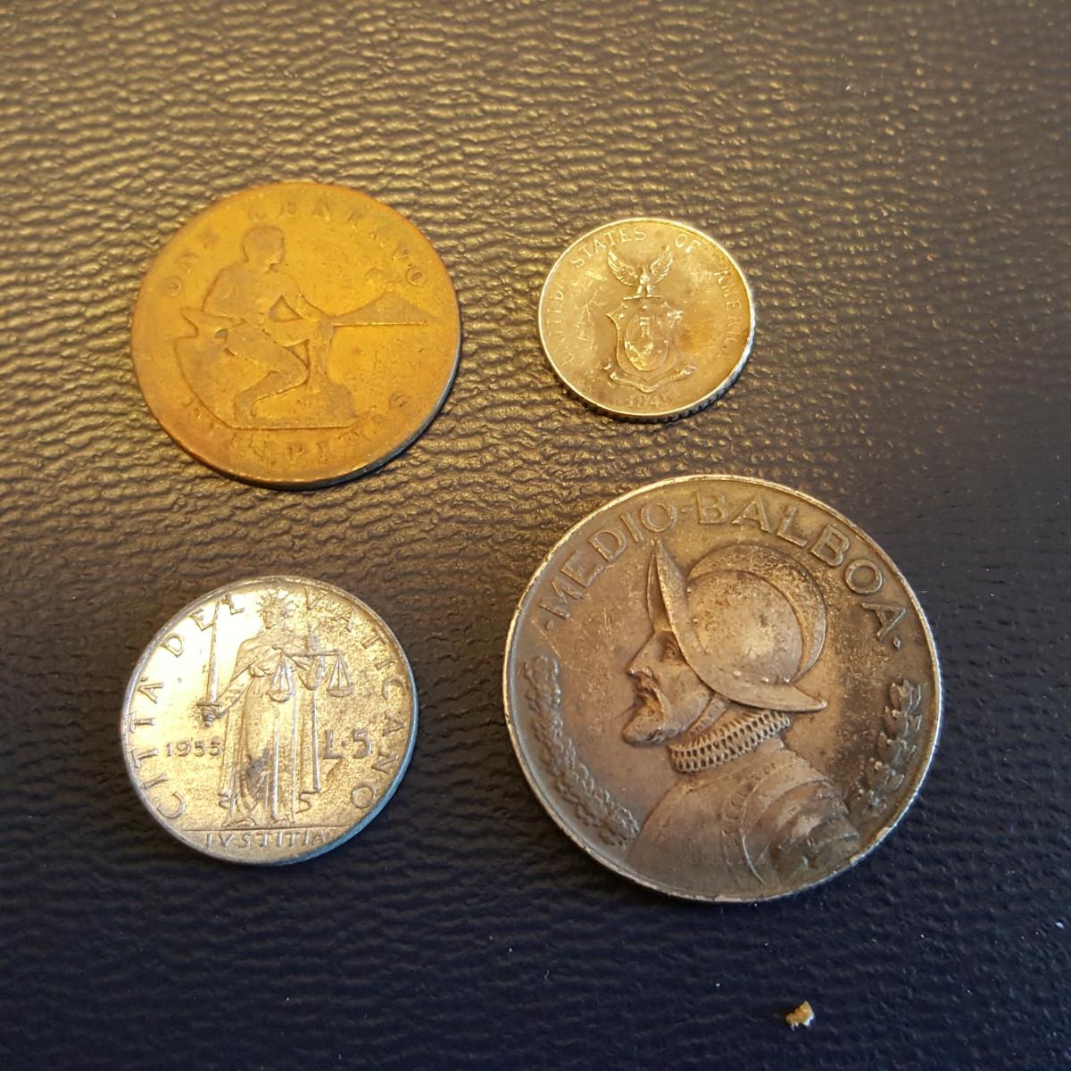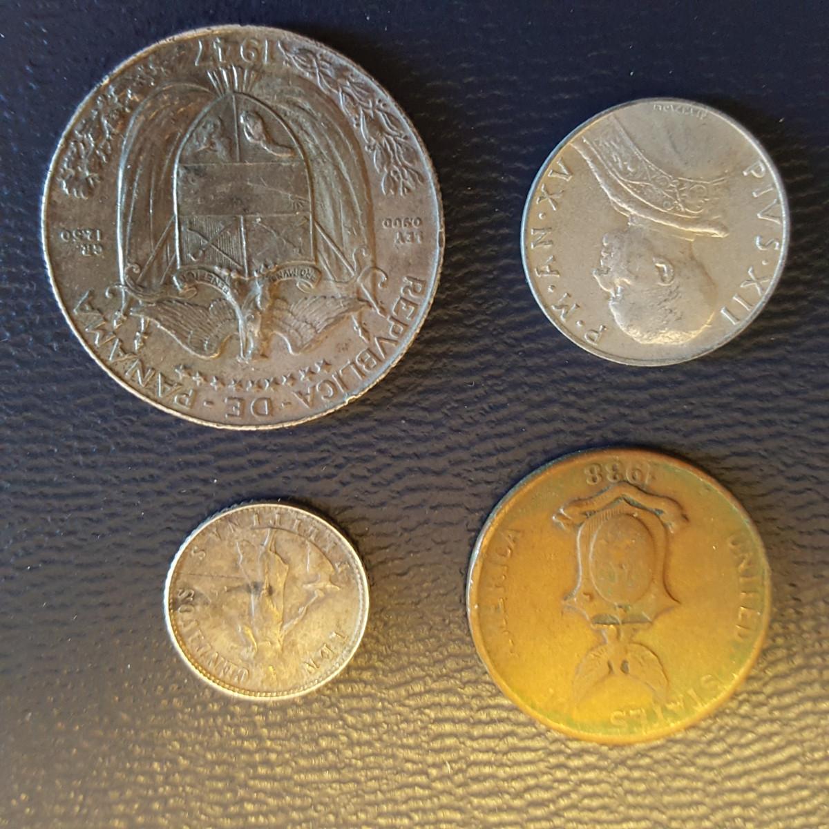 This auction lot is for Four Old Coins found in a box in a gentleman's dresser at a current estate clean out. The largest is a coin from Panama struck in 1947, The copper coin is dated 1938 and says United States on one side and one centavos Filipinas on the other - as does the smallest coin except it says ten centavos. The final coin is from the Vatican and is dated 1955 with the imagine of Pope Pius XII