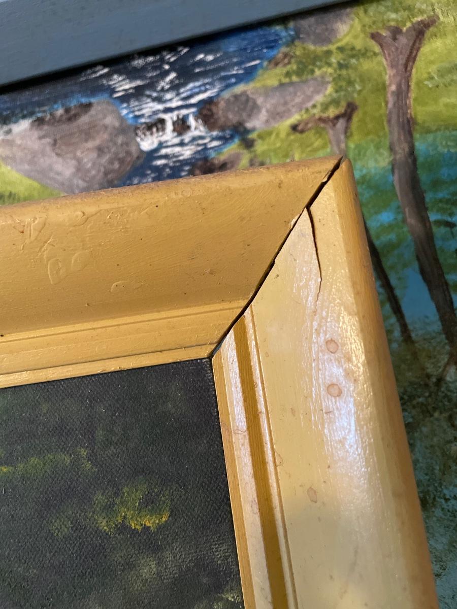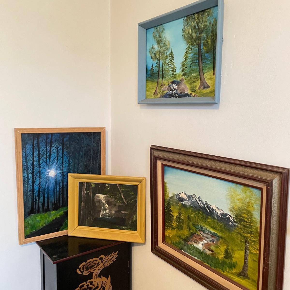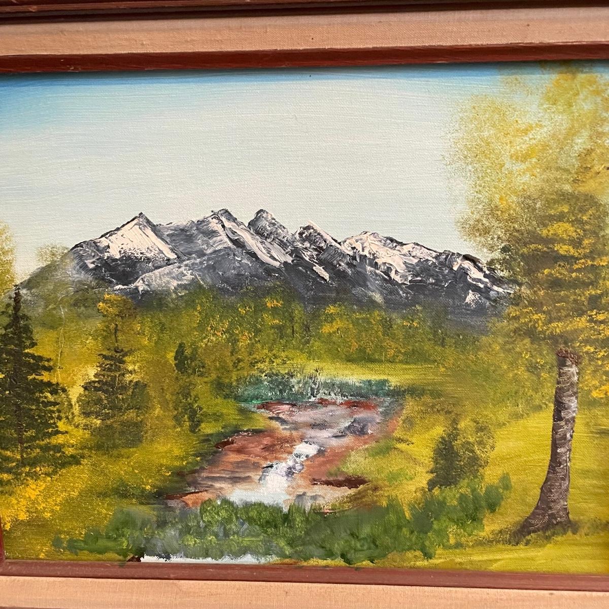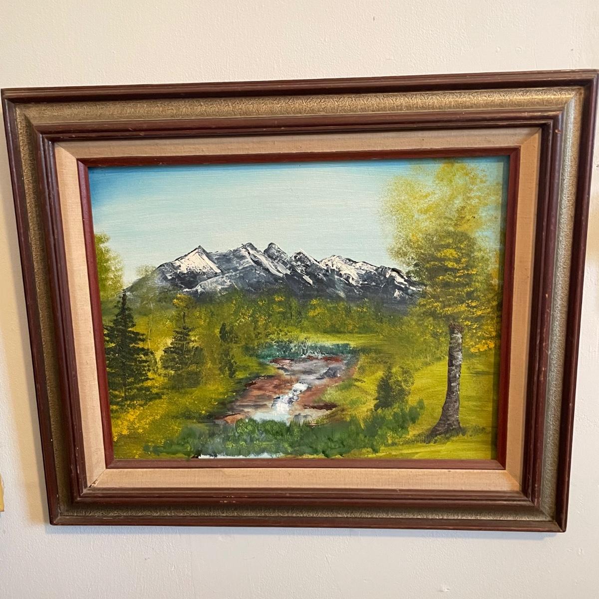 Four various mountain scenes with vibrant colors. Each appears to be an original oil painting with a unique frame. The smallest frame is the mustard color and it’s in need of a rack or wire to hang. It measures approximately 15” x 12”. The largest frame has art with mountains in the background and measures approximately 23.25” x 19.25”. All frames are wooden and some have blemishes. See images. Local pick up only.