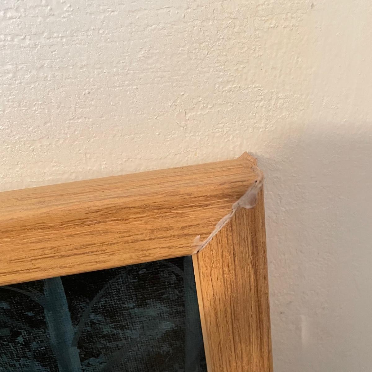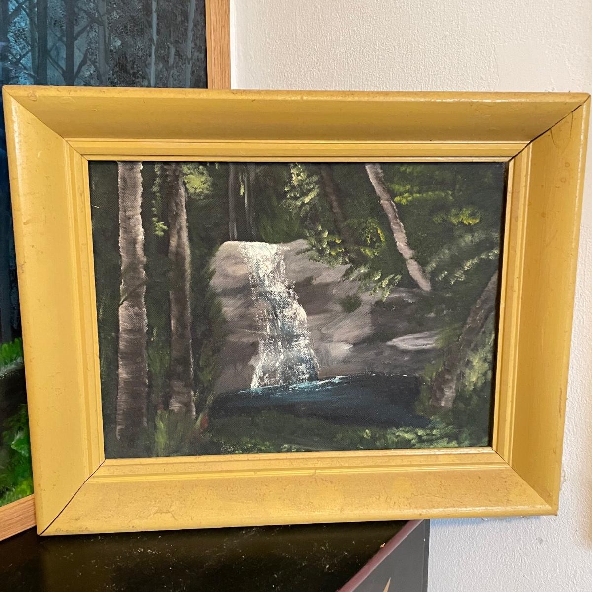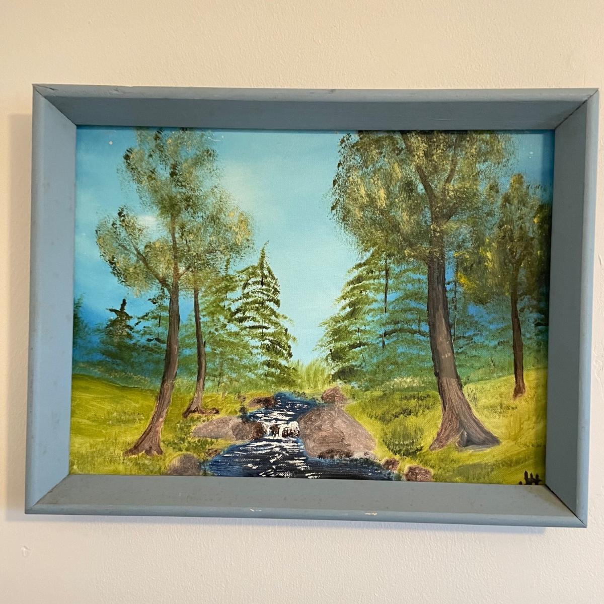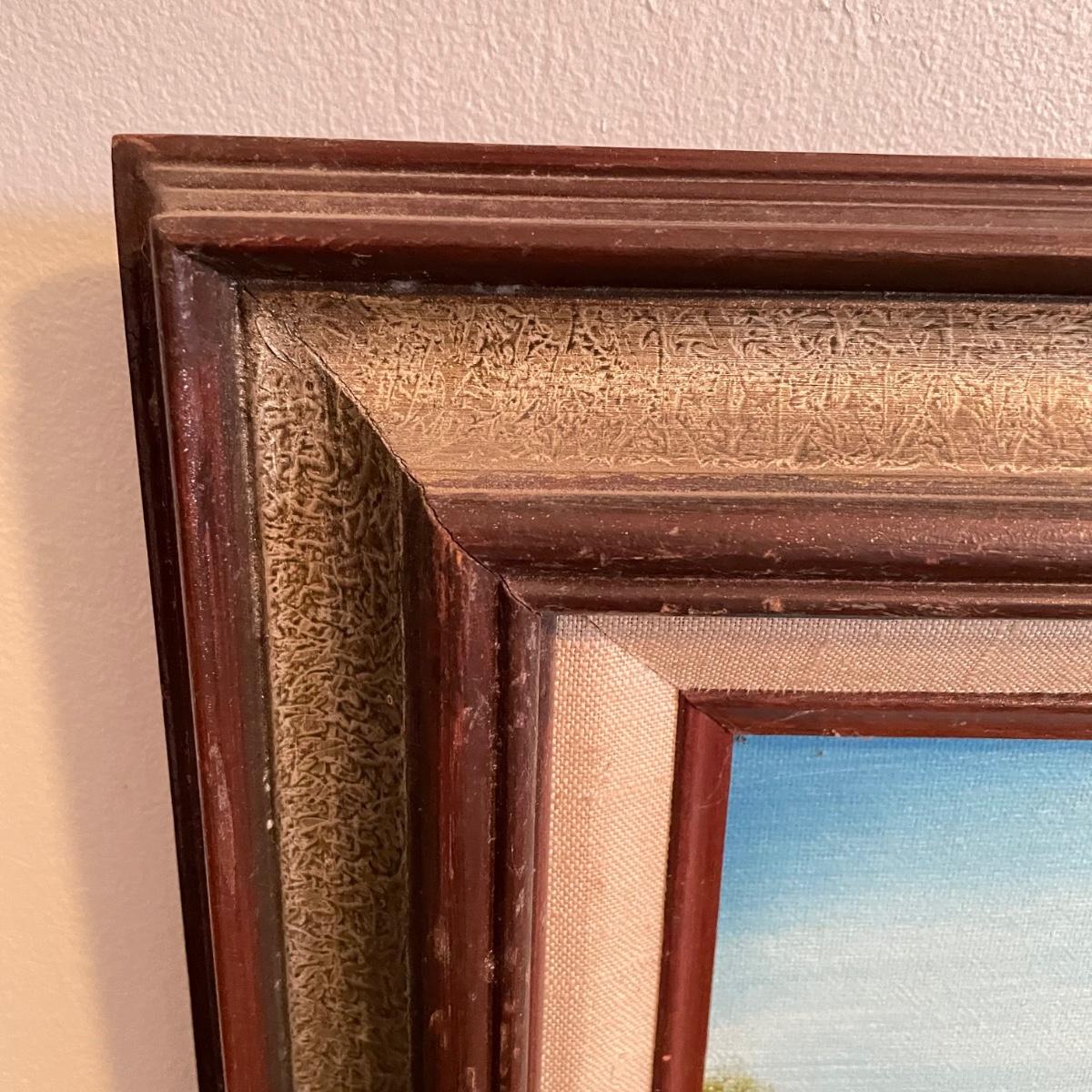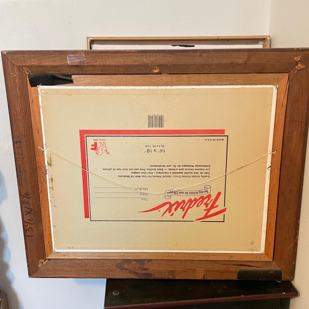 Four various mountain scenes with vibrant colors. Each appears to be an original oil painting with a unique frame. The smallest frame is the mustard color and it’s in need of a rack or wire to hang. It measures approximately 15” x 12”. The largest frame has art with mountains in the background and measures approximately 23.25” x 19.25”. All frames are wooden and some have blemishes. See images. Local pick up only.
