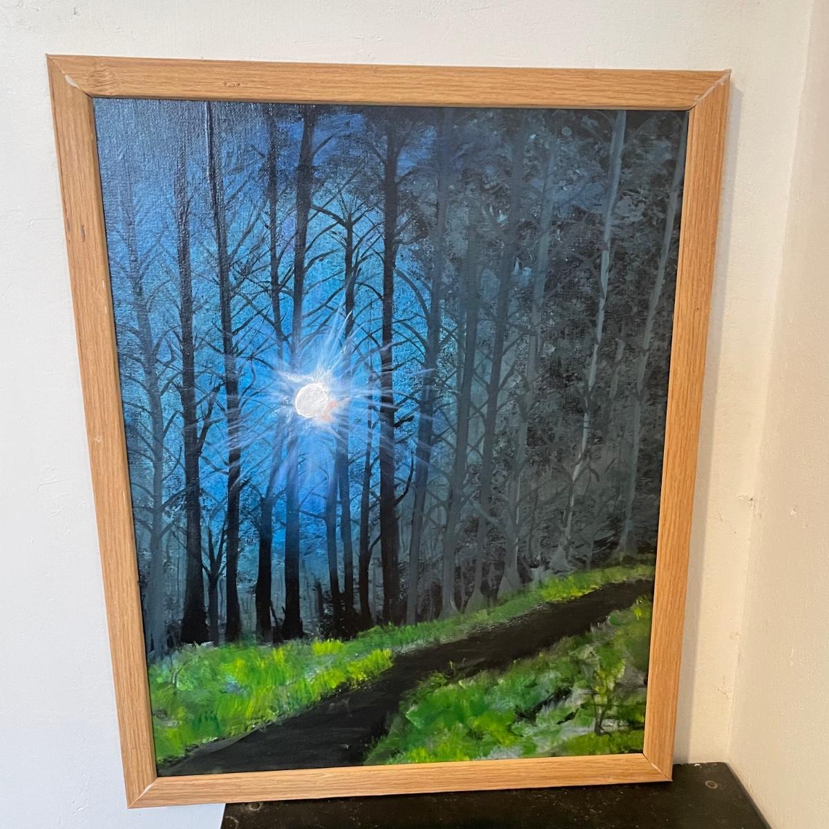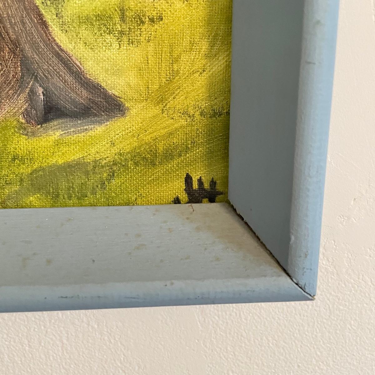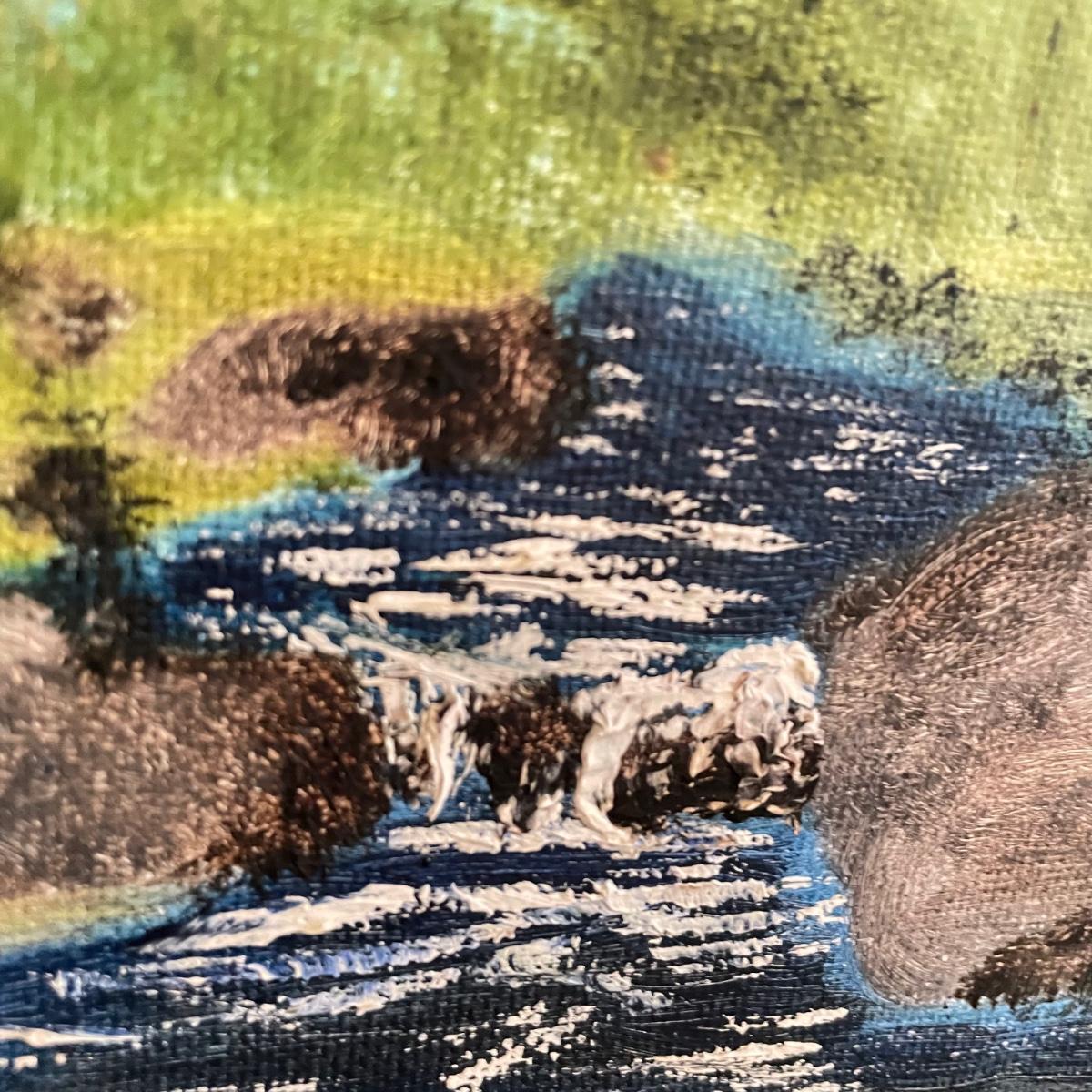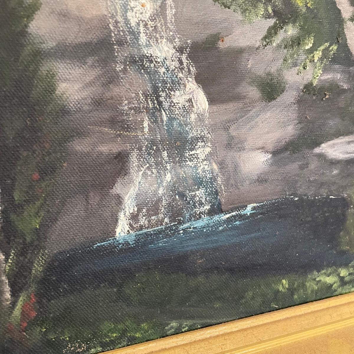 Four various mountain scenes with vibrant colors. Each appears to be an original oil painting with a unique frame. The smallest frame is the mustard color and it’s in need of a rack or wire to hang. It measures approximately 15” x 12”. The largest frame has art with mountains in the background and measures approximately 23.25” x 19.25”. All frames are wooden and some have blemishes. See images. Local pick up only.