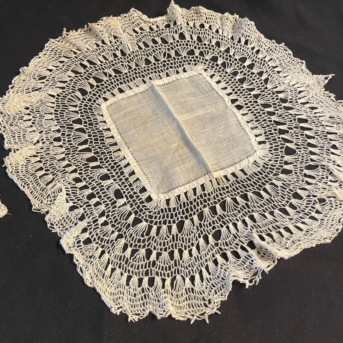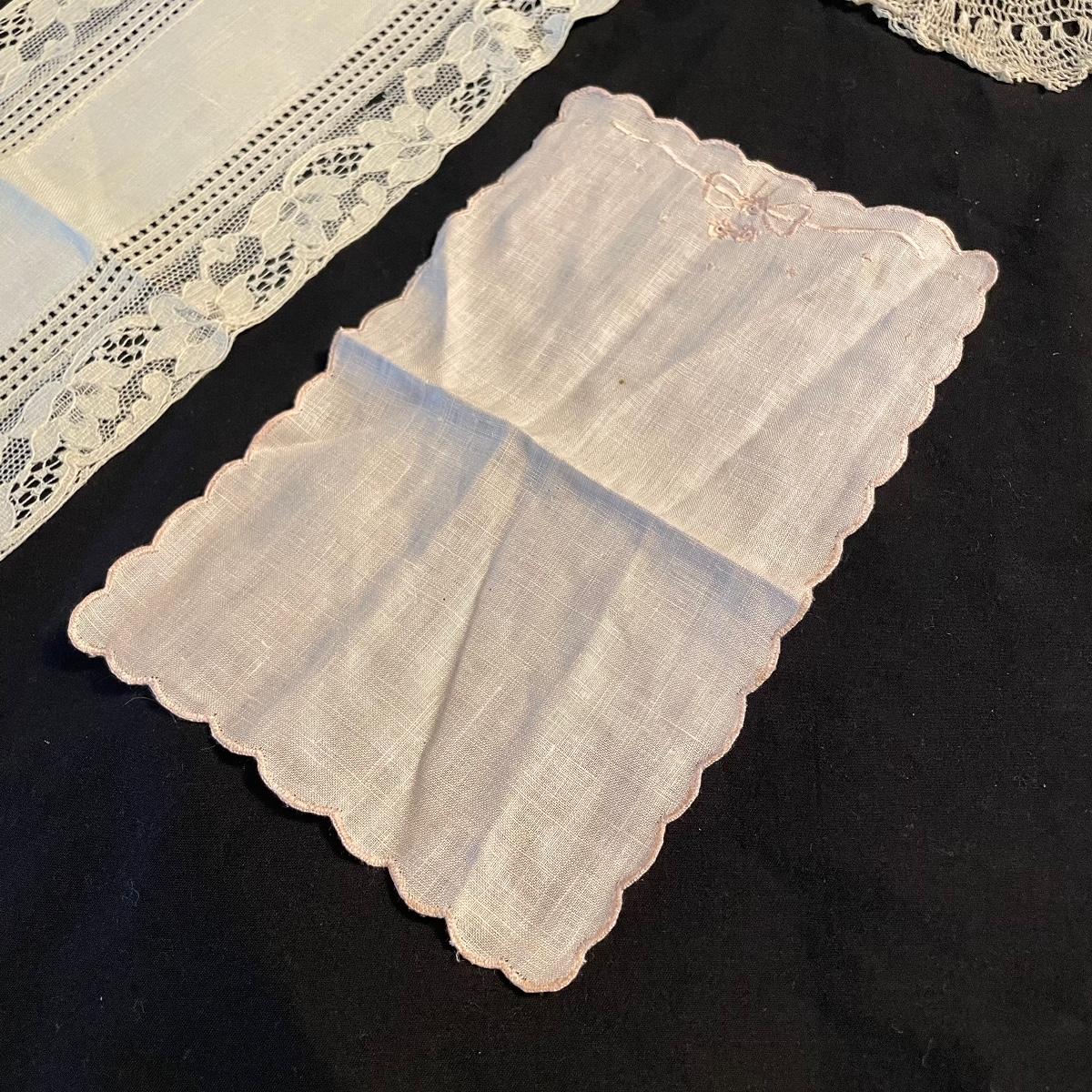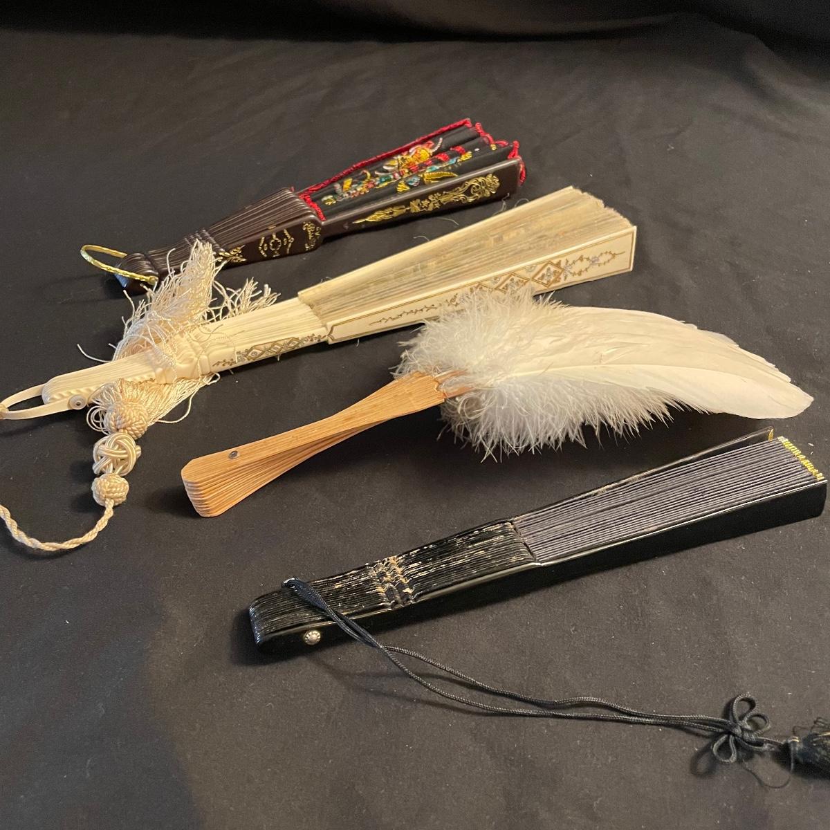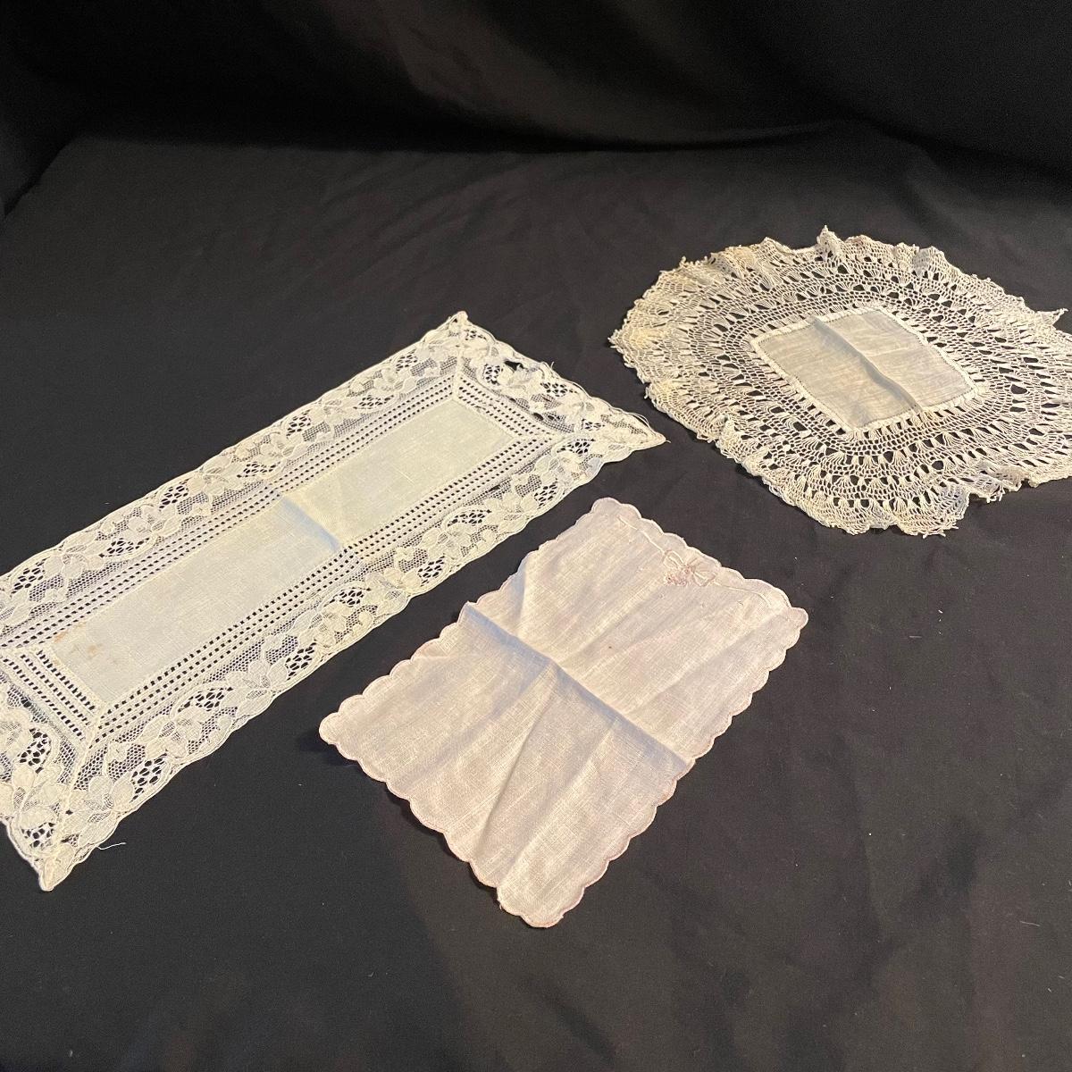 Take a closer look at these four antique handheld fans, they are each so different yet equally gorgeous! The larger fan has a rip shown in images; this fan measures 11” tall x 21” wide. We have thrown in a mix of three antique linens.