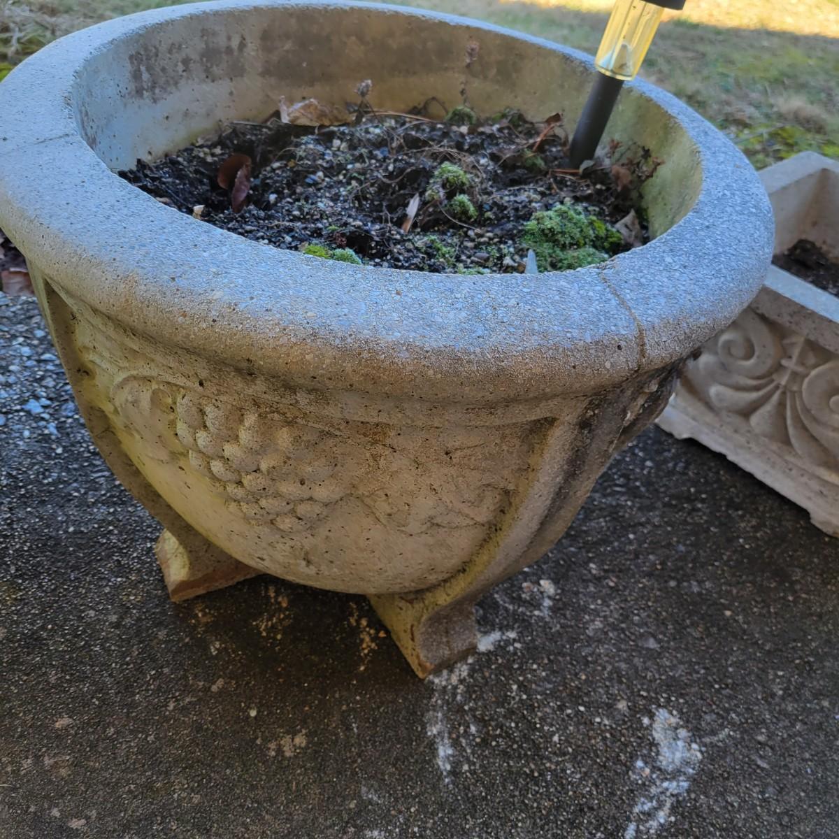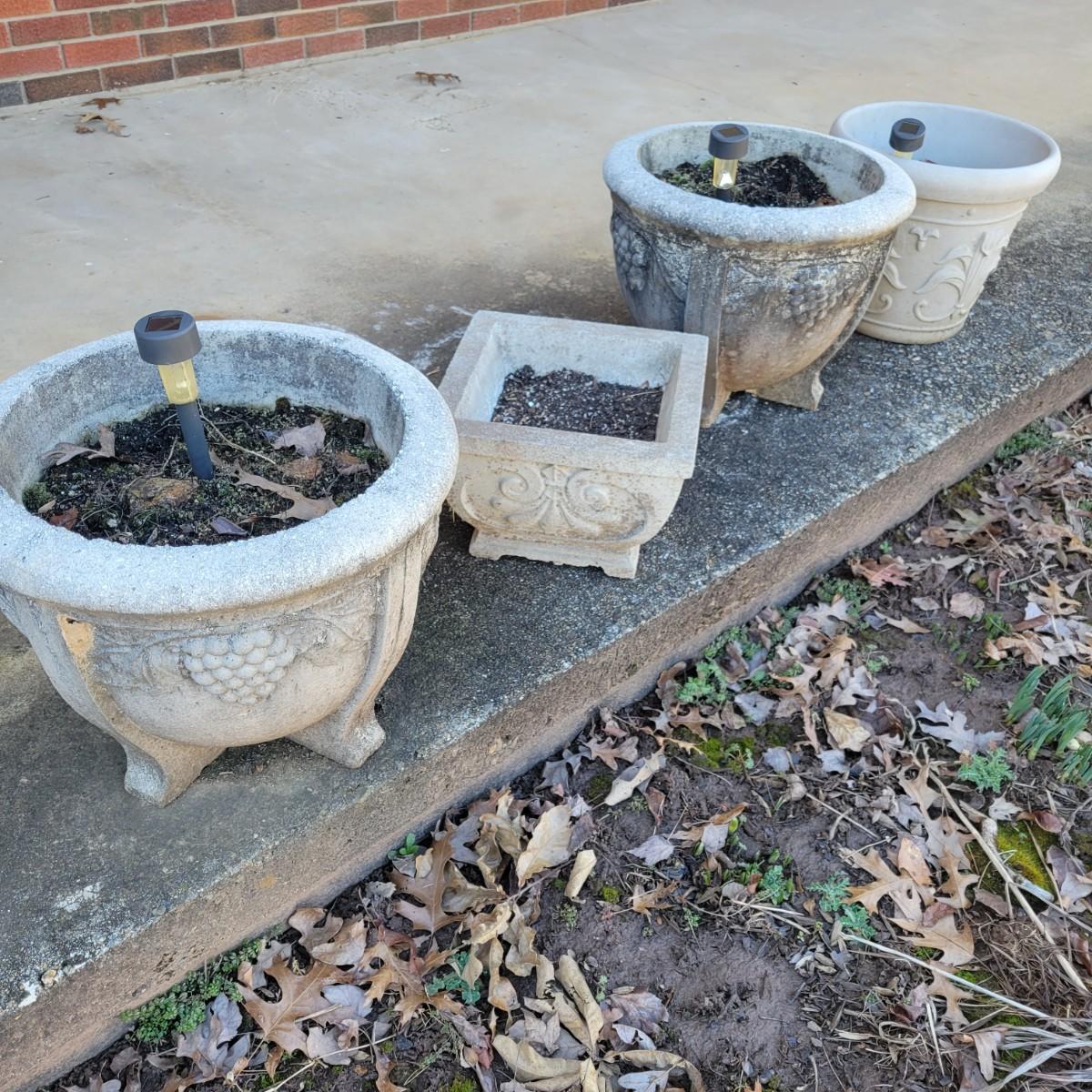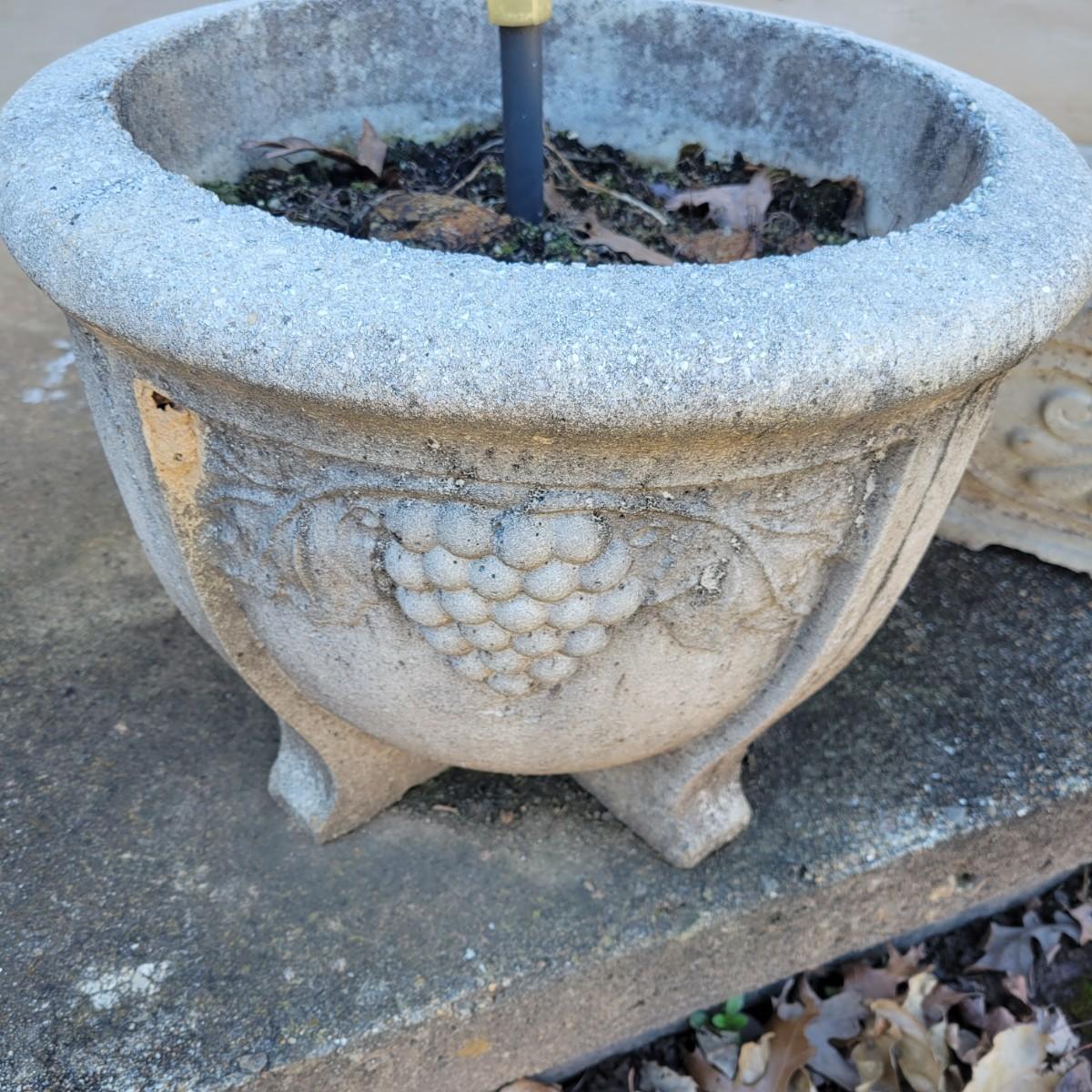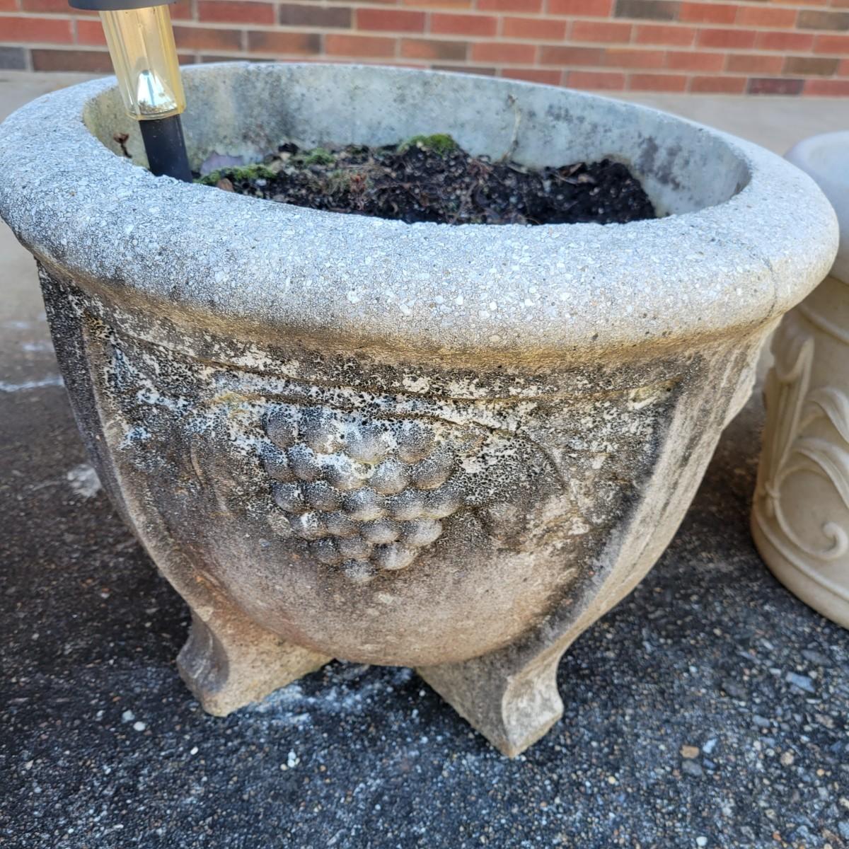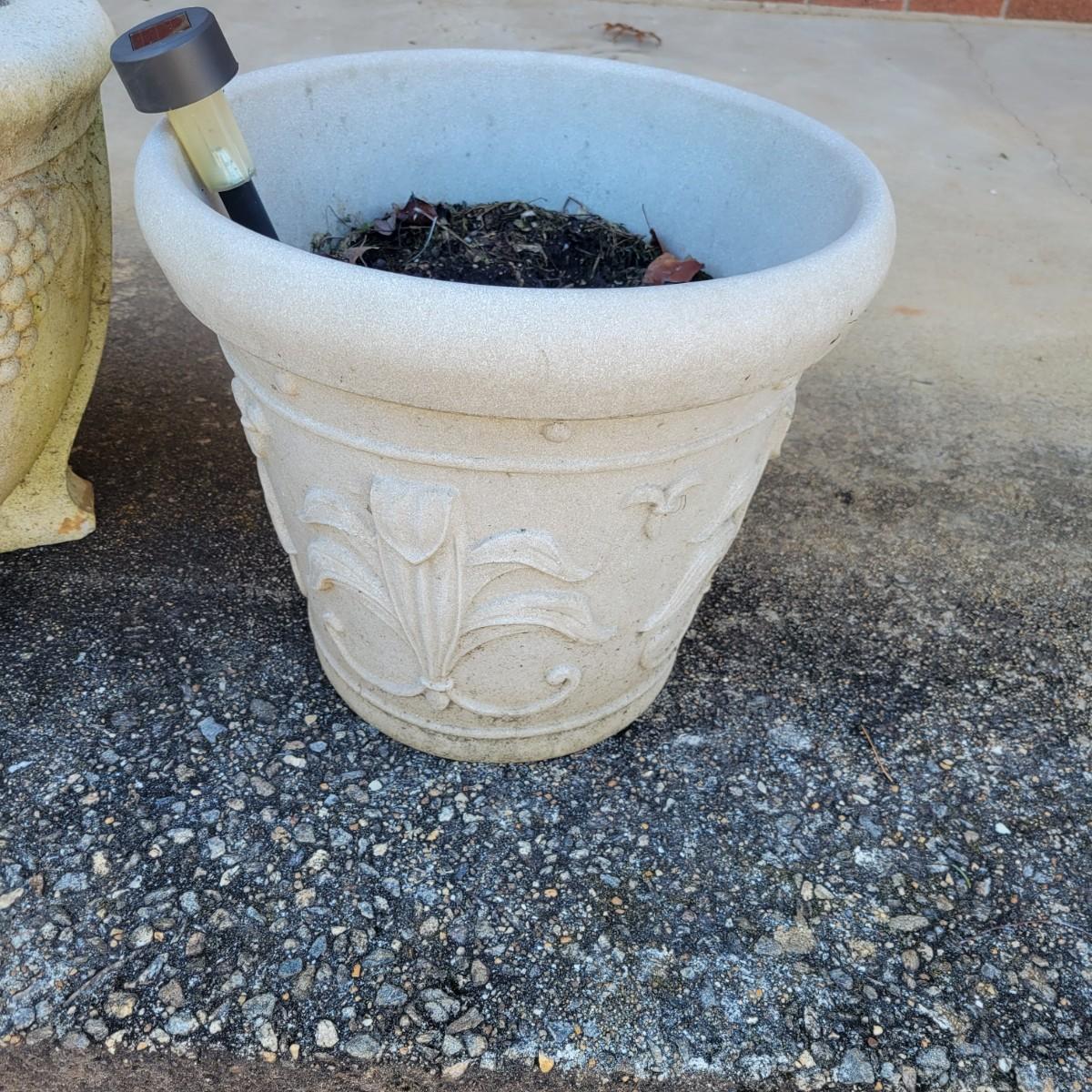 An assortment of four outdoor planters in good condition with no notable damage. Included are three concrete planters and one that is plastic. The two largest matching planters are made of concrete and measure approximately 19"D x 15"H. The smaller square planter is also made of concrete. The remaining round planter is made of plastic. Lot includes three solar lights that have not been tested. Local pickup only. Winning bidder must bring assistance to help move and load this item due to its weight and/or size.