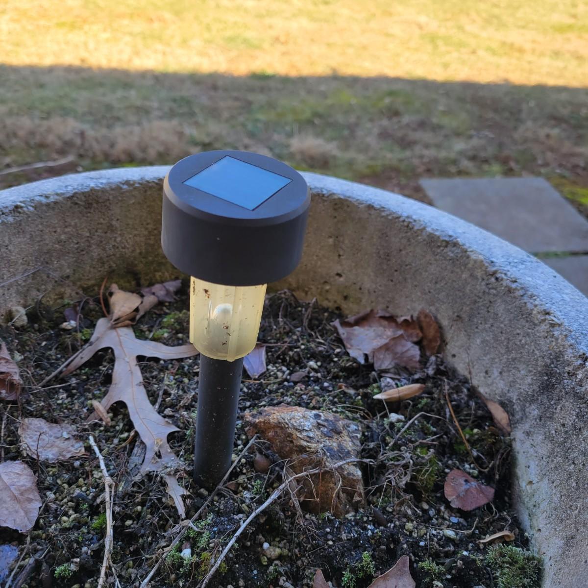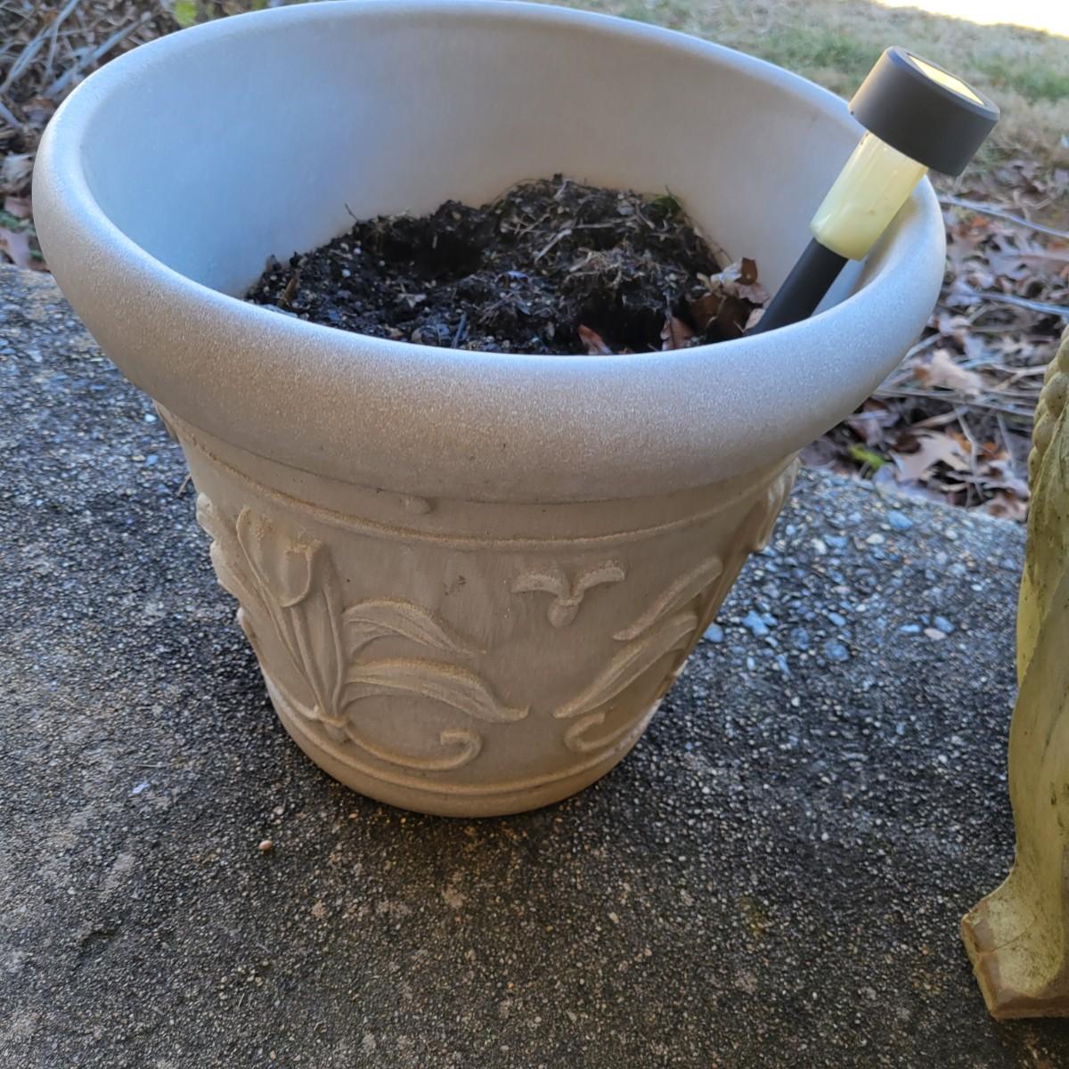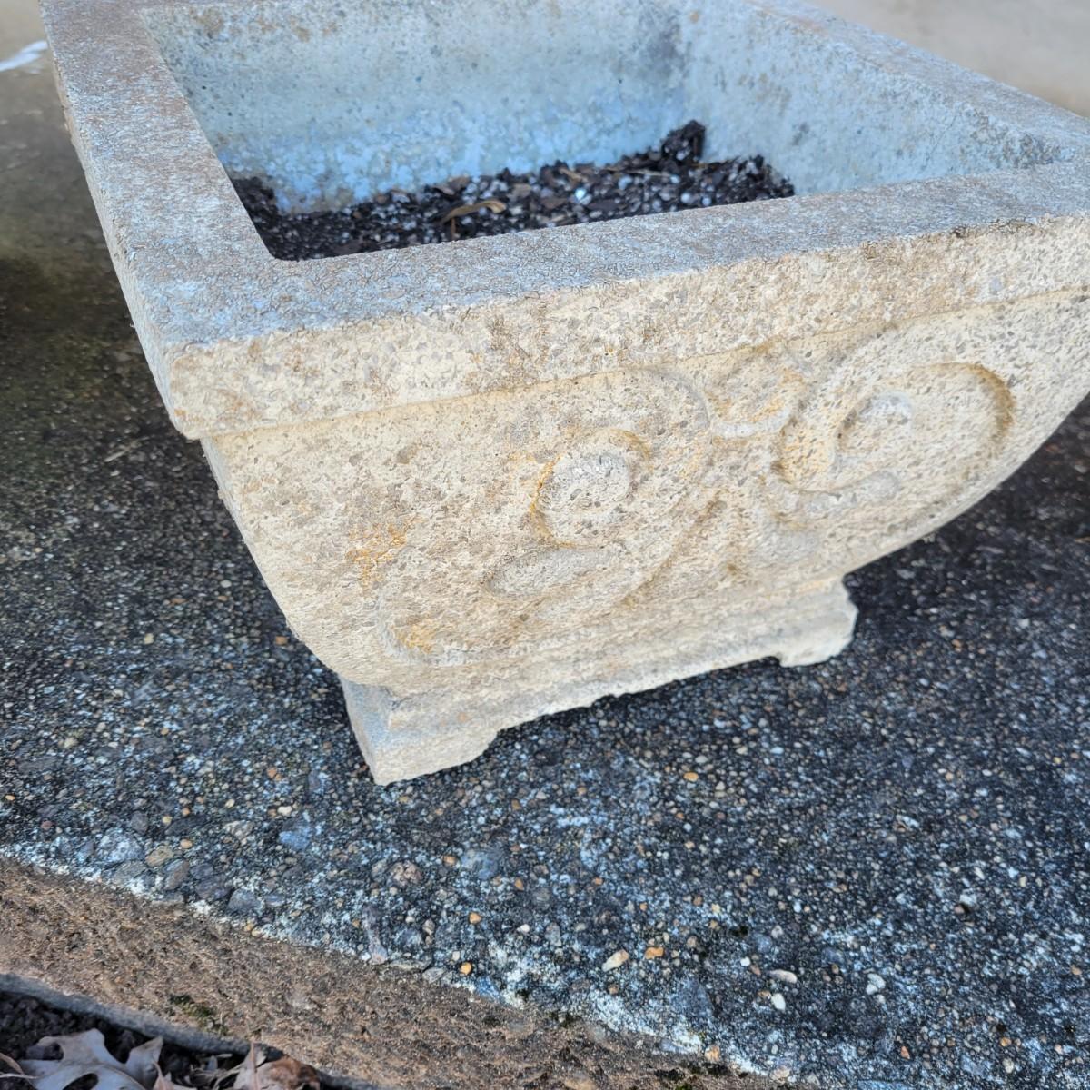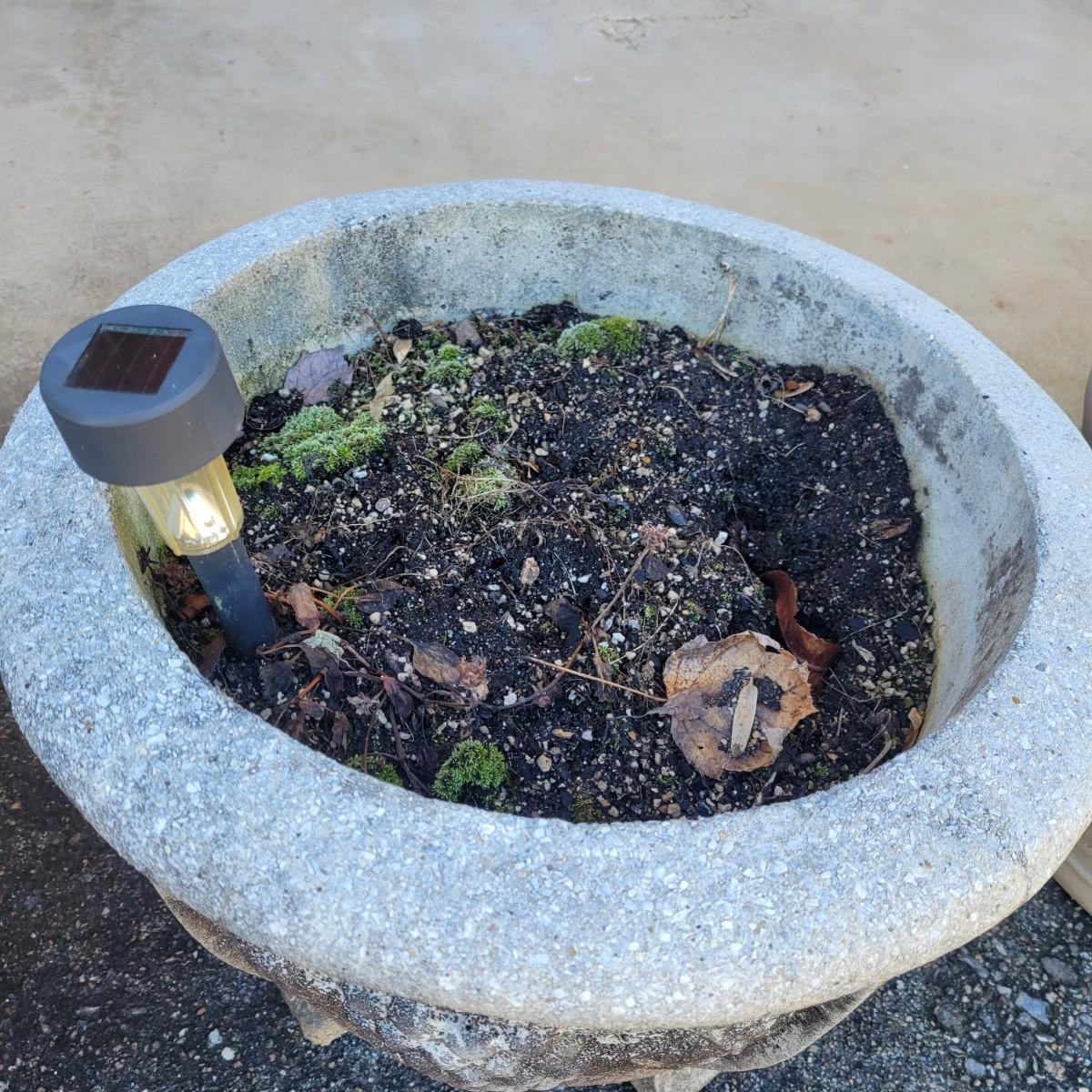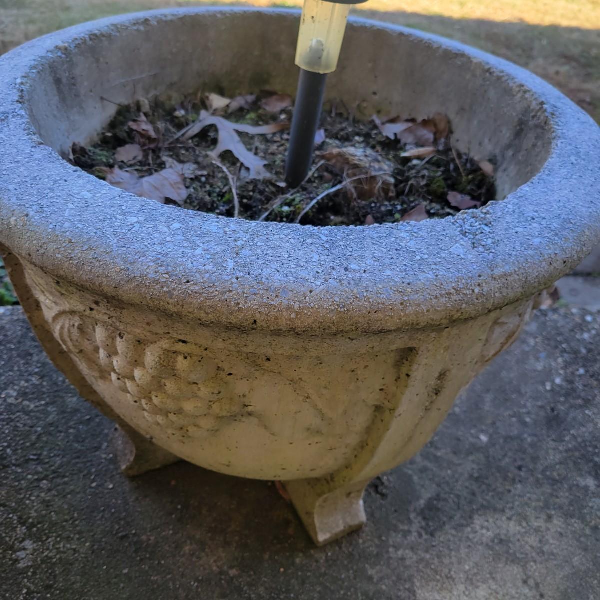 An assortment of four outdoor planters in good condition with no notable damage. Included are three concrete planters and one that is plastic. The two largest matching planters are made of concrete and measure approximately 19"D x 15"H. The smaller square planter is also made of concrete. The remaining round planter is made of plastic. Lot includes three solar lights that have not been tested. Local pickup only. Winning bidder must bring assistance to help move and load this item due to its weight and/or size.