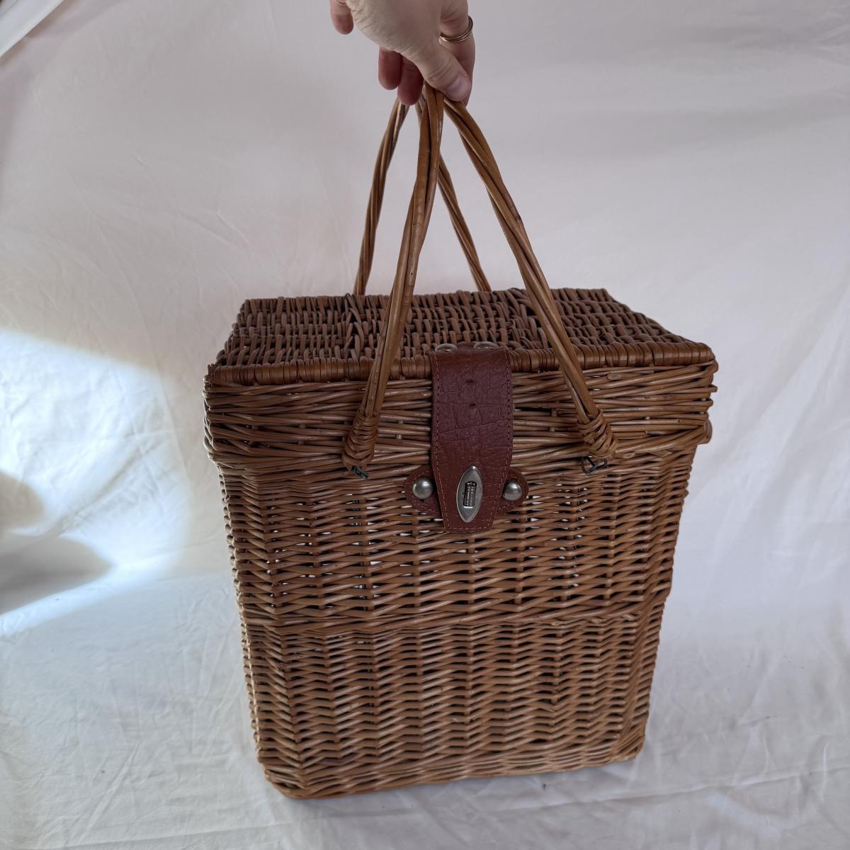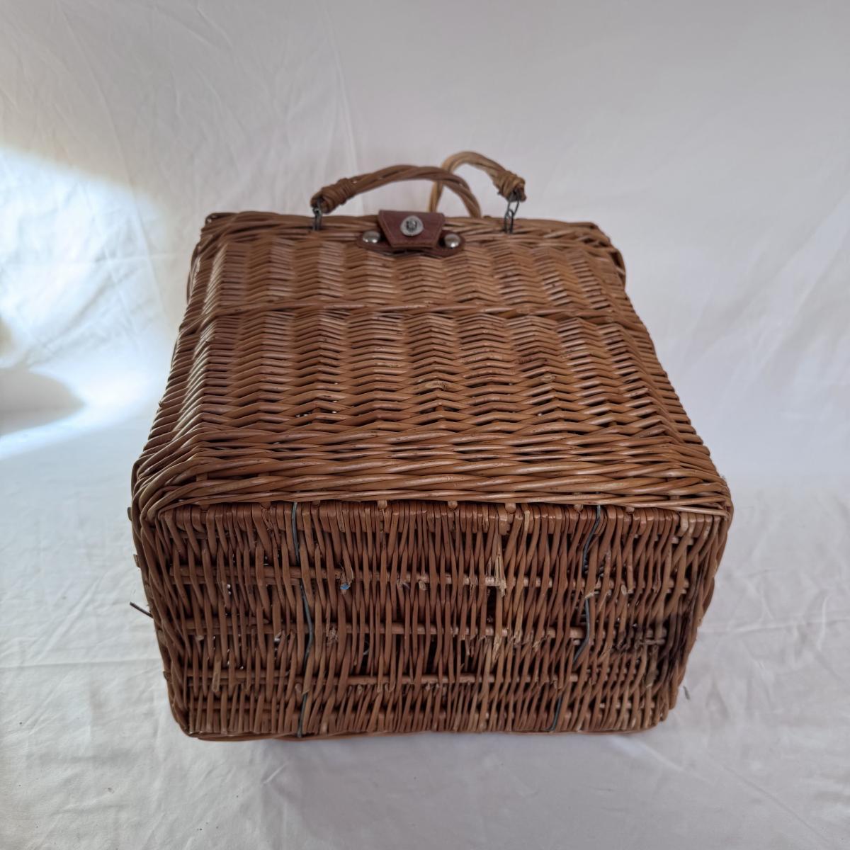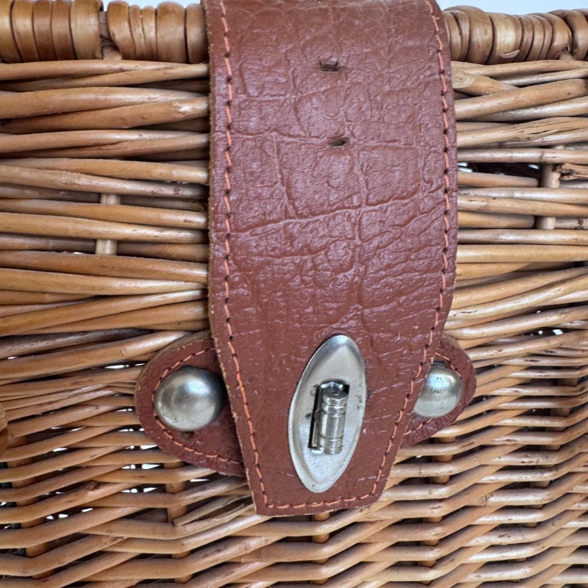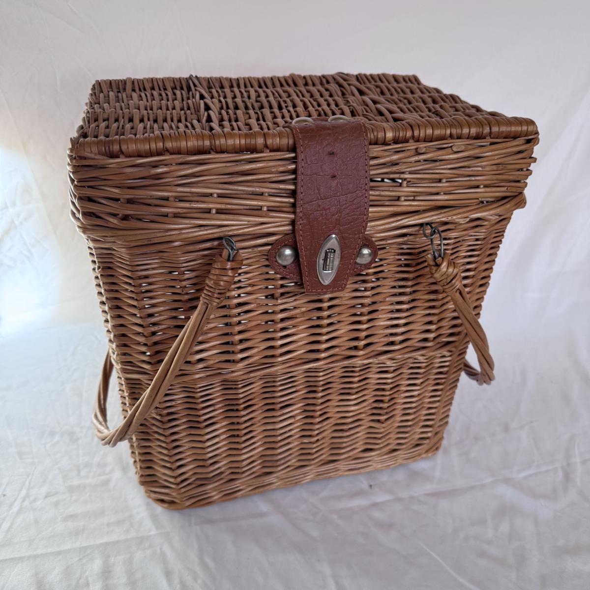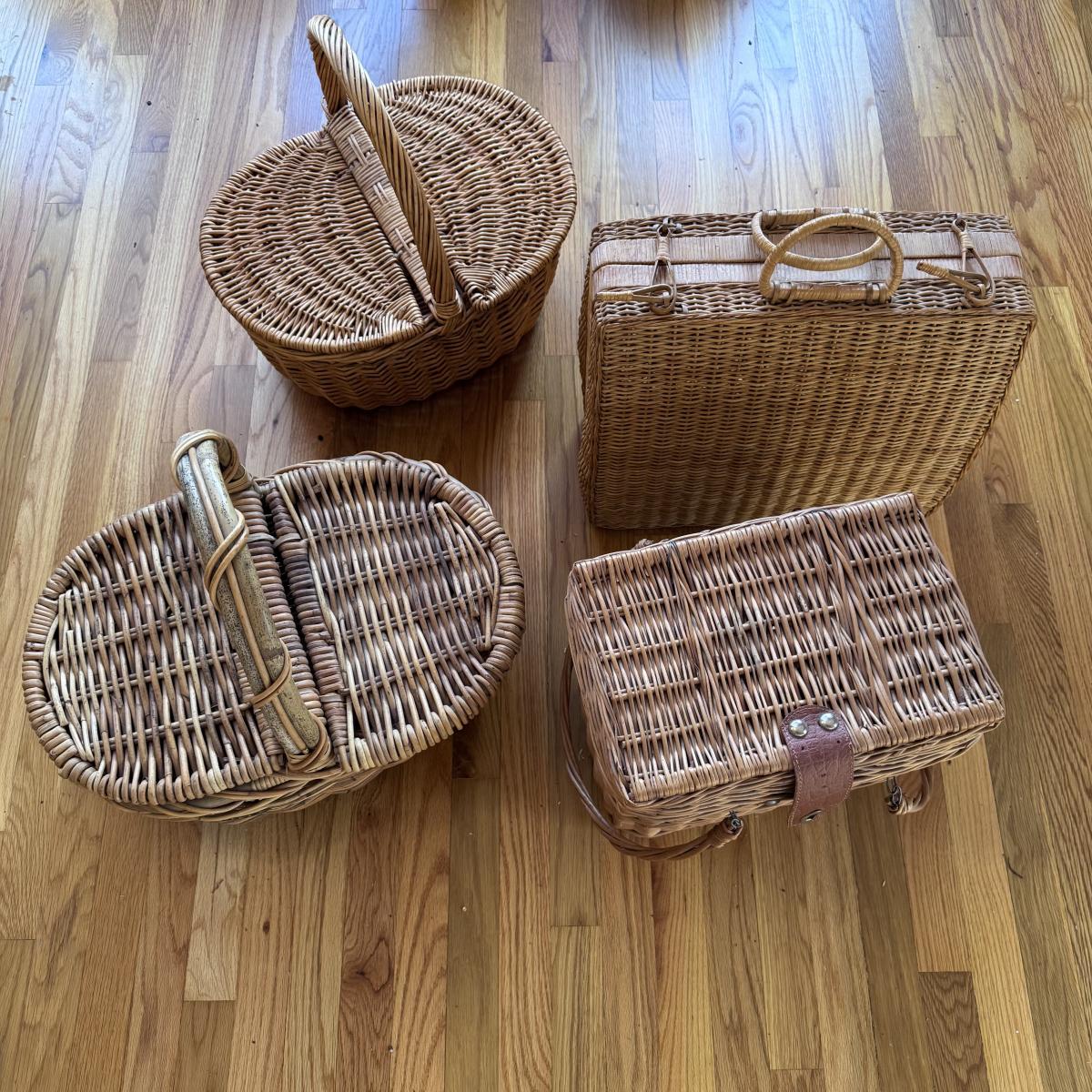 Lot includes four adorable wicker picnic baskets in various shapes. The first two pictured open on the top of both sides. The third pictured has a leather and metal clasp and two handles. The last one pictured is a briefcase style basket with clasps on the top. It measures 17” x 5.5” x 15”H. There is one spot that is broken, but it is still functional - see picture included. Shipping available.