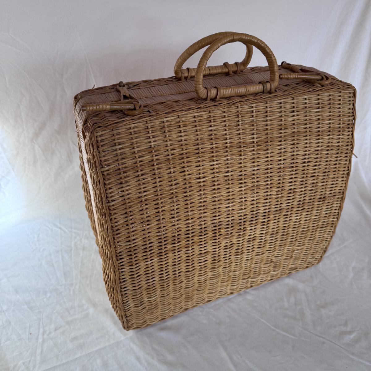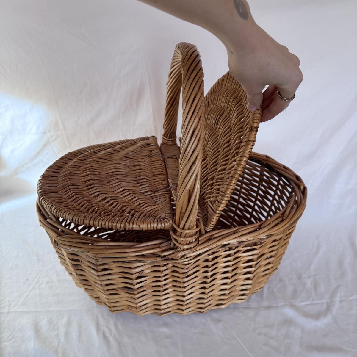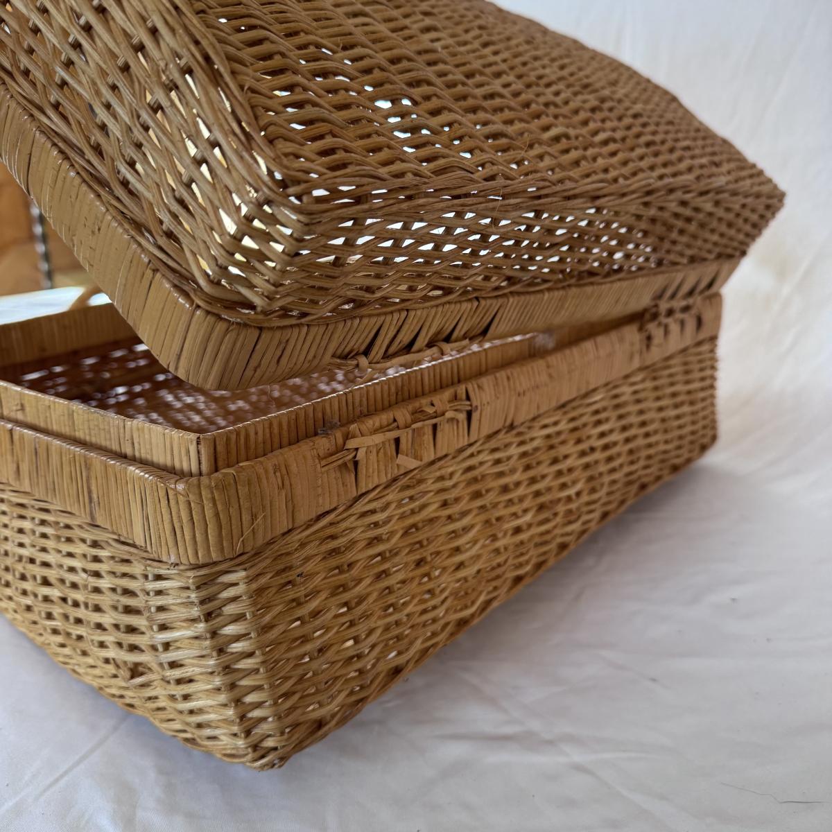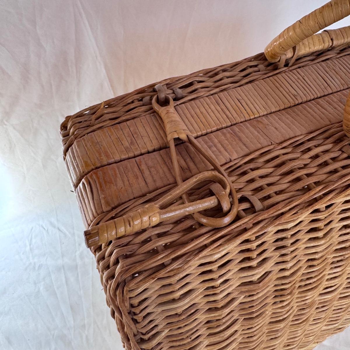 Lot includes four adorable wicker picnic baskets in various shapes. The first two pictured open on the top of both sides. The third pictured has a leather and metal clasp and two handles. The last one pictured is a briefcase style basket with clasps on the top. It measures 17” x 5.5” x 15”H. There is one spot that is broken, but it is still functional - see picture included. Shipping available.