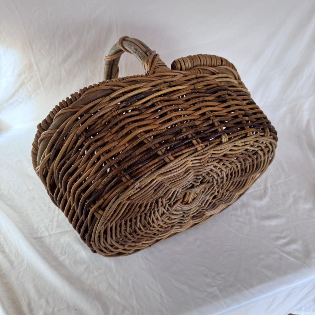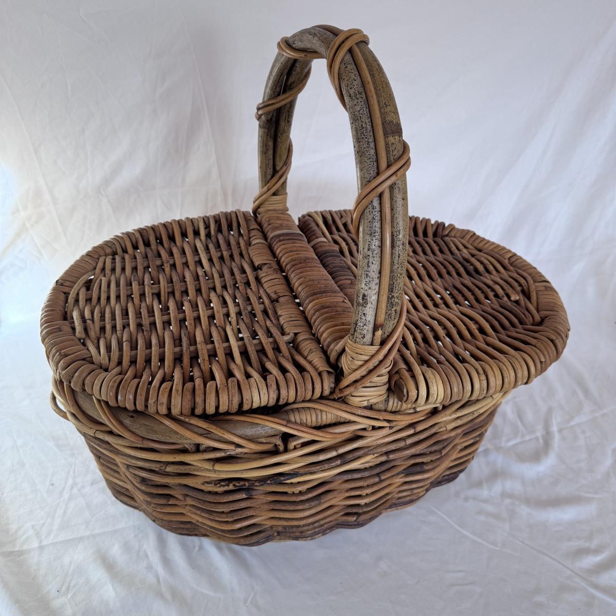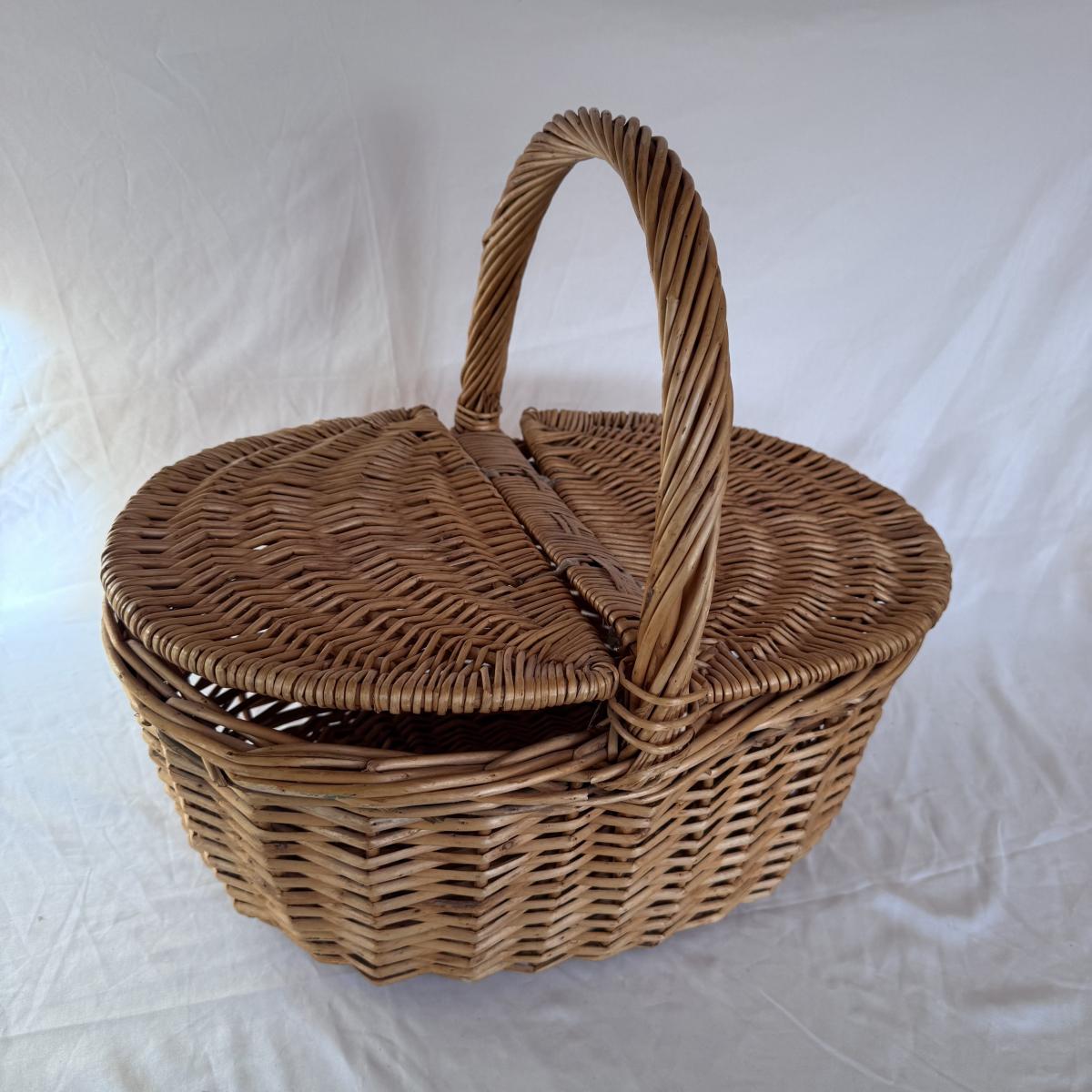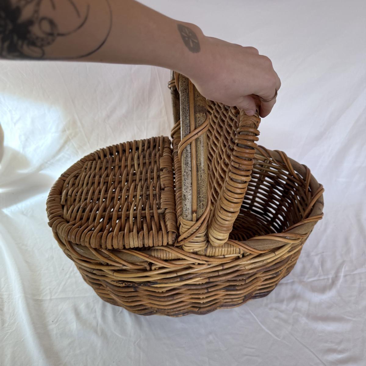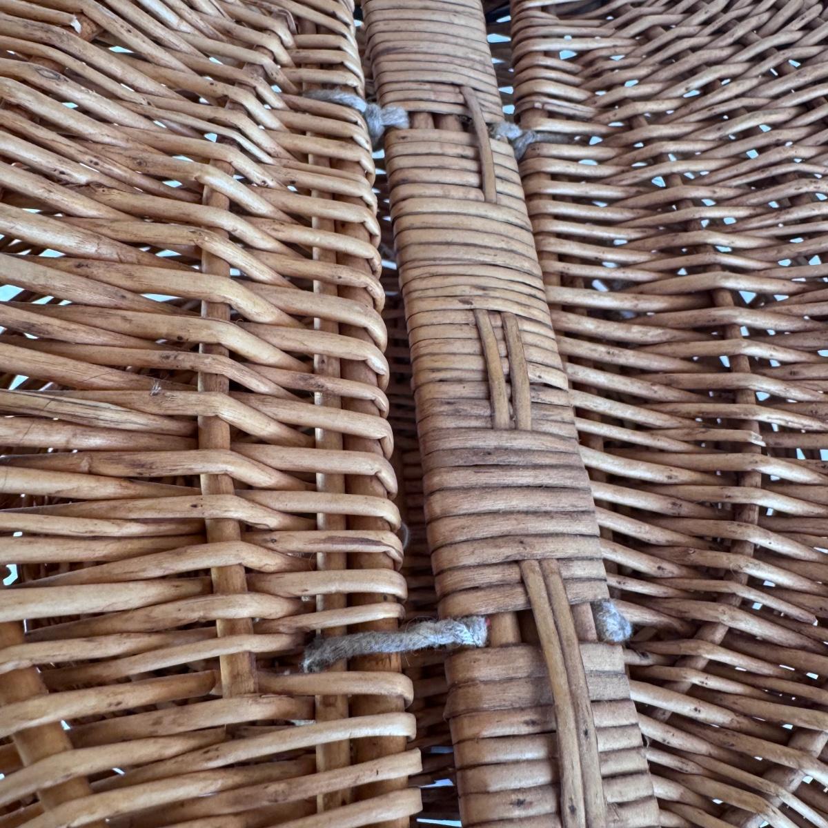 Lot includes four adorable wicker picnic baskets in various shapes. The first two pictured open on the top of both sides. The third pictured has a leather and metal clasp and two handles. The last one pictured is a briefcase style basket with clasps on the top. It measures 17” x 5.5” x 15”H. There is one spot that is broken, but it is still functional - see picture included. Shipping available.