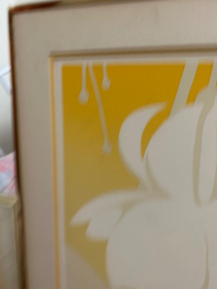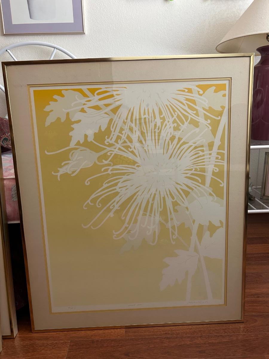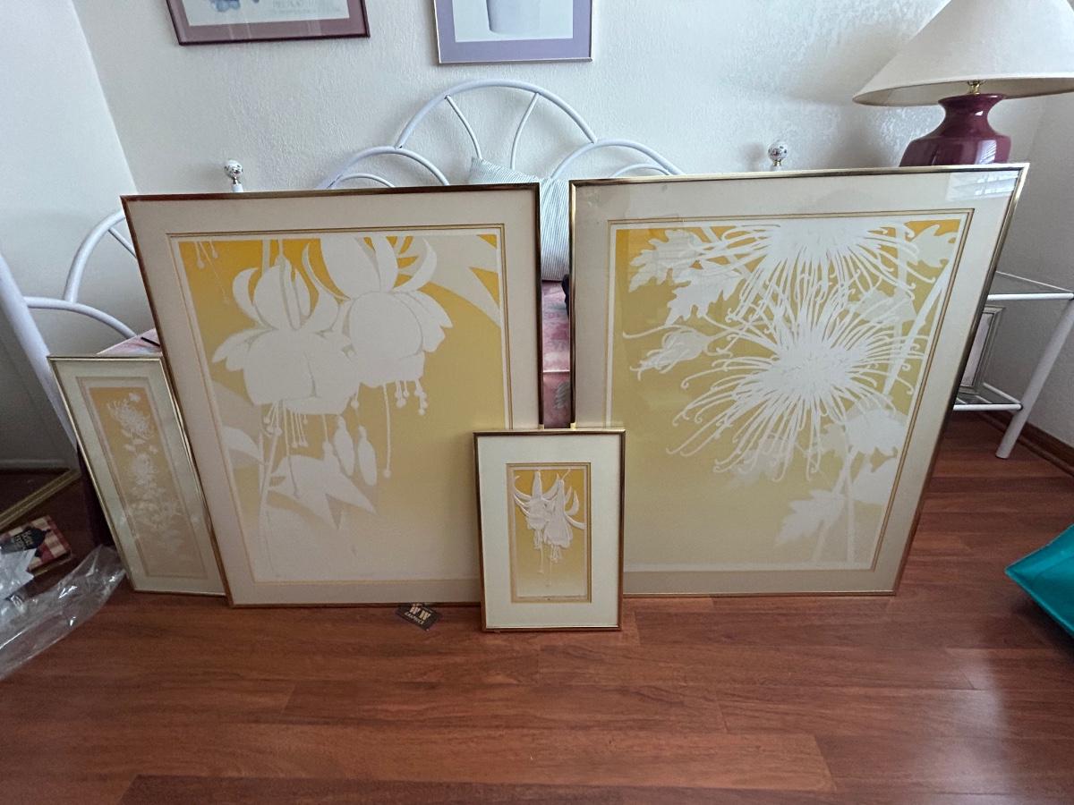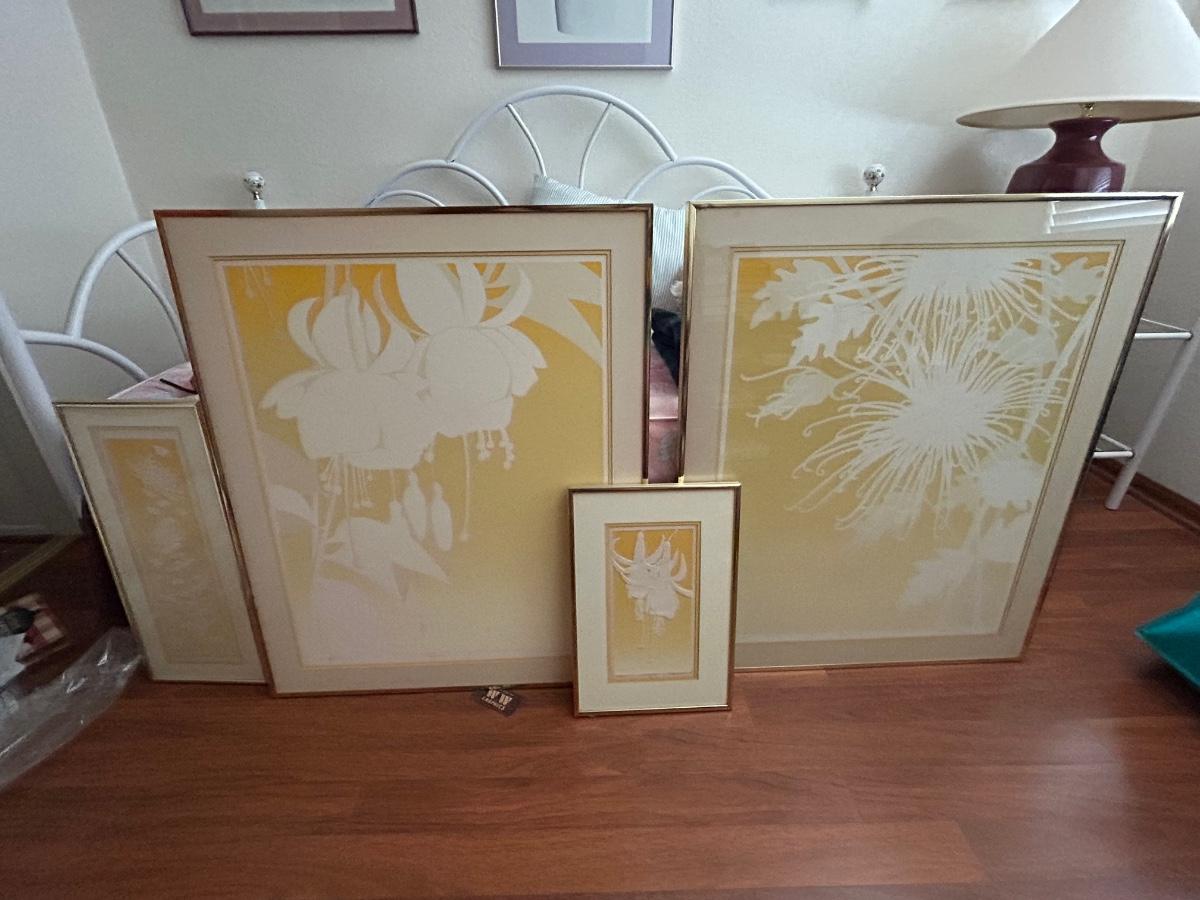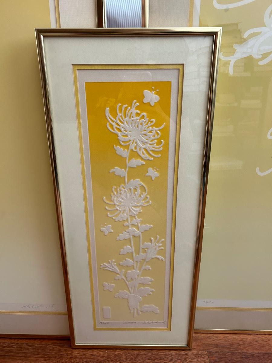 Four Piece Floral Silhouette Serigraph Embossed Framed Art Yellow and White Numbered and Signed. Done by Warren Woodward. All pieces are signed and numbered. One of the larger pieces is missing the acrylic cover. All in good condition.
