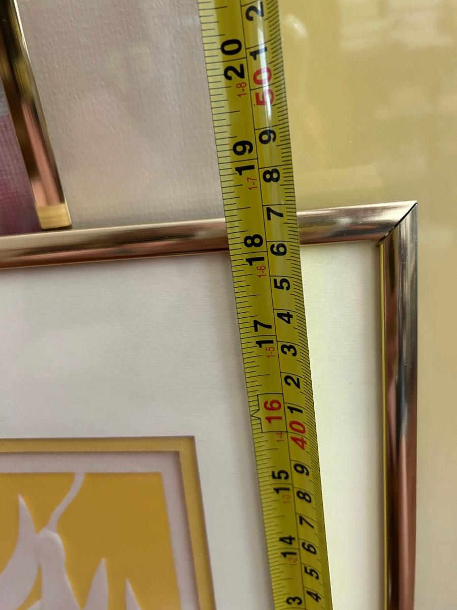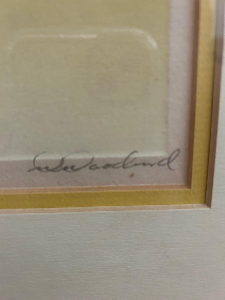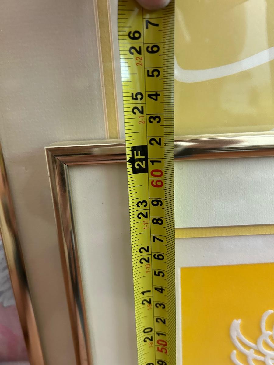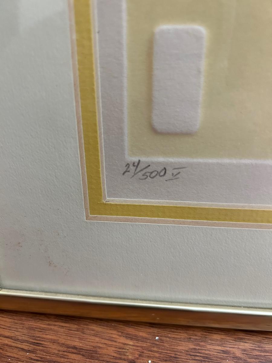 Four Piece Floral Silhouette Serigraph Embossed Framed Art Yellow and White Numbered and Signed. Done by Warren Woodward. All pieces are signed and numbered. One of the larger pieces is missing the acrylic cover. All in good condition.