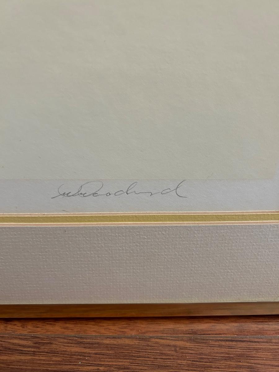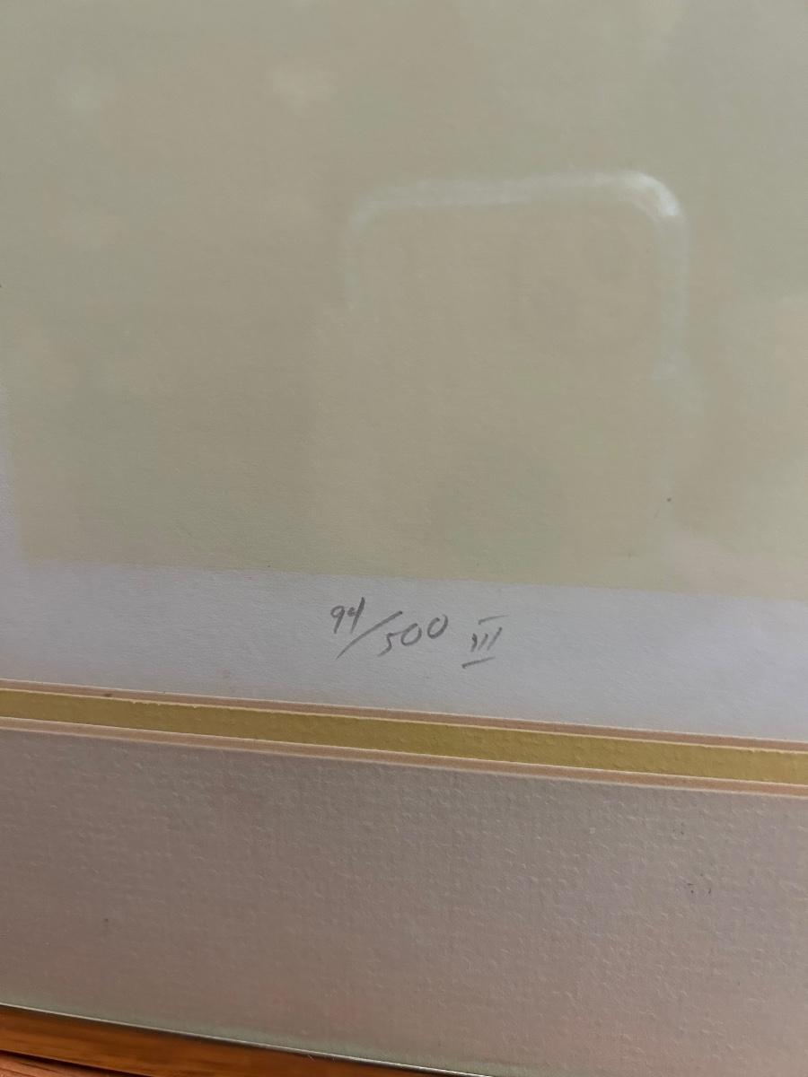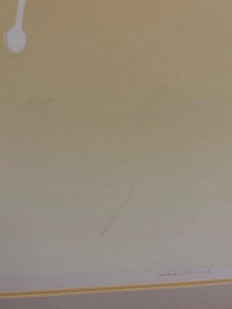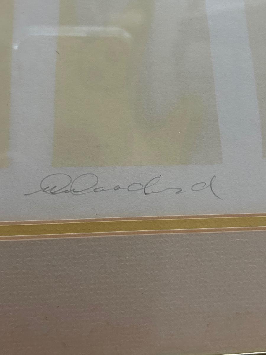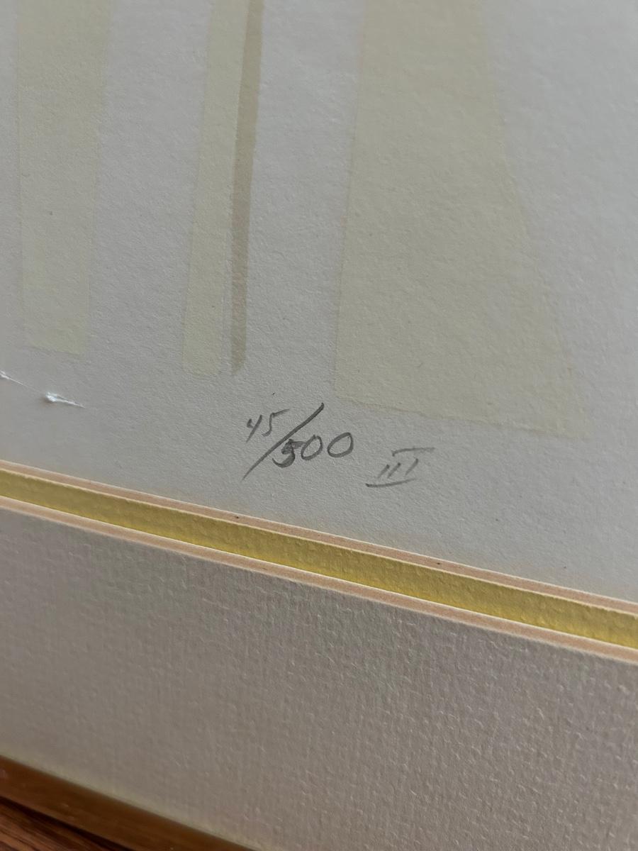 Four Piece Floral Silhouette Serigraph Embossed Framed Art Yellow and White Numbered and Signed. Done by Warren Woodward. All pieces are signed and numbered. One of the larger pieces is missing the acrylic cover. All in good condition.