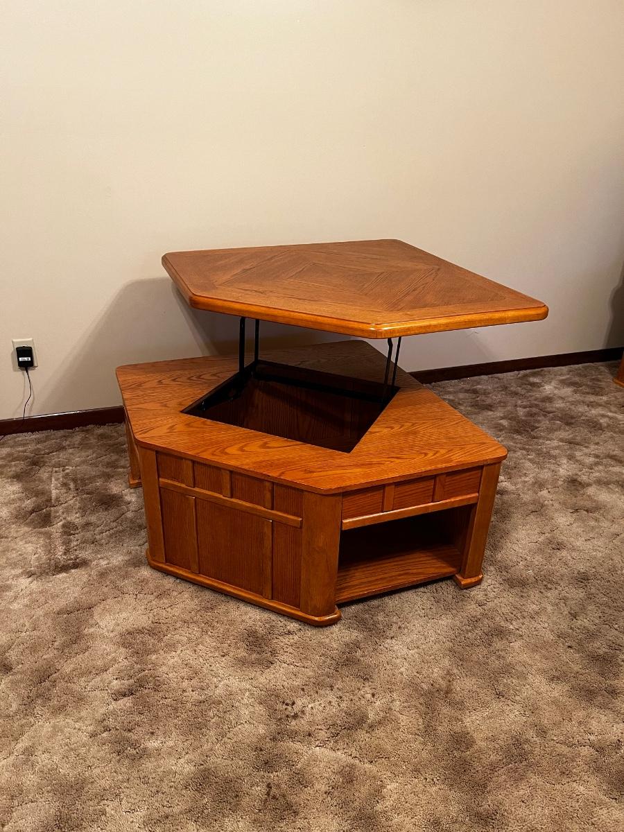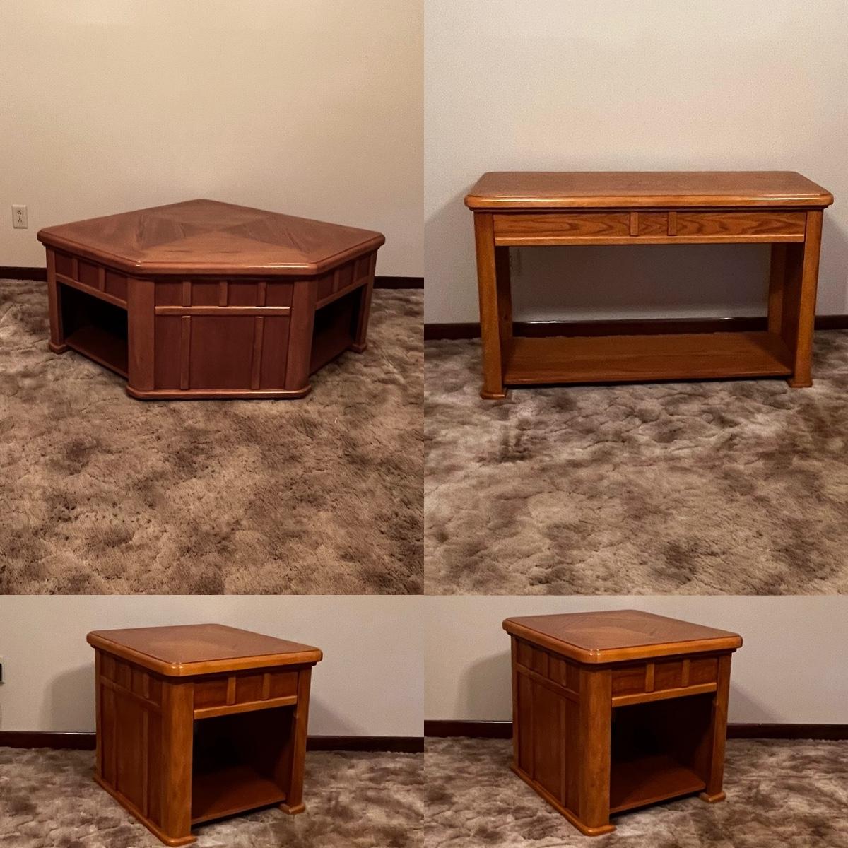 Two End tables = 21” H x 24” W x 21” D ~ Lifting Top Coffee Table = 18.5” H x 36” square ~ Sofa table = 29” H x 48” W x 18” D ~ No brand name found