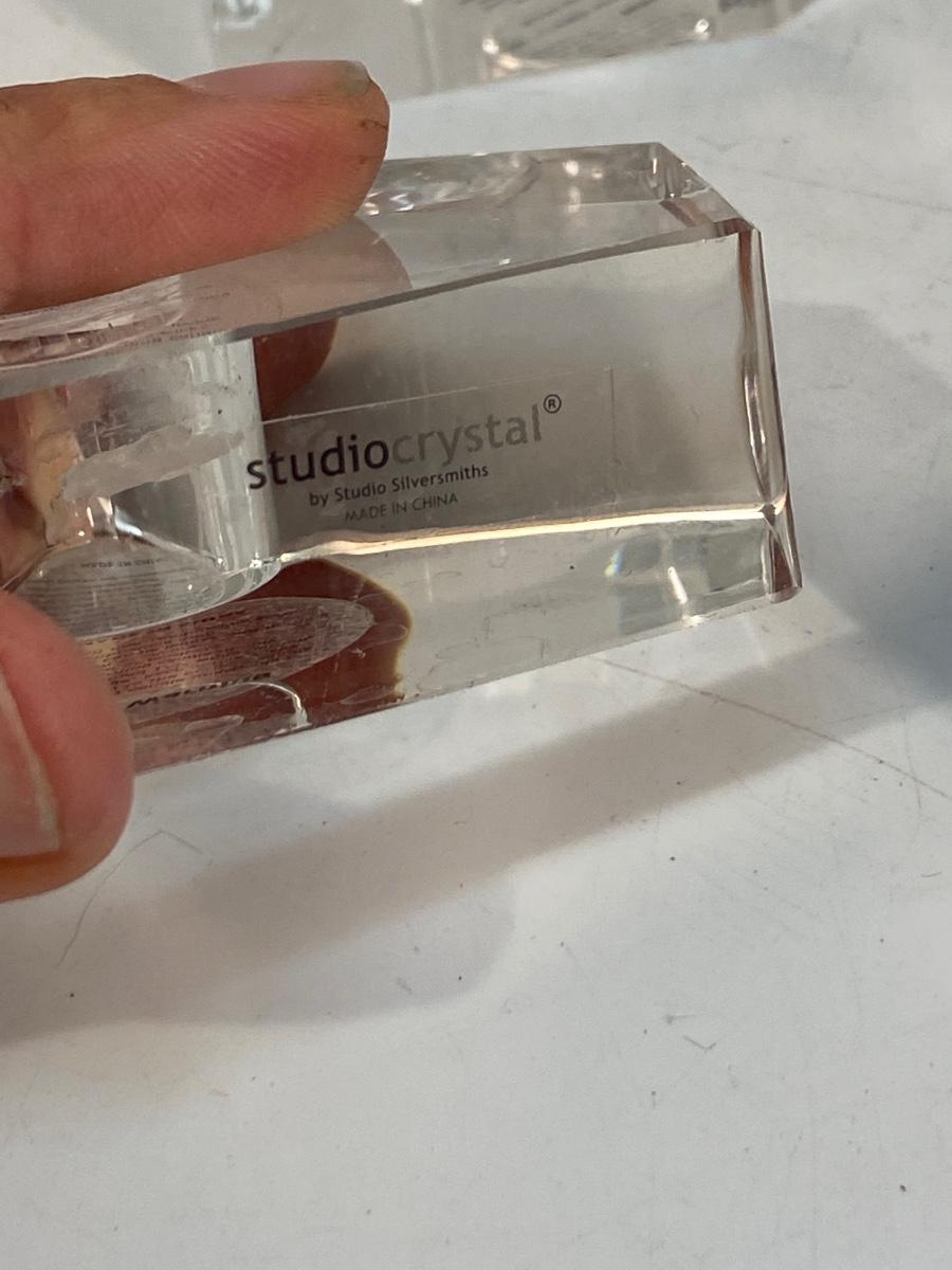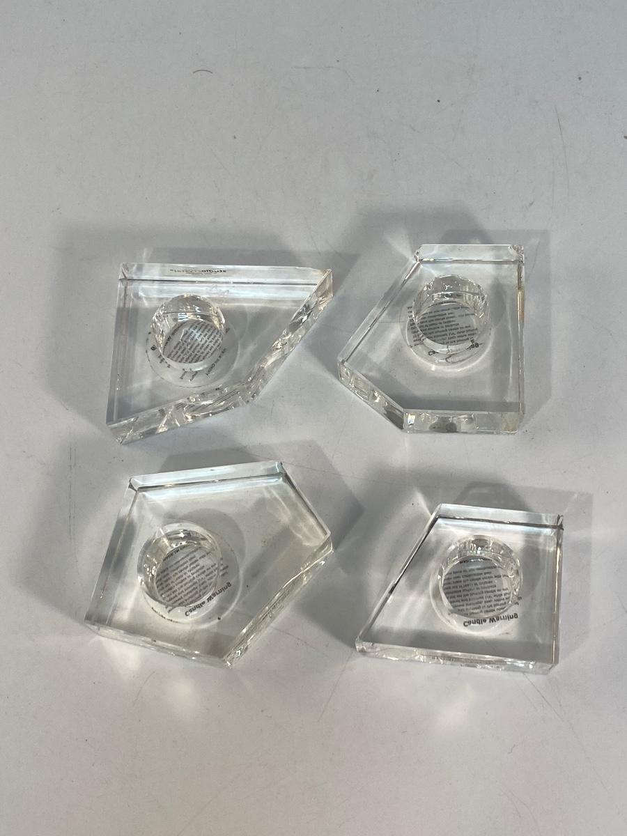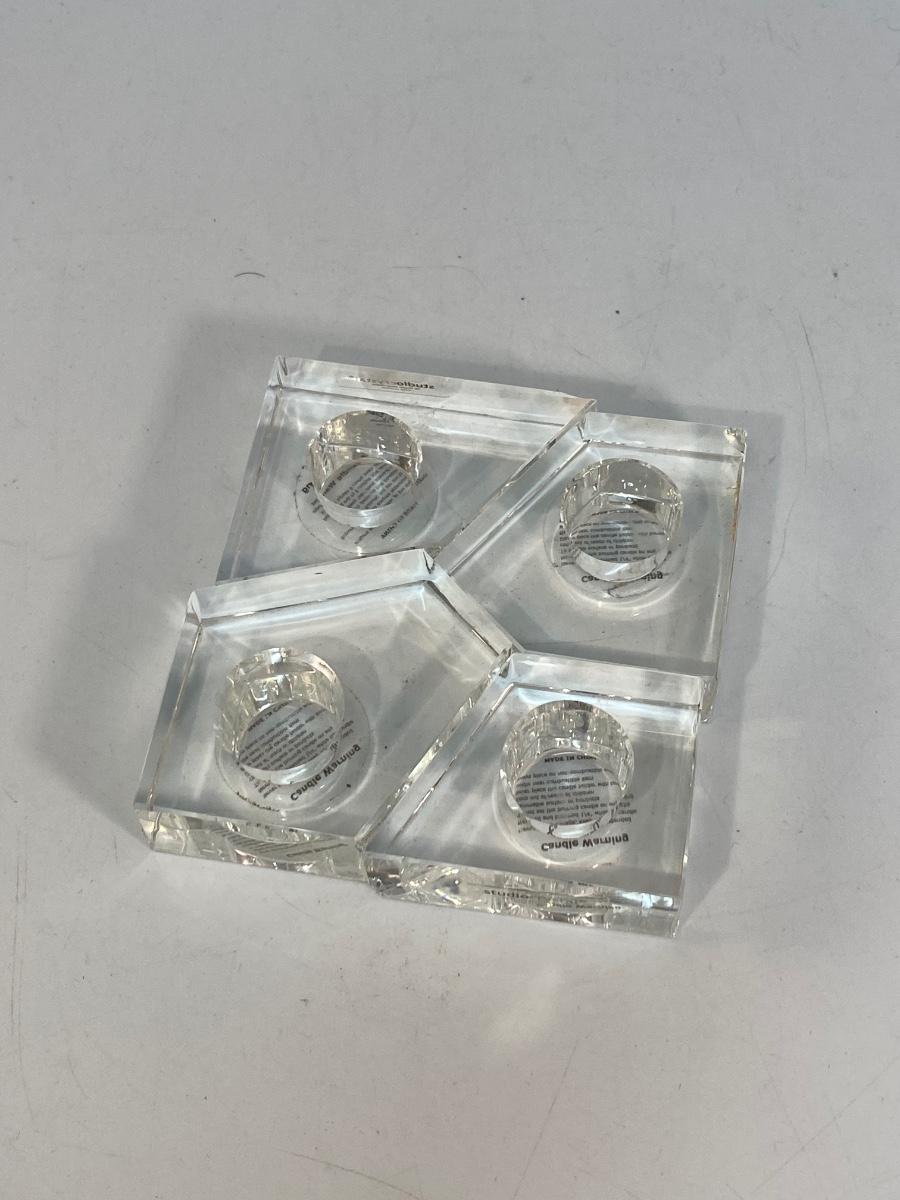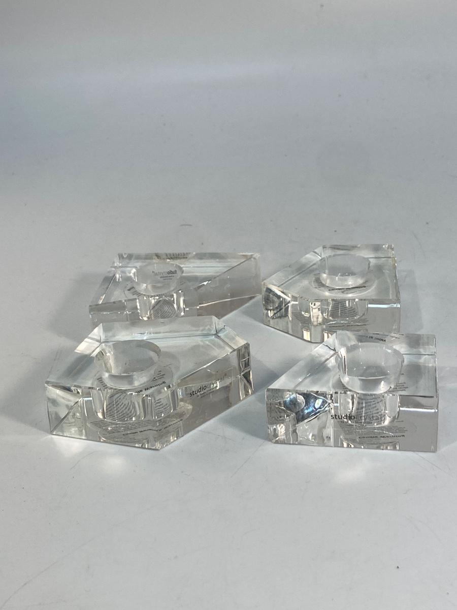 Four Piece Studio Crystal Square Puzzle Taper Candle Holders. Stickers still attached. Minor chip in one piece. Display well.