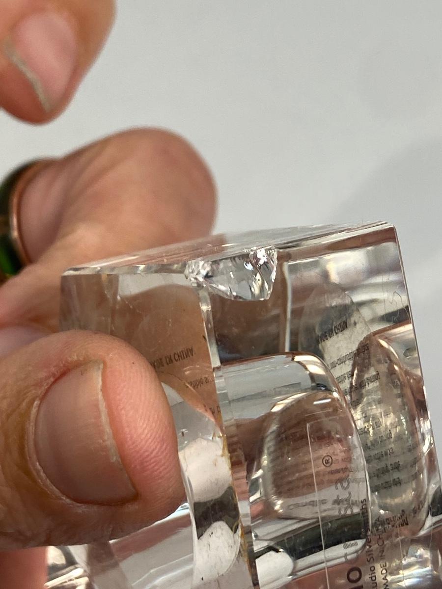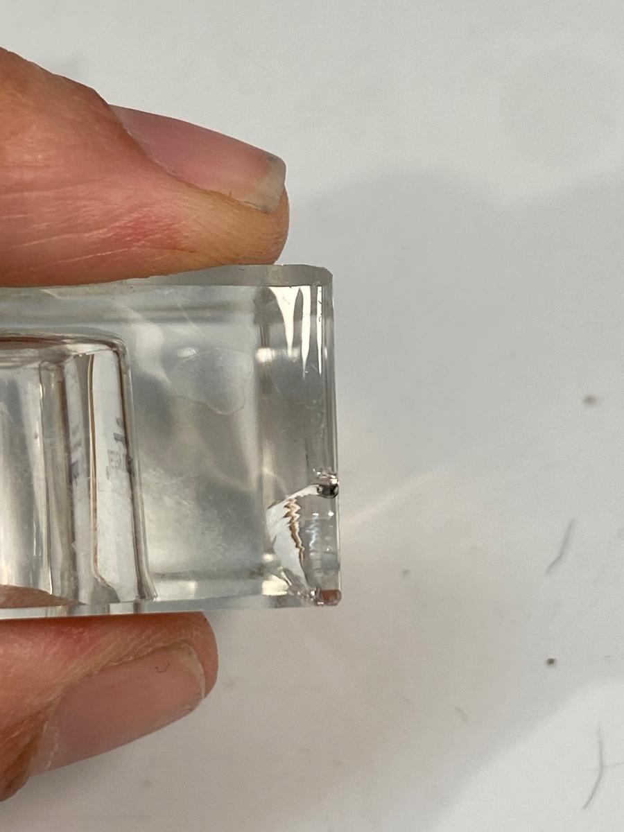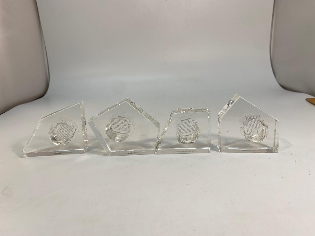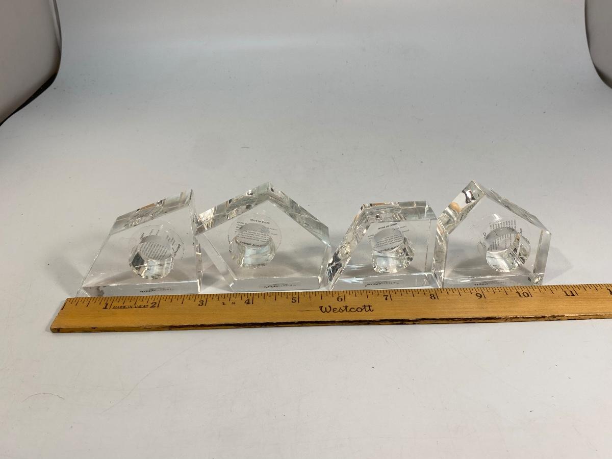 Four Piece Studio Crystal Square Puzzle Taper Candle Holders. Stickers still attached. Minor chip in one piece. Display well.