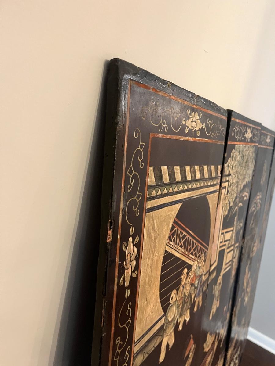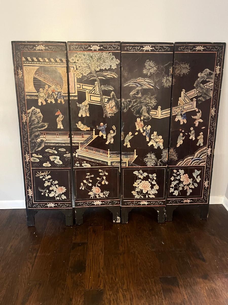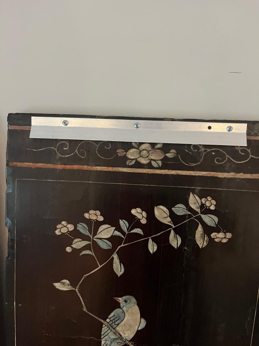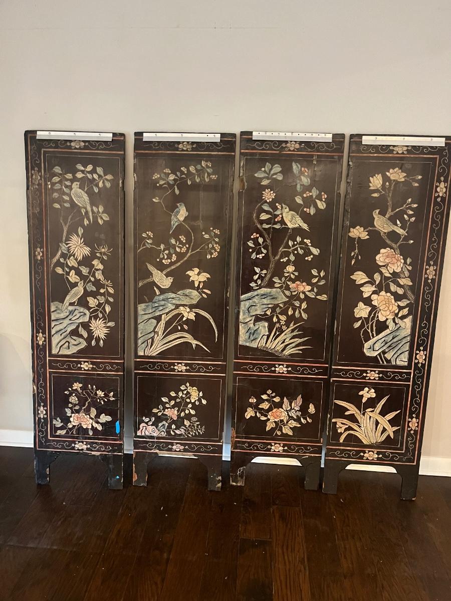 Lot includes four 16" x 60"H wooden panels that appear to be relief cuts for the design. Each panel has a design on both sides and a wall mount and includes the other half of the mount. These panels appear to have been a screen originally.