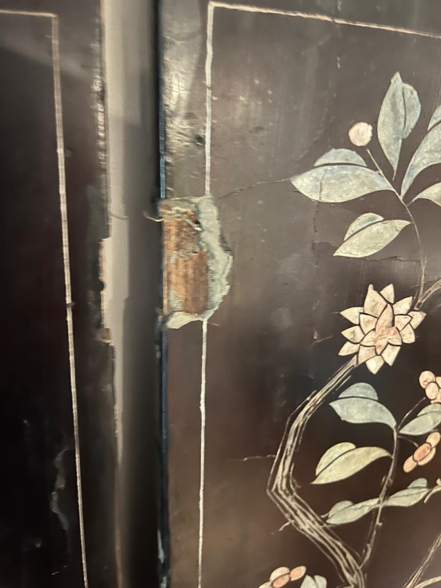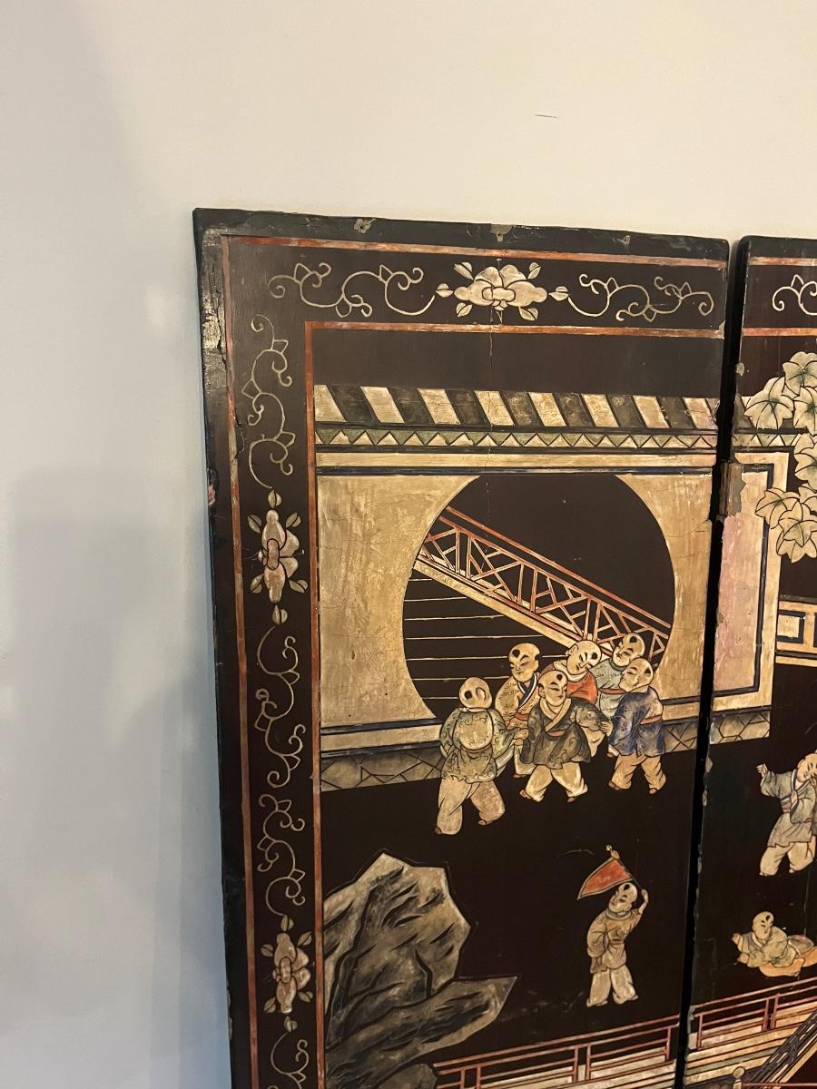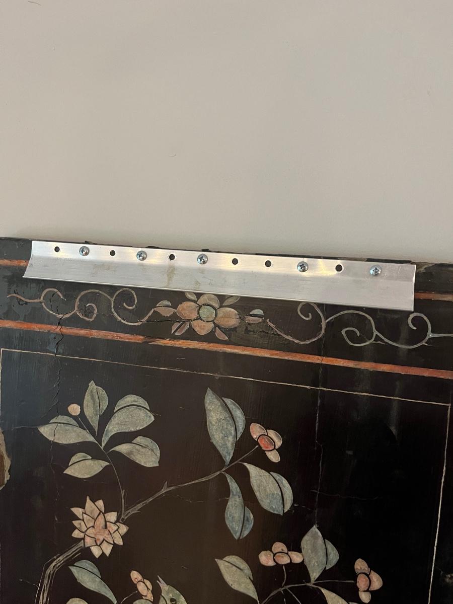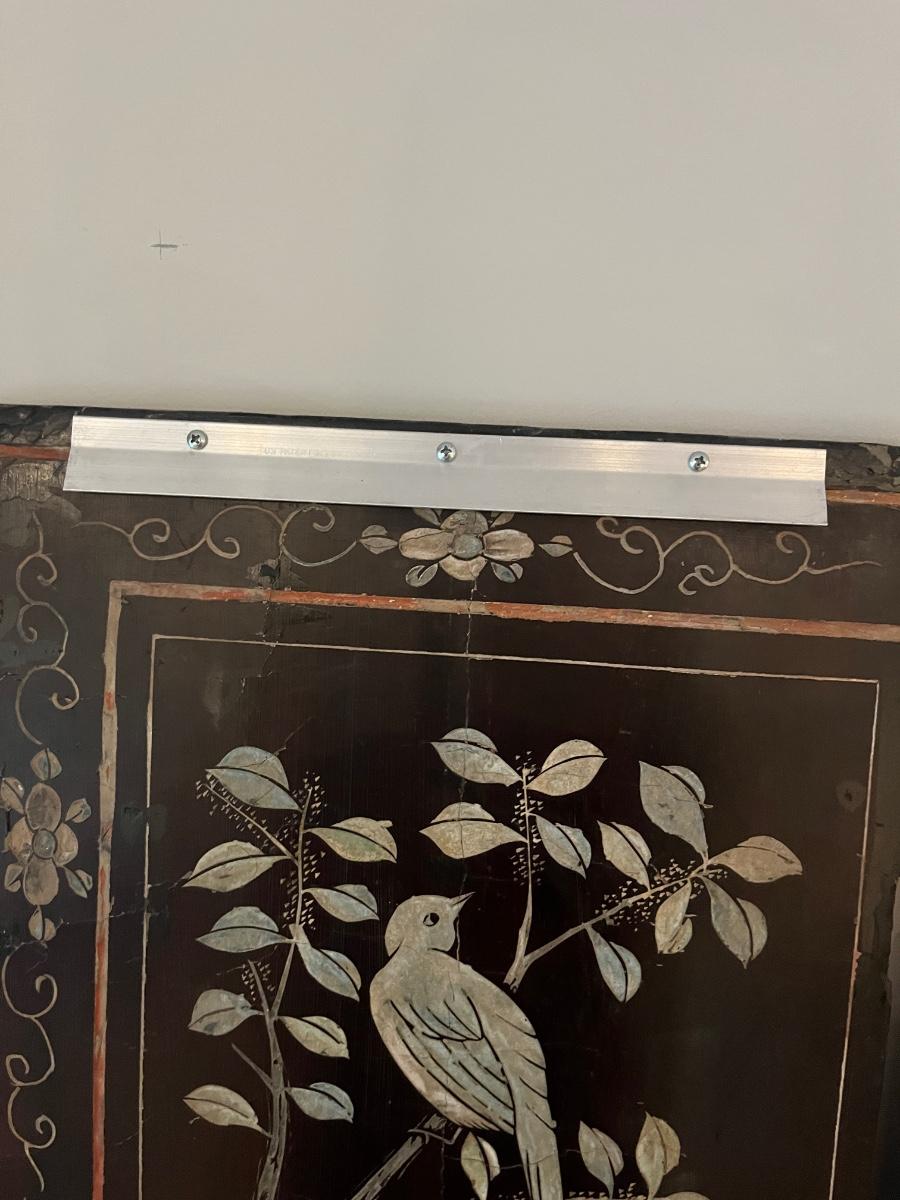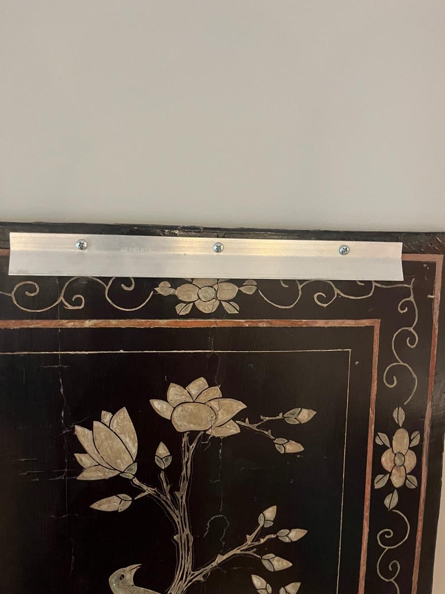 Lot includes four 16" x 60"H wooden panels that appear to be relief cuts for the design. Each panel has a design on both sides and a wall mount and includes the other half of the mount. These panels appear to have been a screen originally.