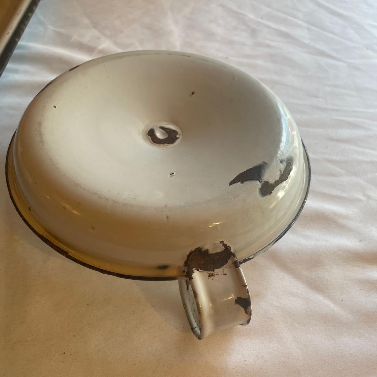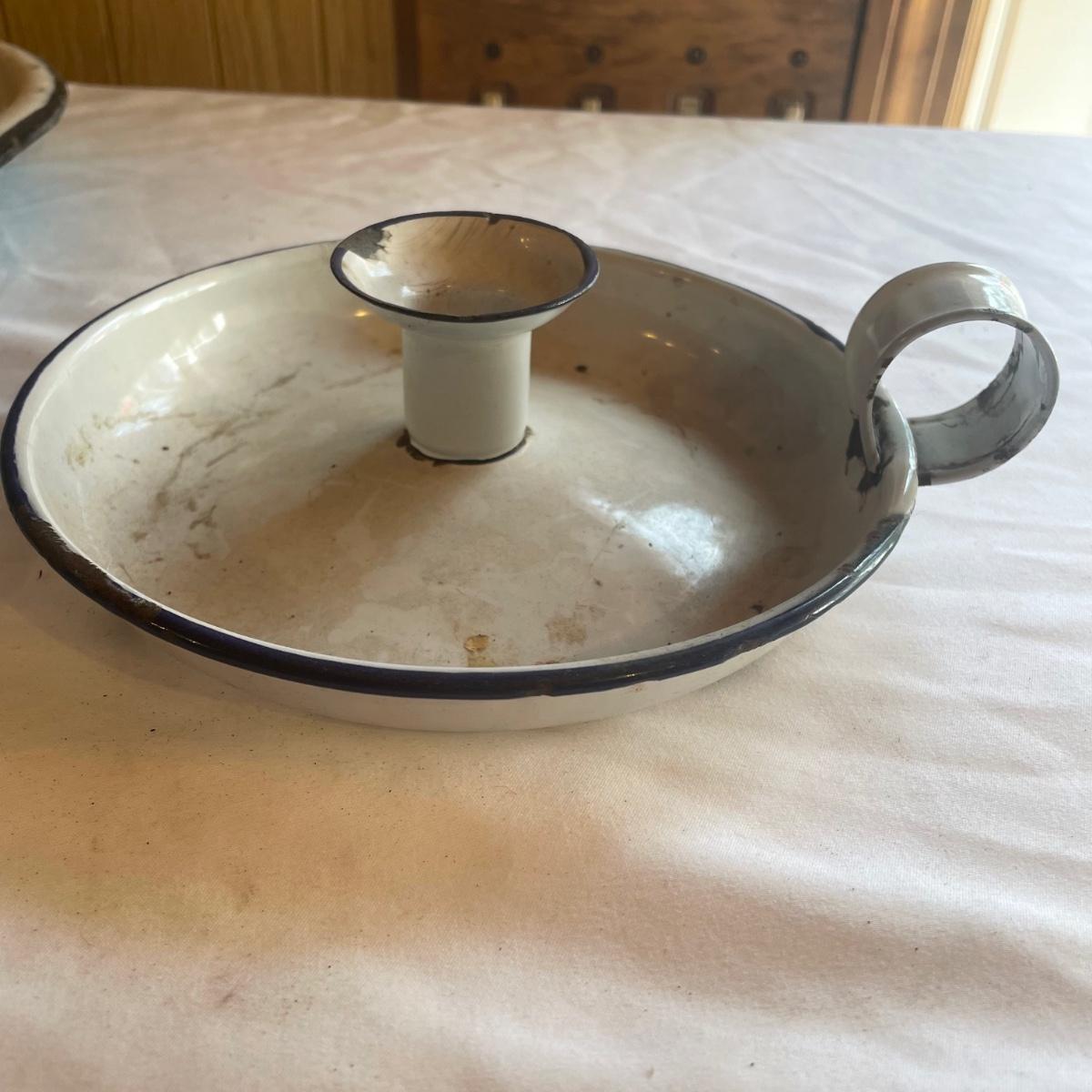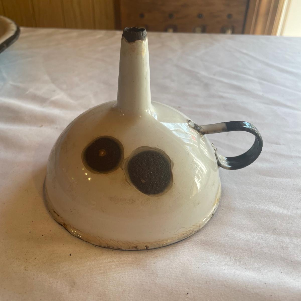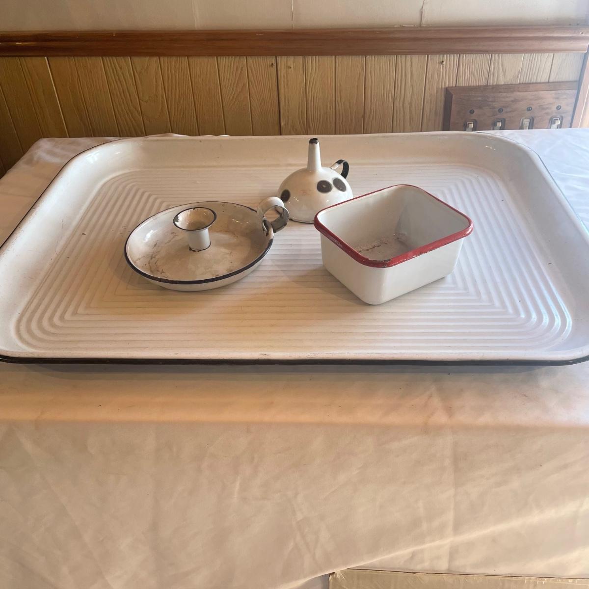 This very large enamelware tray measures 19.5” x 25.5” and is in great shape. Also included is a funnel, candlestick holder and small pan. Note the funnel has some worn spots.