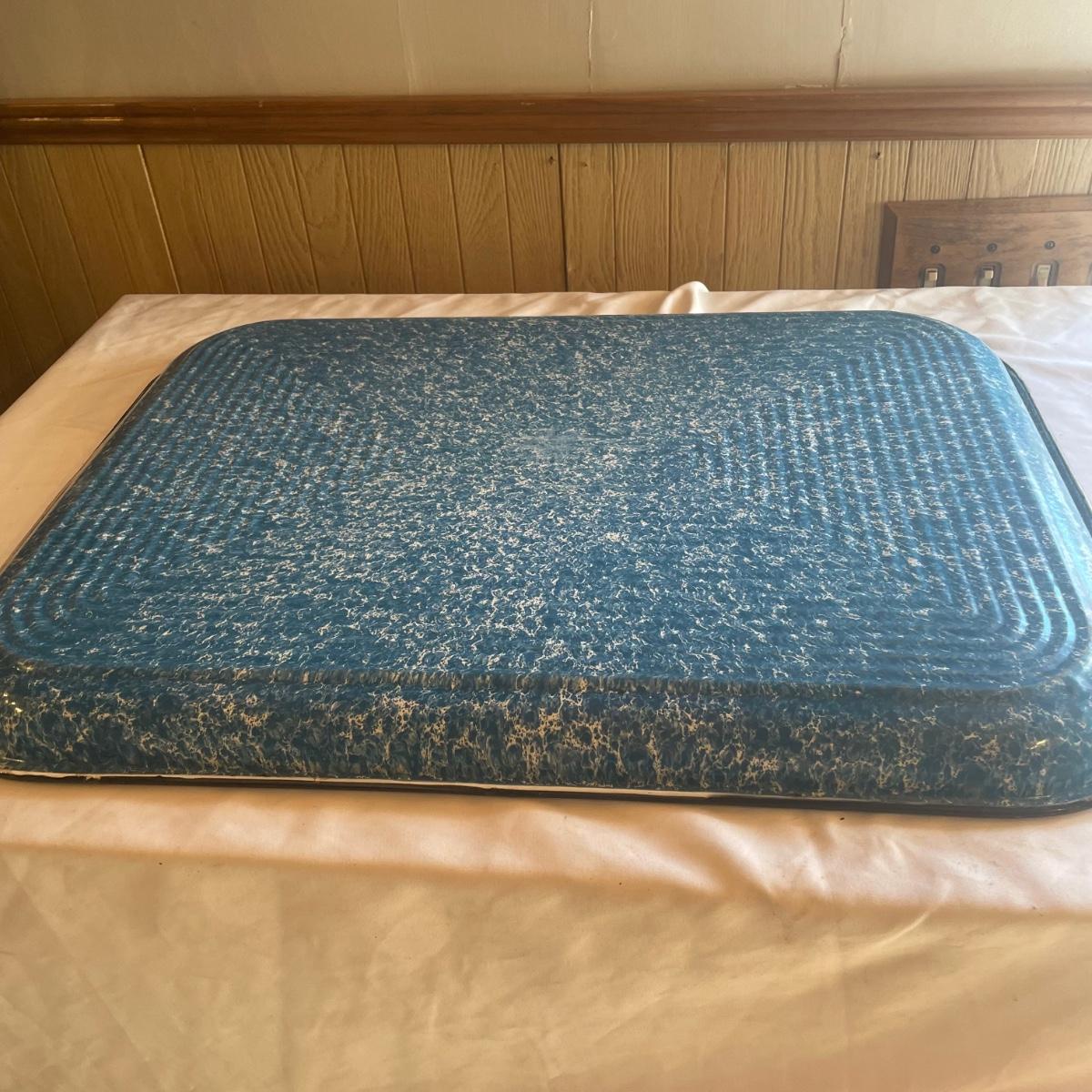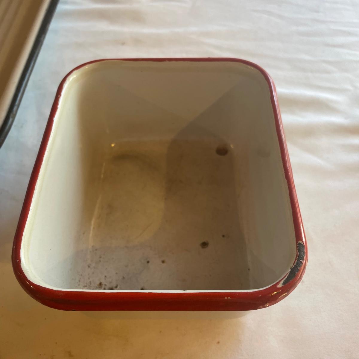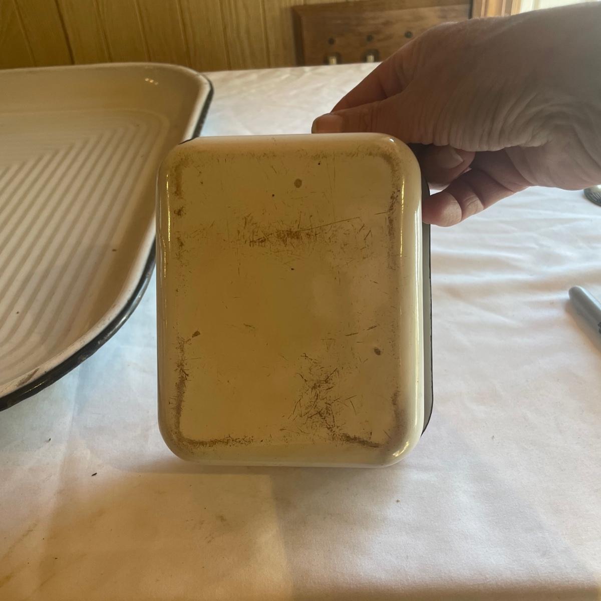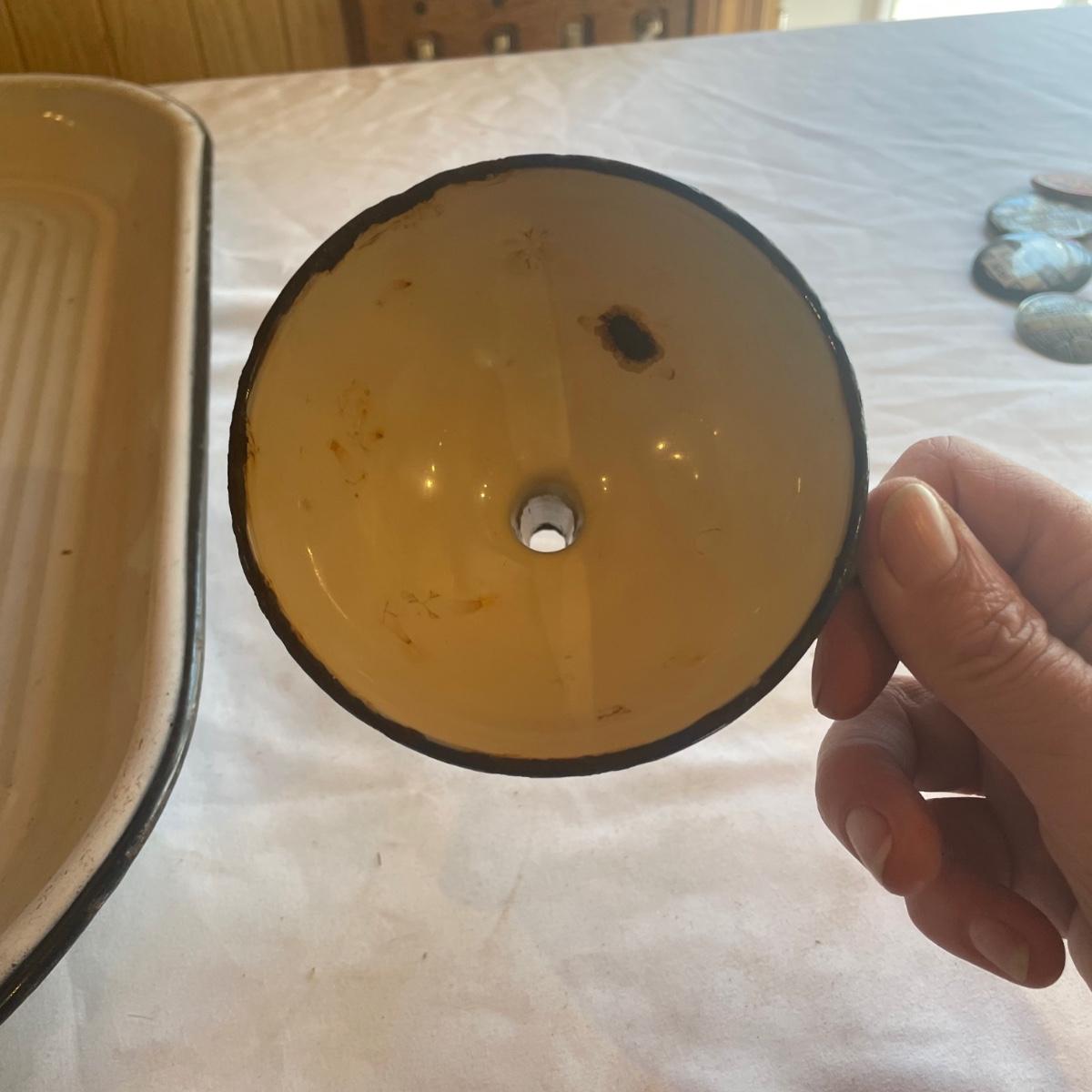 This very large enamelware tray measures 19.5” x 25.5” and is in great shape. Also included is a funnel, candlestick holder and small pan. Note the funnel has some worn spots.