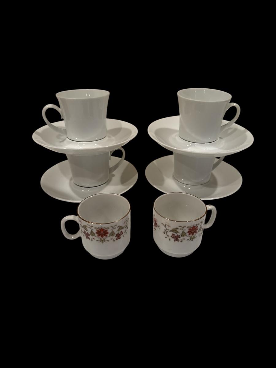 • Two smaller demitasse or espresso cups with floral and gold trim decoration. These are marked “Fine Porcelain” on the base but without a specific brand.