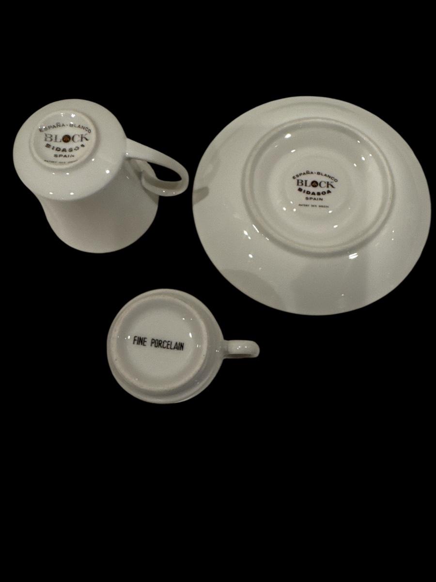 • Four modern white teacups with matching saucers by Block Bidasoa, made in Spain. The set is part of the “España Blanco” line and features clean, minimalist lines in fine porcelain.