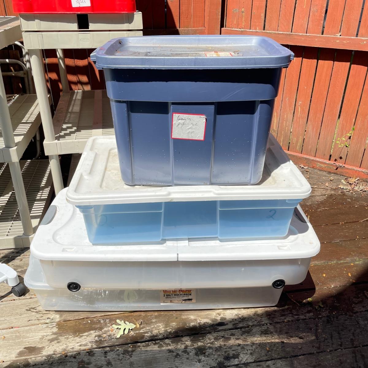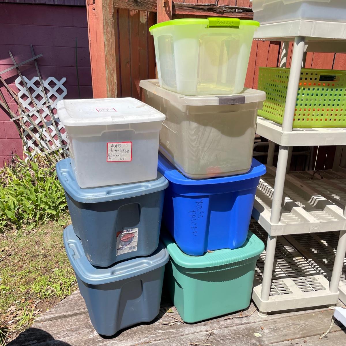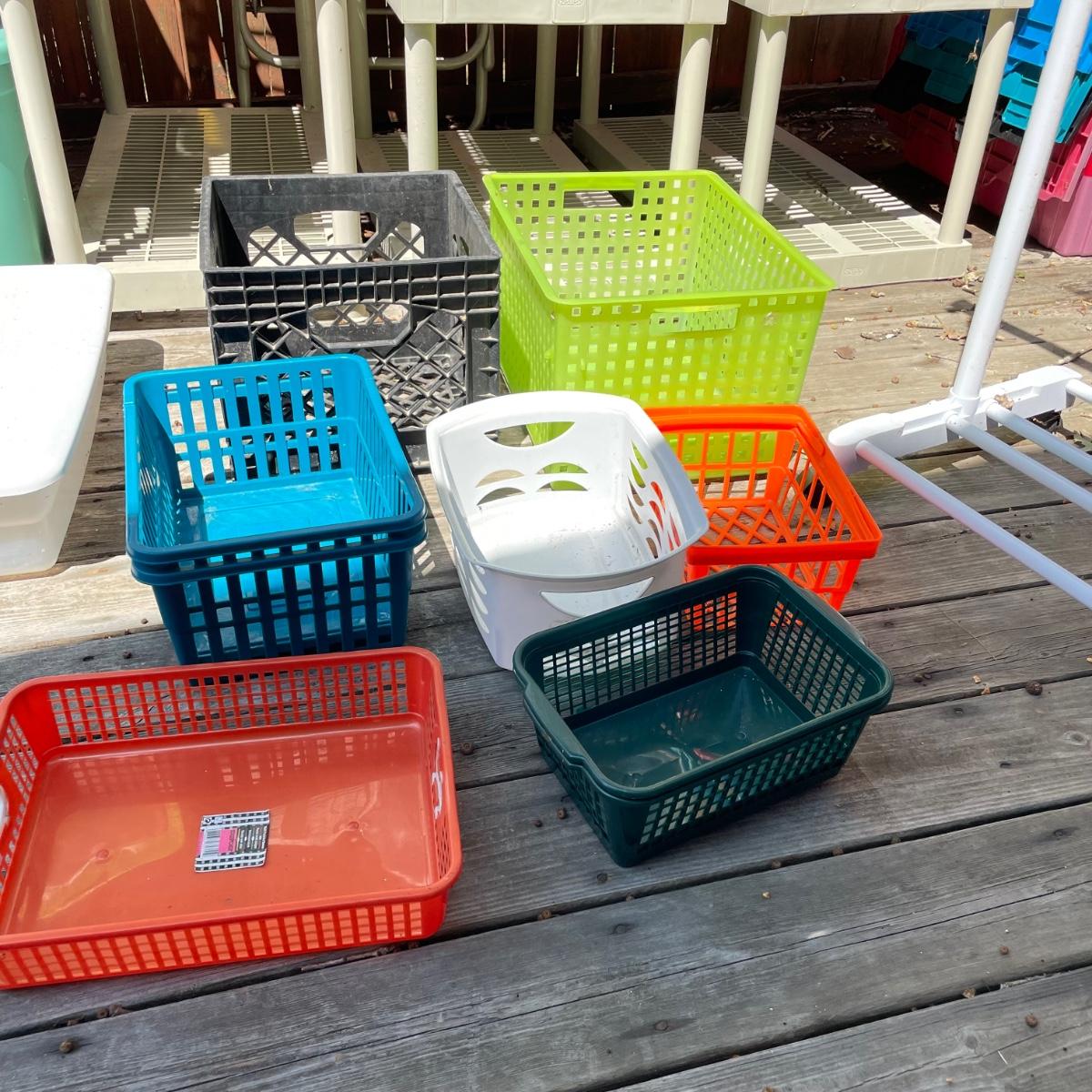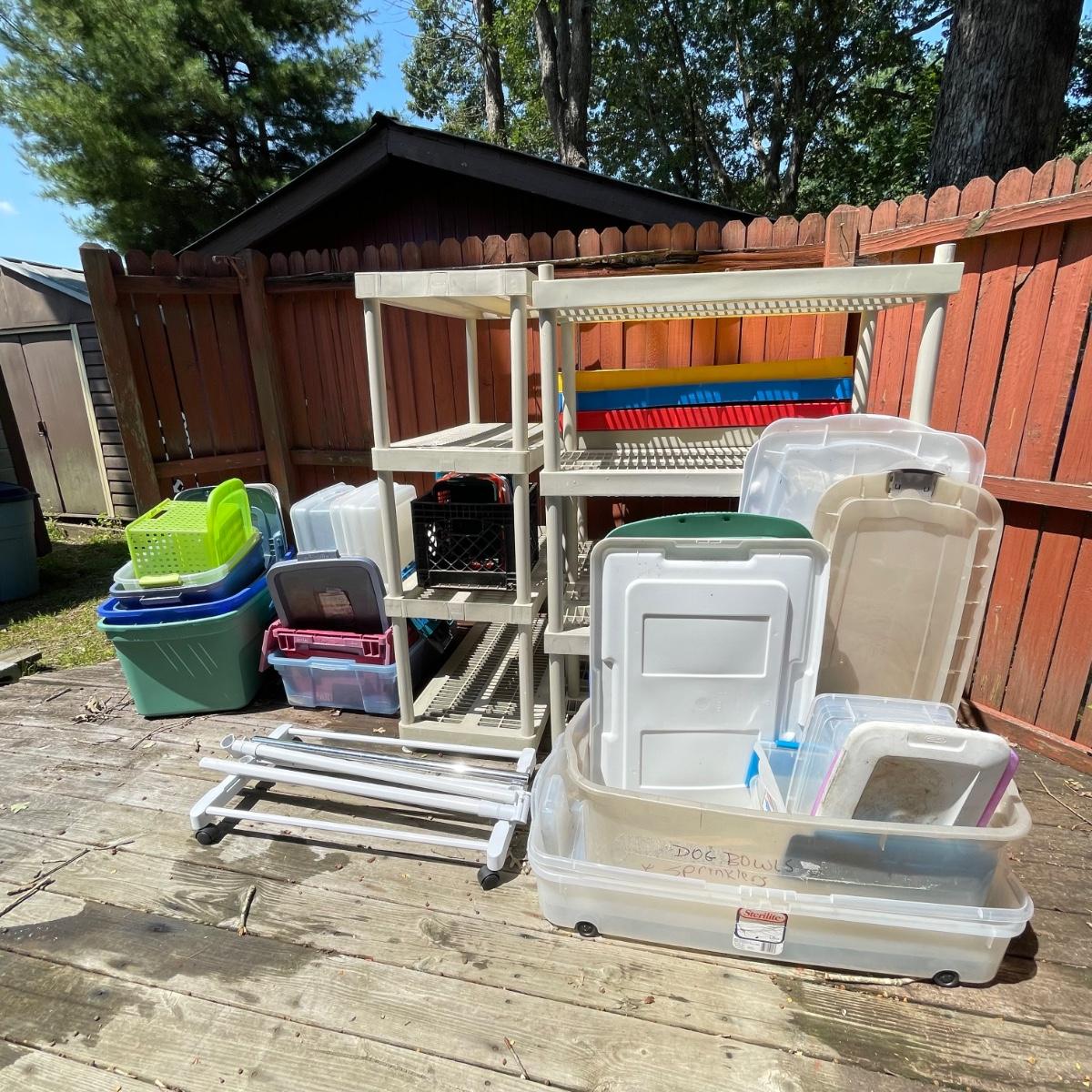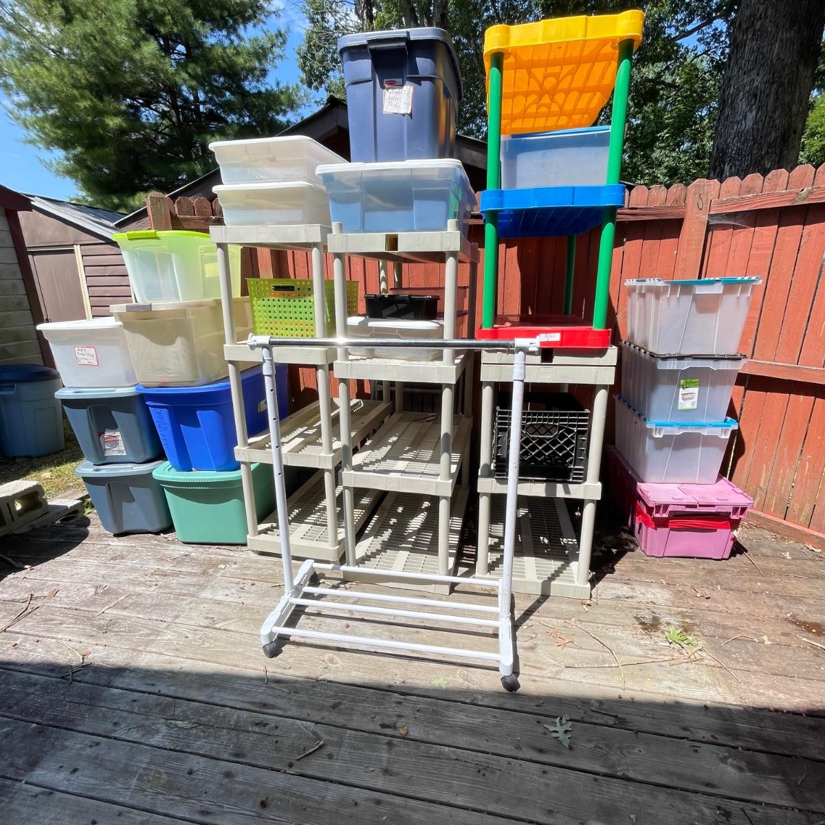 Large lot of storage bins, storage solutions and shelf units. Four portable shelf units - 3 are Keter brand and one colorful shelf. Colorful shelf is 36” x 17.5” x 38”H. The Keter shelves include 12 shelves and 32 poles. Each shelf measures 36” x 17.75”. Lot includes an adjustable rolling clothing rack - this rack extends as high as 36” x 68.5”H. Eight colorful baskets plus a heavy duty milk crate are included along with a large variety of lidded bins. 11 large cube/rectangle bins, two large under bed storage (one with wheels) and six smaller lidded bins. Brands include Rubbermaid, Sterilite and Contico. Lot items have spent time outdoors and need some cleaning. Known blemishes are shown in photos. See images. Winning bidder is required to take entire lot, please take vehicle size into consideration. Colorful shelves have been dismantled, winner must dismantle Keter shelves if desired. Local pick up only.