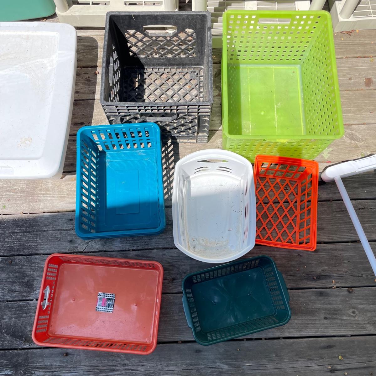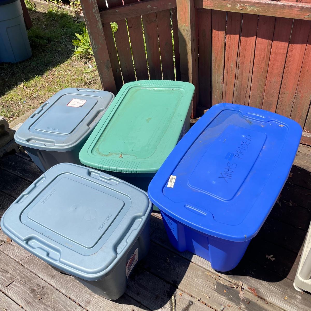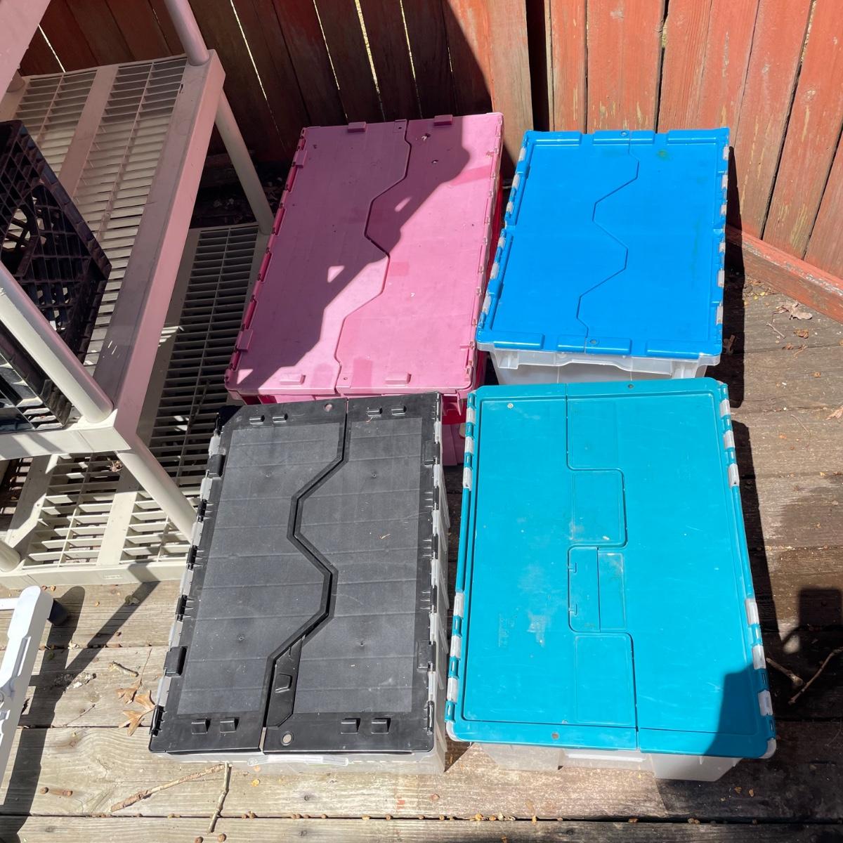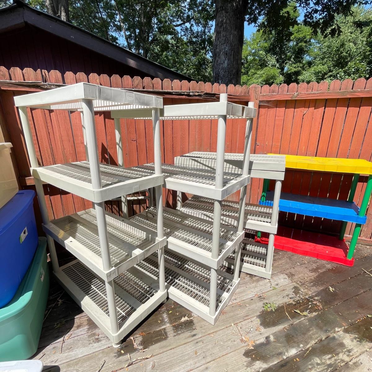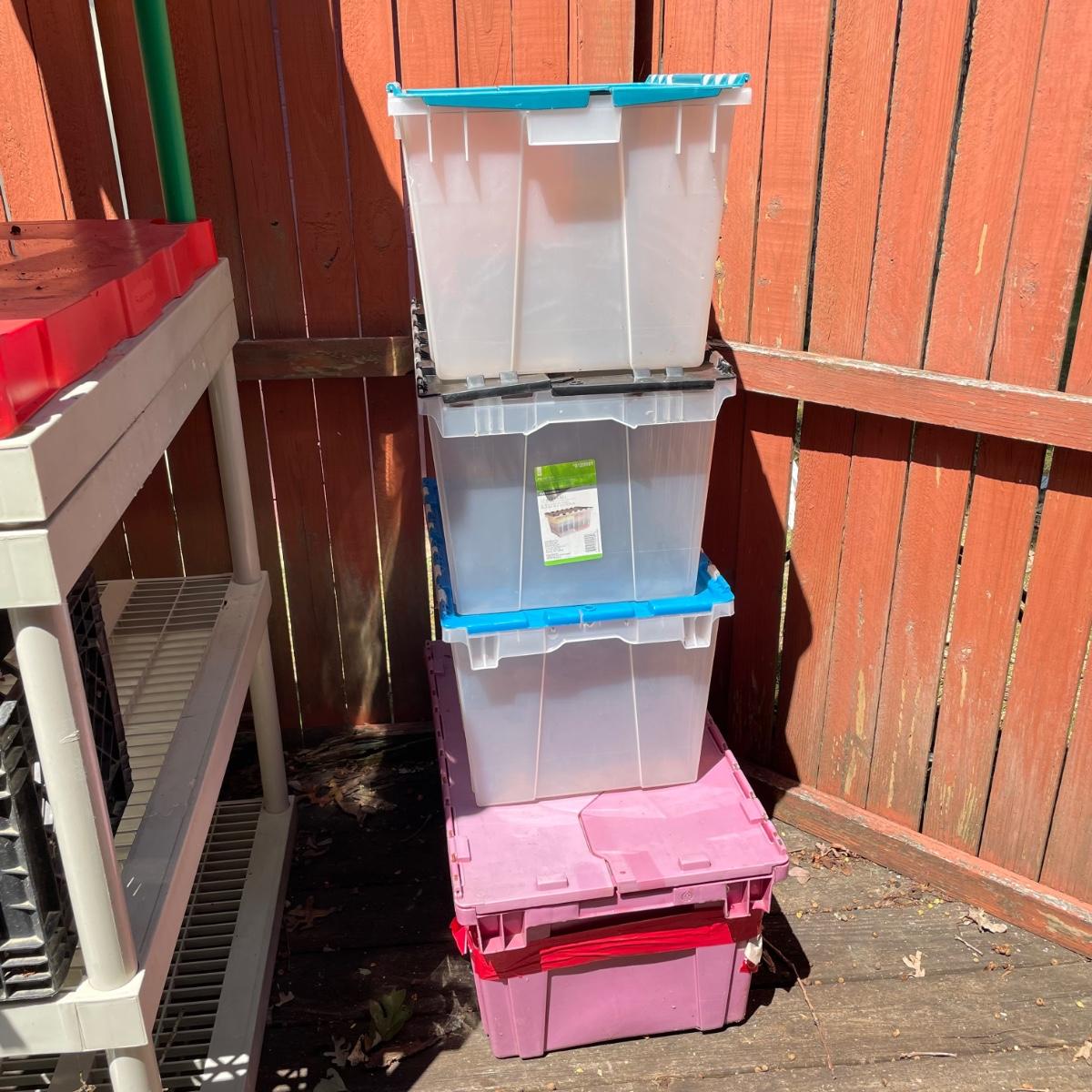 Large lot of storage bins, storage solutions and shelf units. Four portable shelf units - 3 are Keter brand and one colorful shelf. Colorful shelf is 36” x 17.5” x 38”H. The Keter shelves include 12 shelves and 32 poles. Each shelf measures 36” x 17.75”. Lot includes an adjustable rolling clothing rack - this rack extends as high as 36” x 68.5”H. Eight colorful baskets plus a heavy duty milk crate are included along with a large variety of lidded bins. 11 large cube/rectangle bins, two large under bed storage (one with wheels) and six smaller lidded bins. Brands include Rubbermaid, Sterilite and Contico. Lot items have spent time outdoors and need some cleaning. Known blemishes are shown in photos. See images. Winning bidder is required to take entire lot, please take vehicle size into consideration. Colorful shelves have been dismantled, winner must dismantle Keter shelves if desired. Local pick up only.