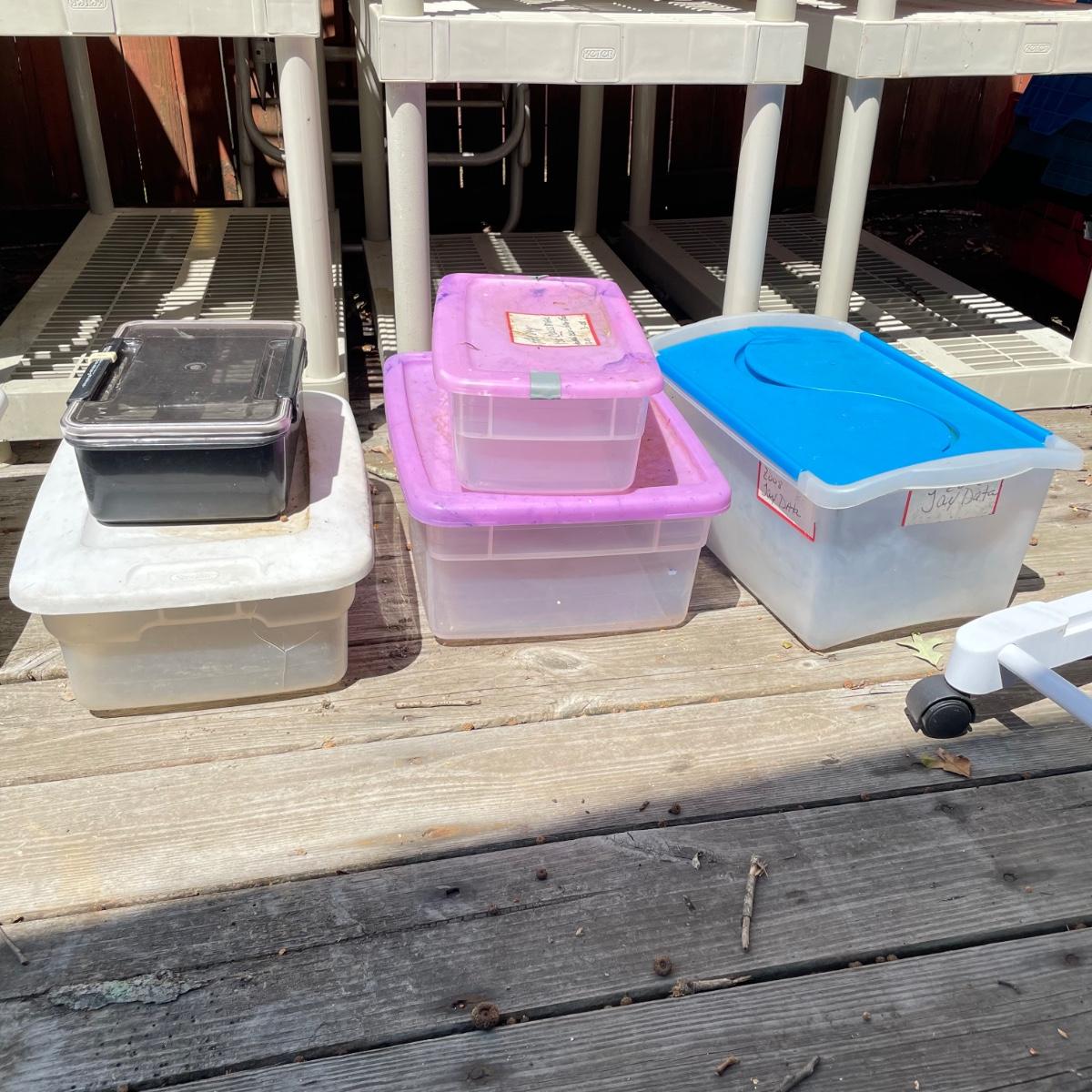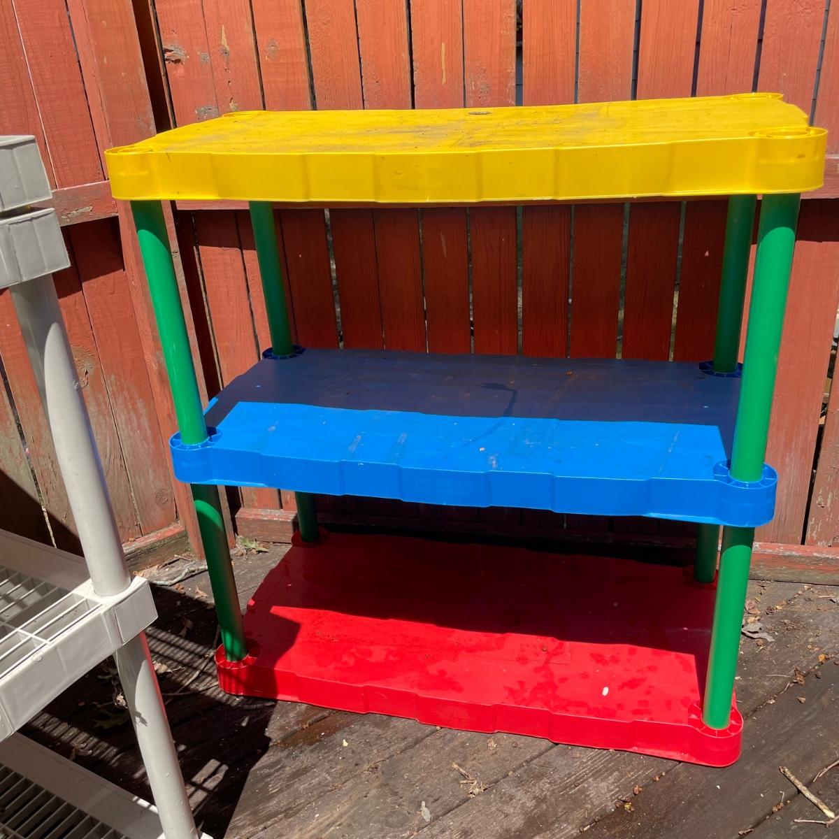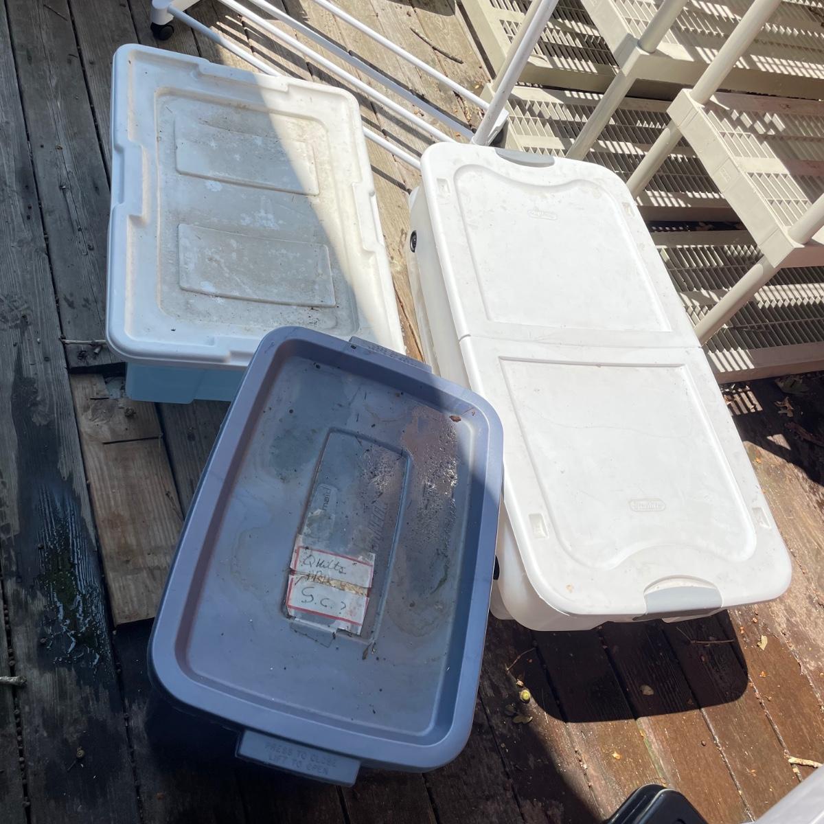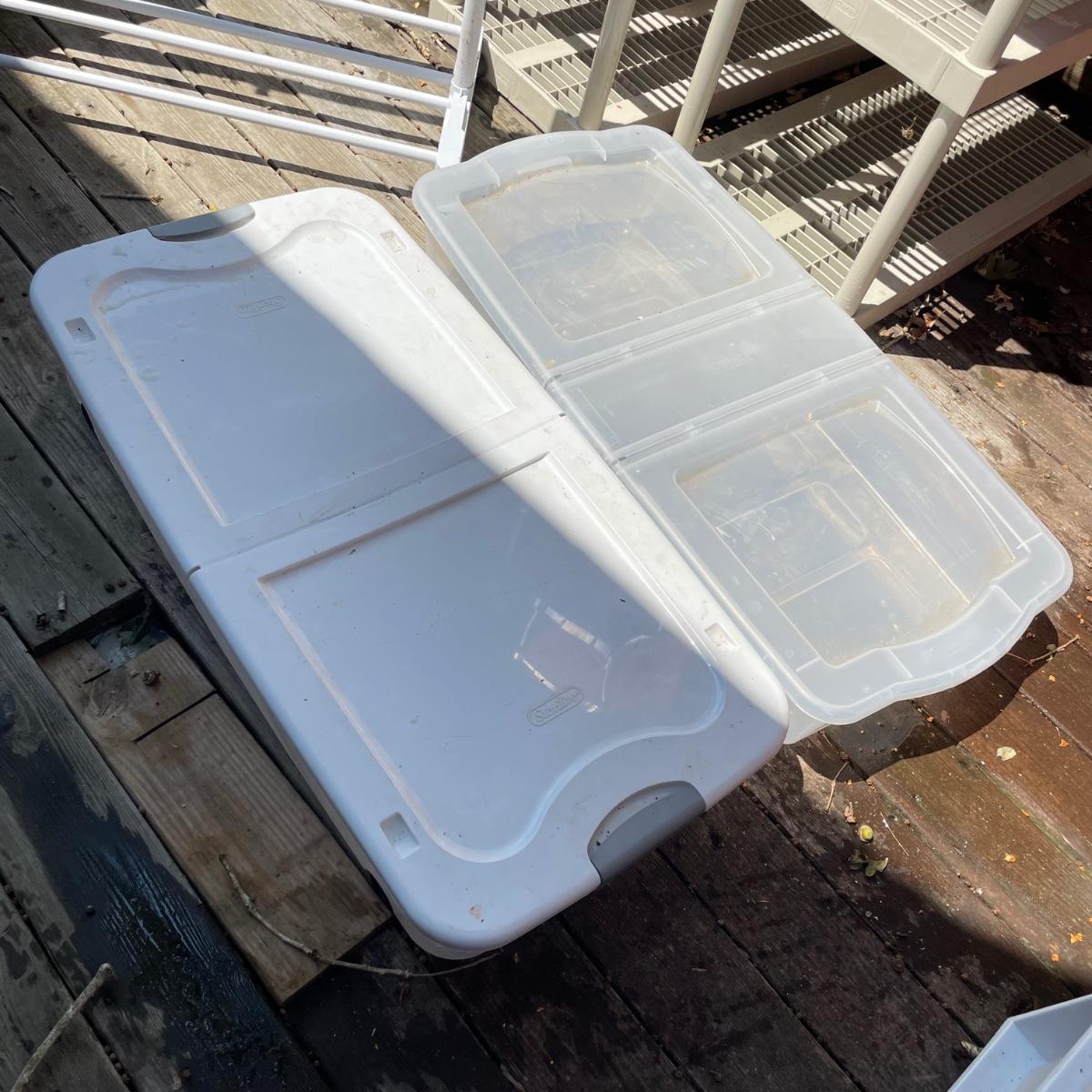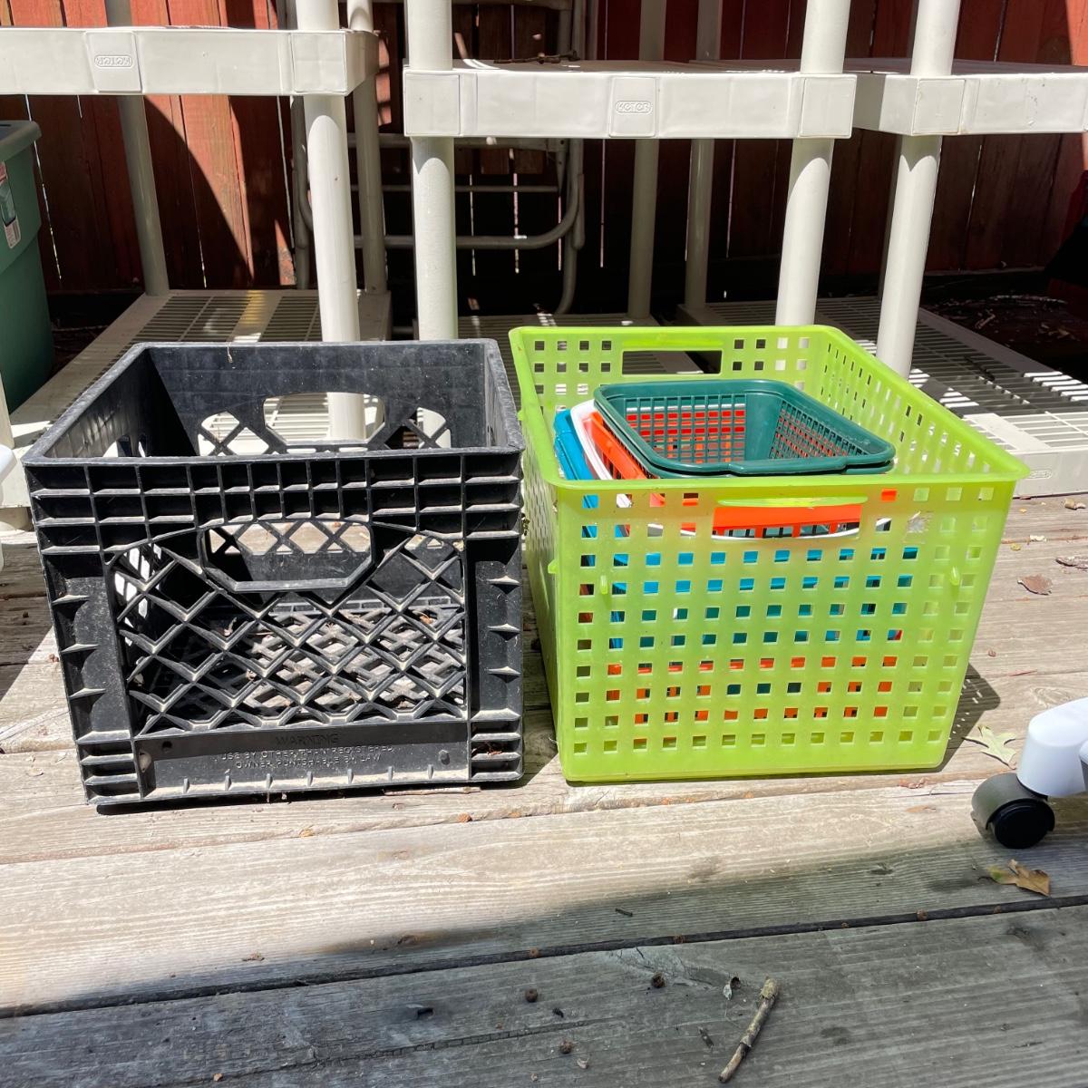 Large lot of storage bins, storage solutions and shelf units. Four portable shelf units - 3 are Keter brand and one colorful shelf. Colorful shelf is 36” x 17.5” x 38”H. The Keter shelves include 12 shelves and 32 poles. Each shelf measures 36” x 17.75”. Lot includes an adjustable rolling clothing rack - this rack extends as high as 36” x 68.5”H. Eight colorful baskets plus a heavy duty milk crate are included along with a large variety of lidded bins. 11 large cube/rectangle bins, two large under bed storage (one with wheels) and six smaller lidded bins. Brands include Rubbermaid, Sterilite and Contico. Lot items have spent time outdoors and need some cleaning. Known blemishes are shown in photos. See images. Winning bidder is required to take entire lot, please take vehicle size into consideration. Colorful shelves have been dismantled, winner must dismantle Keter shelves if desired. Local pick up only.