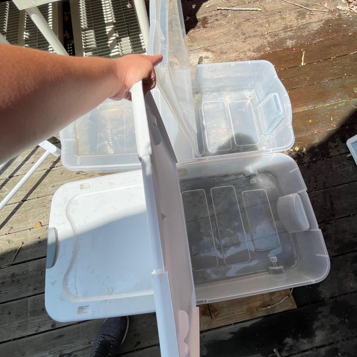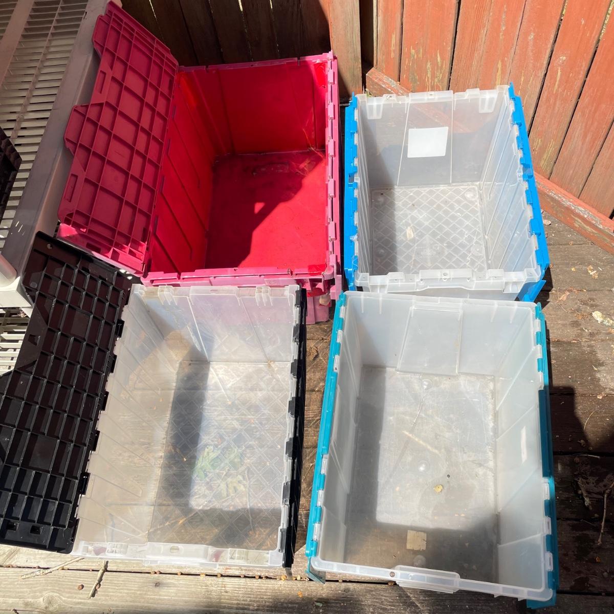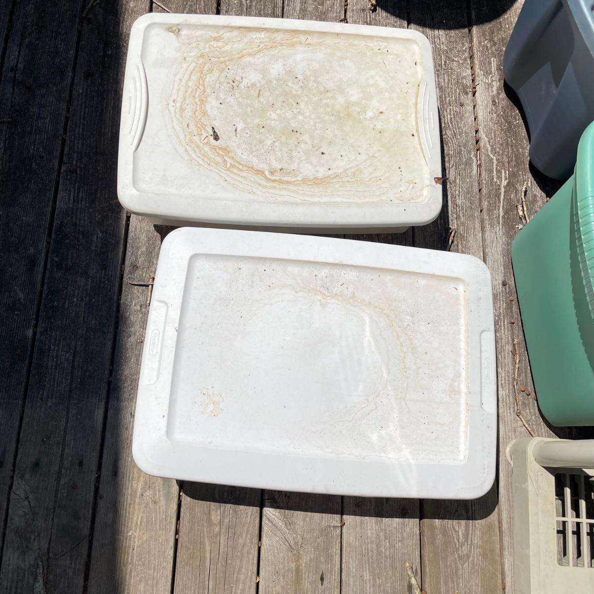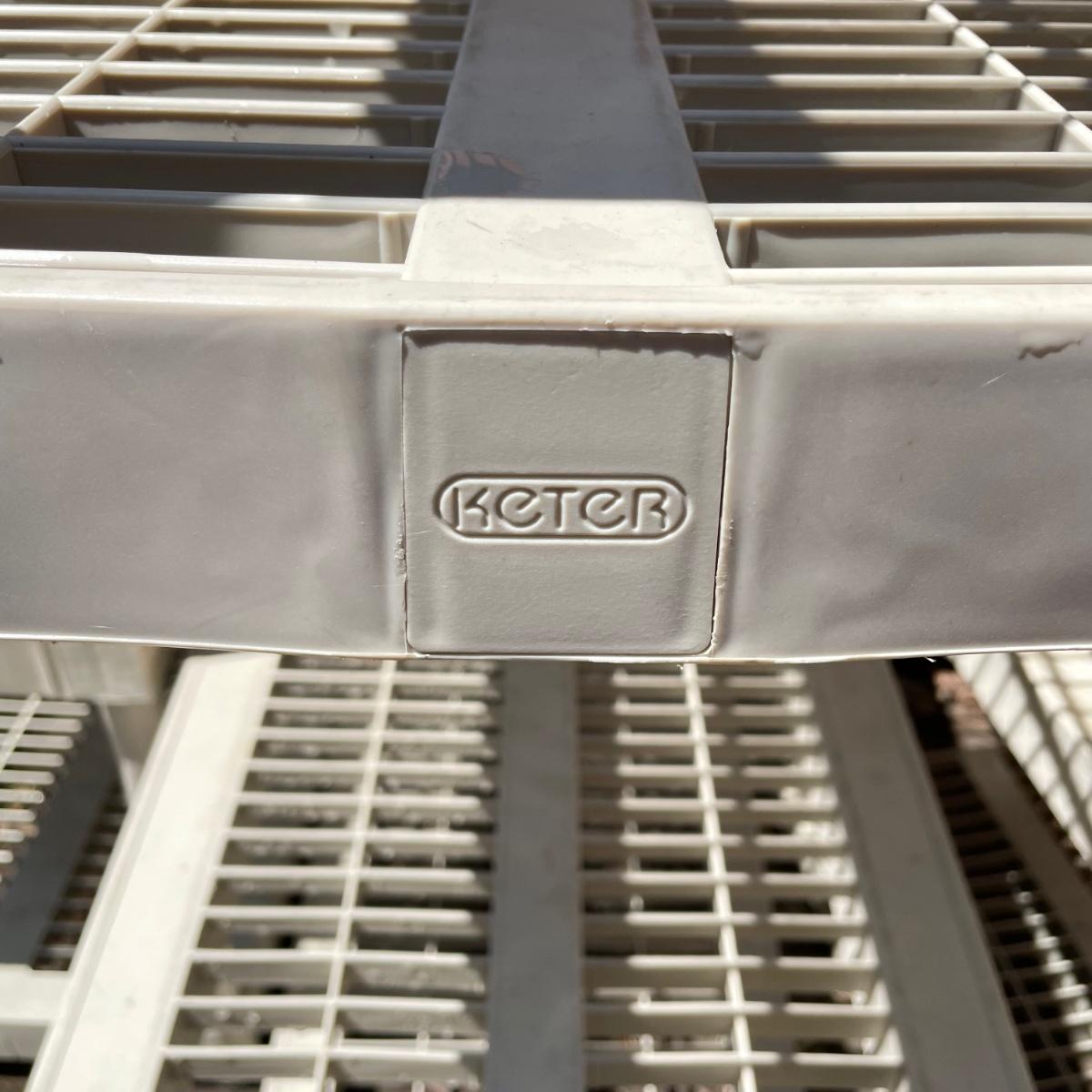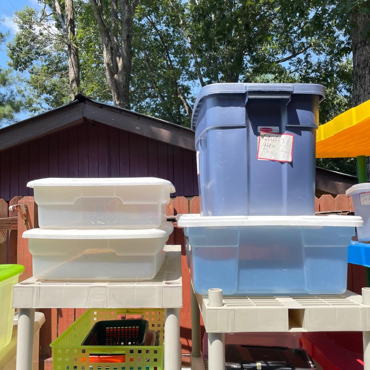 Large lot of storage bins, storage solutions and shelf units. Four portable shelf units - 3 are Keter brand and one colorful shelf. Colorful shelf is 36” x 17.5” x 38”H. The Keter shelves include 12 shelves and 32 poles. Each shelf measures 36” x 17.75”. Lot includes an adjustable rolling clothing rack - this rack extends as high as 36” x 68.5”H. Eight colorful baskets plus a heavy duty milk crate are included along with a large variety of lidded bins. 11 large cube/rectangle bins, two large under bed storage (one with wheels) and six smaller lidded bins. Brands include Rubbermaid, Sterilite and Contico. Lot items have spent time outdoors and need some cleaning. Known blemishes are shown in photos. See images. Winning bidder is required to take entire lot, please take vehicle size into consideration. Colorful shelves have been dismantled, winner must dismantle Keter shelves if desired. Local pick up only.