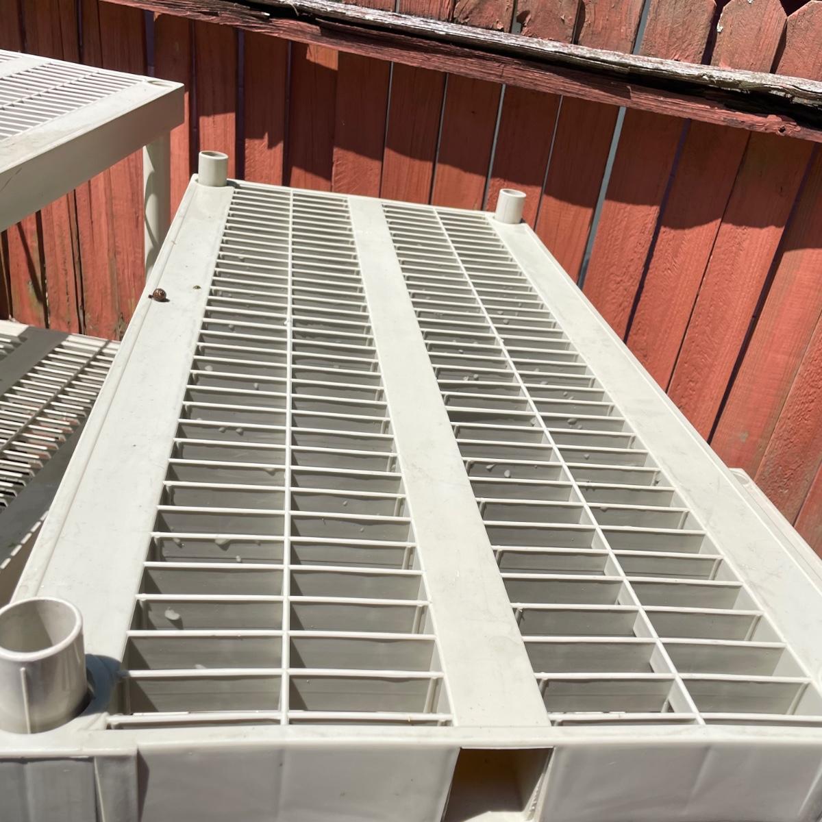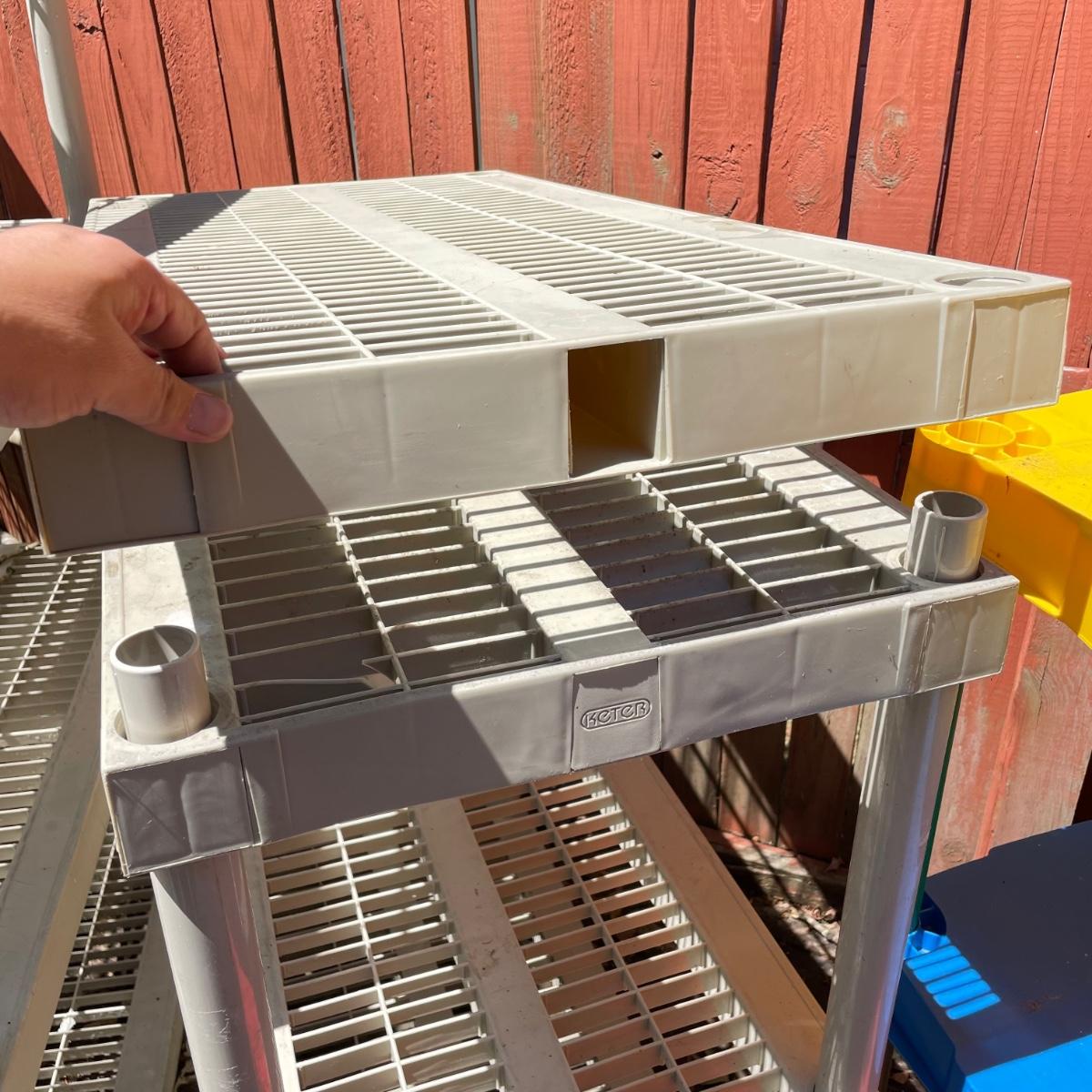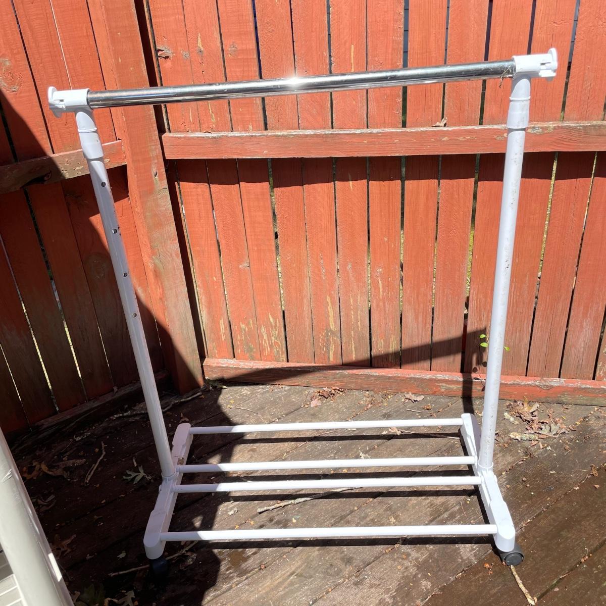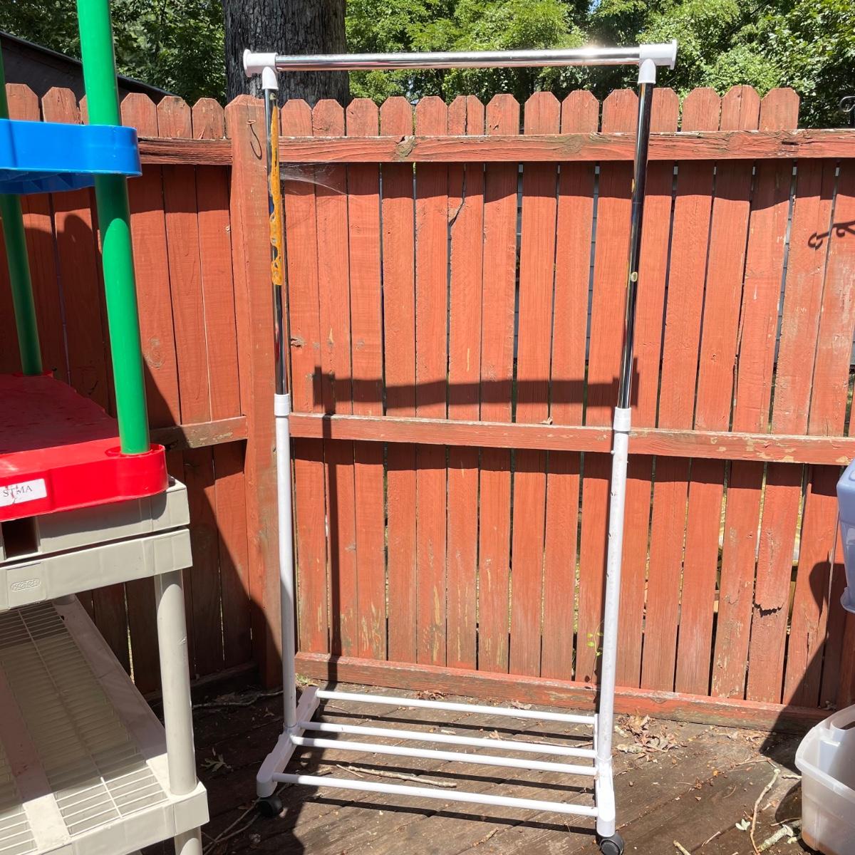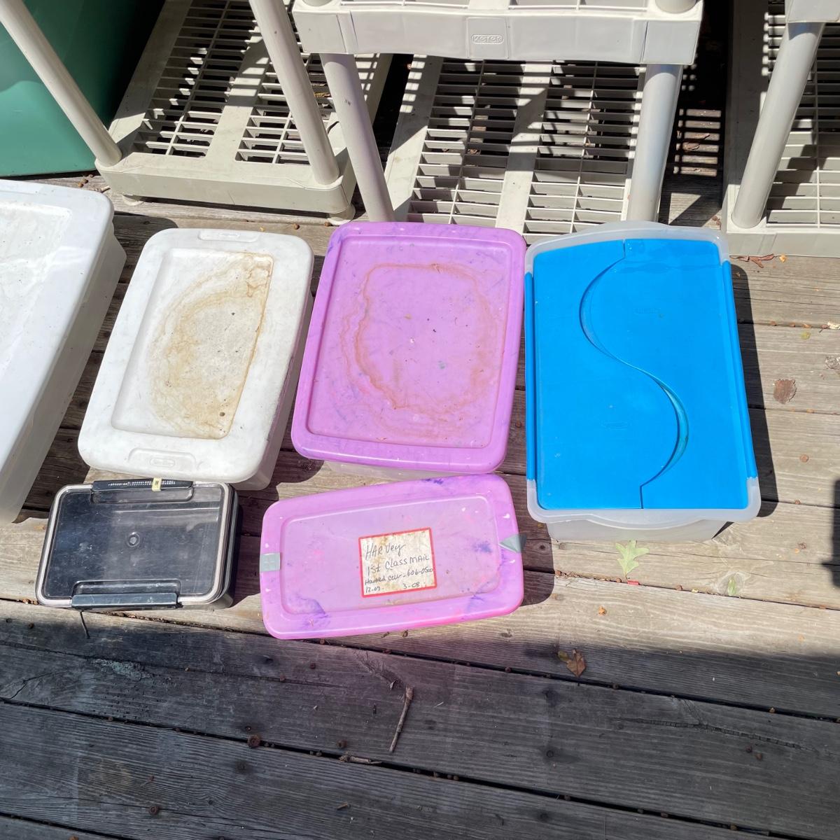 Large lot of storage bins, storage solutions and shelf units. Four portable shelf units - 3 are Keter brand and one colorful shelf. Colorful shelf is 36” x 17.5” x 38”H. The Keter shelves include 12 shelves and 32 poles. Each shelf measures 36” x 17.75”. Lot includes an adjustable rolling clothing rack - this rack extends as high as 36” x 68.5”H. Eight colorful baskets plus a heavy duty milk crate are included along with a large variety of lidded bins. 11 large cube/rectangle bins, two large under bed storage (one with wheels) and six smaller lidded bins. Brands include Rubbermaid, Sterilite and Contico. Lot items have spent time outdoors and need some cleaning. Known blemishes are shown in photos. See images. Winning bidder is required to take entire lot, please take vehicle size into consideration. Colorful shelves have been dismantled, winner must dismantle Keter shelves if desired. Local pick up only.