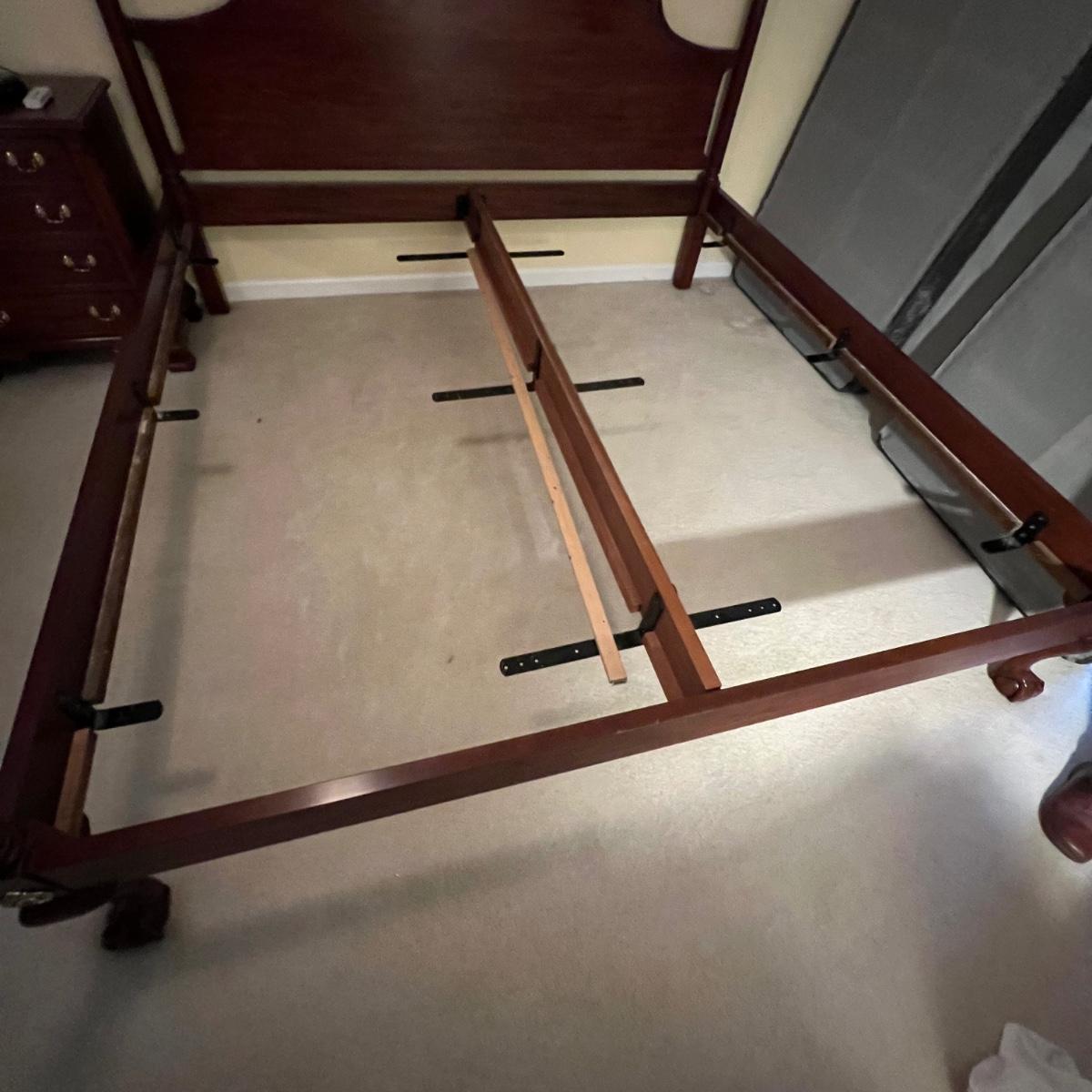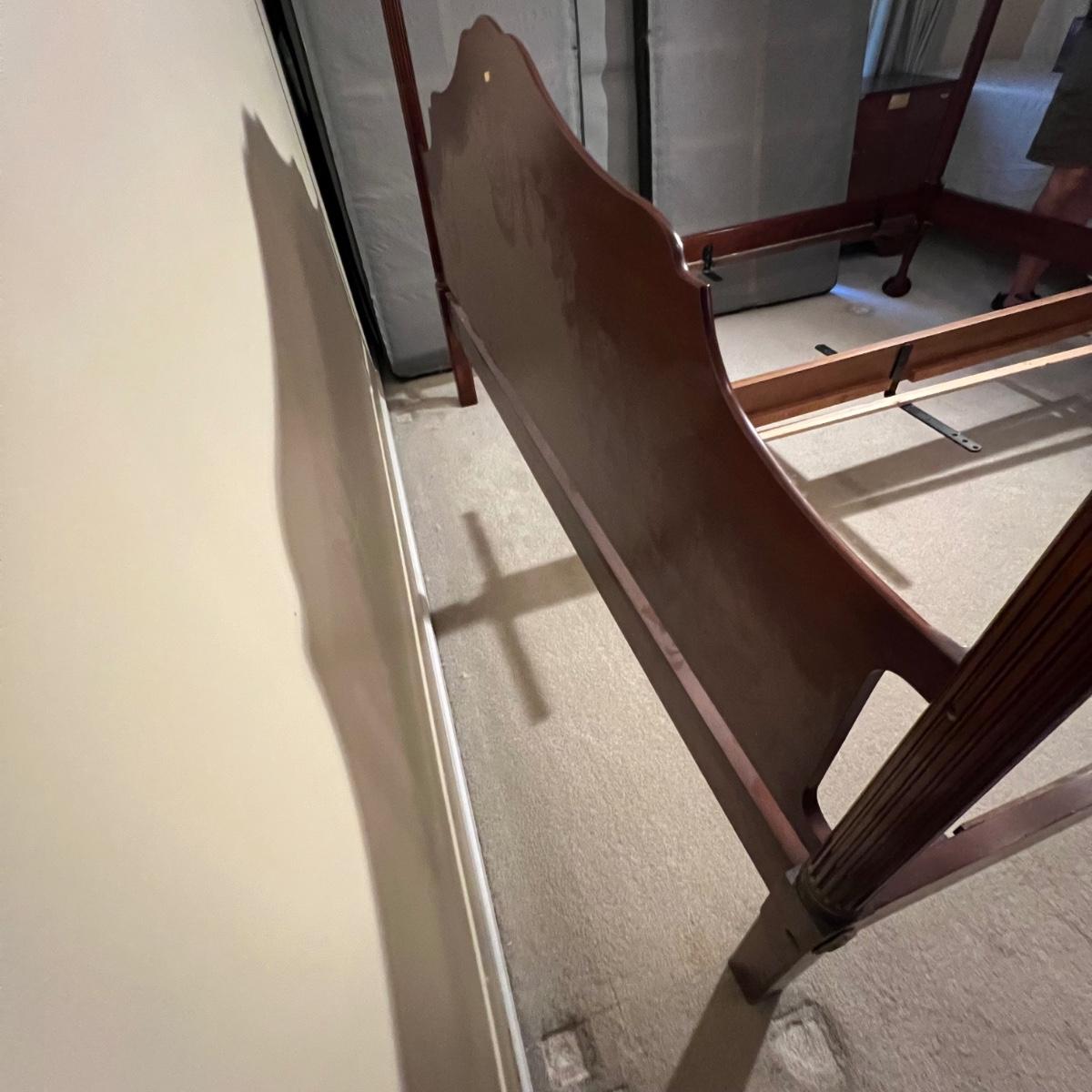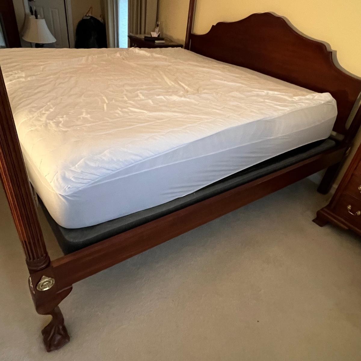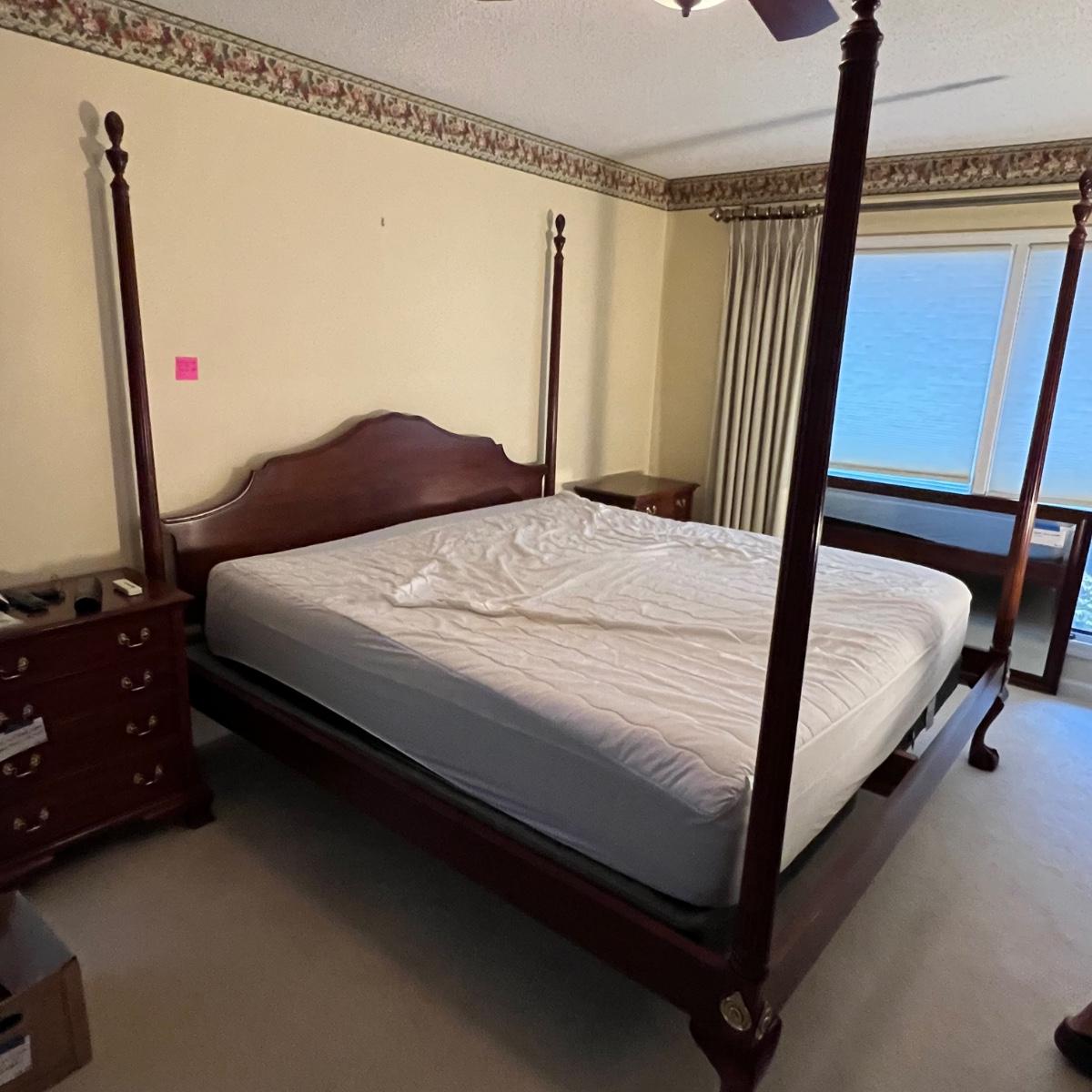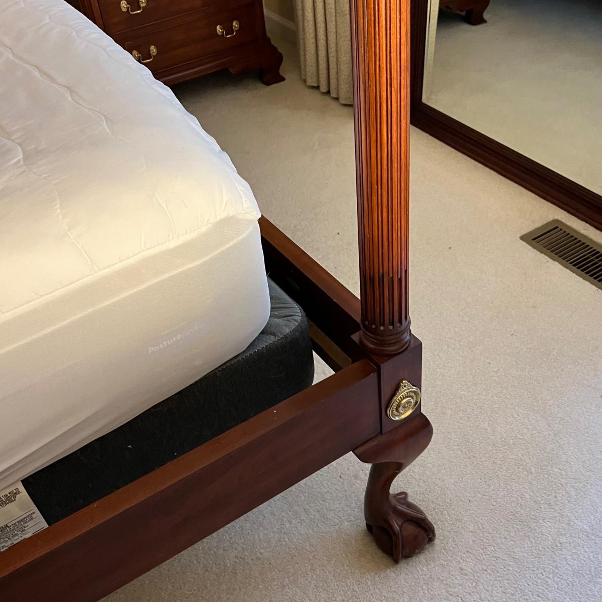 This elegant four poster bed is a rich mid-toned solid wood; it appears to match the Henkel Harris pieces in this sale but as no mfg label was found we cannot authenticate it. The winning bidder will be responsible for taking this down, a hex key and Phillips head screwdriver will be needed. The Posturepedic mattress and box springs are available to the winner if desired.