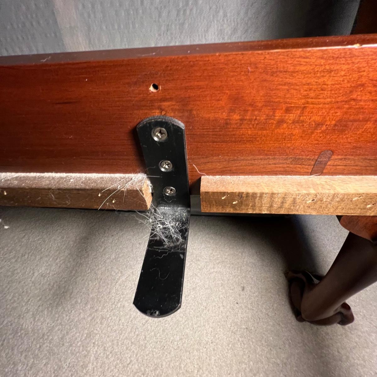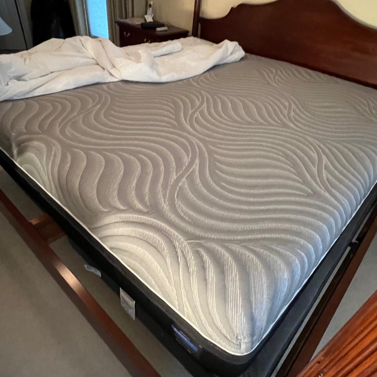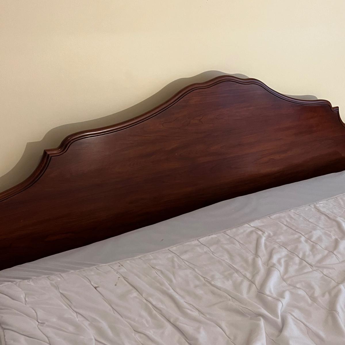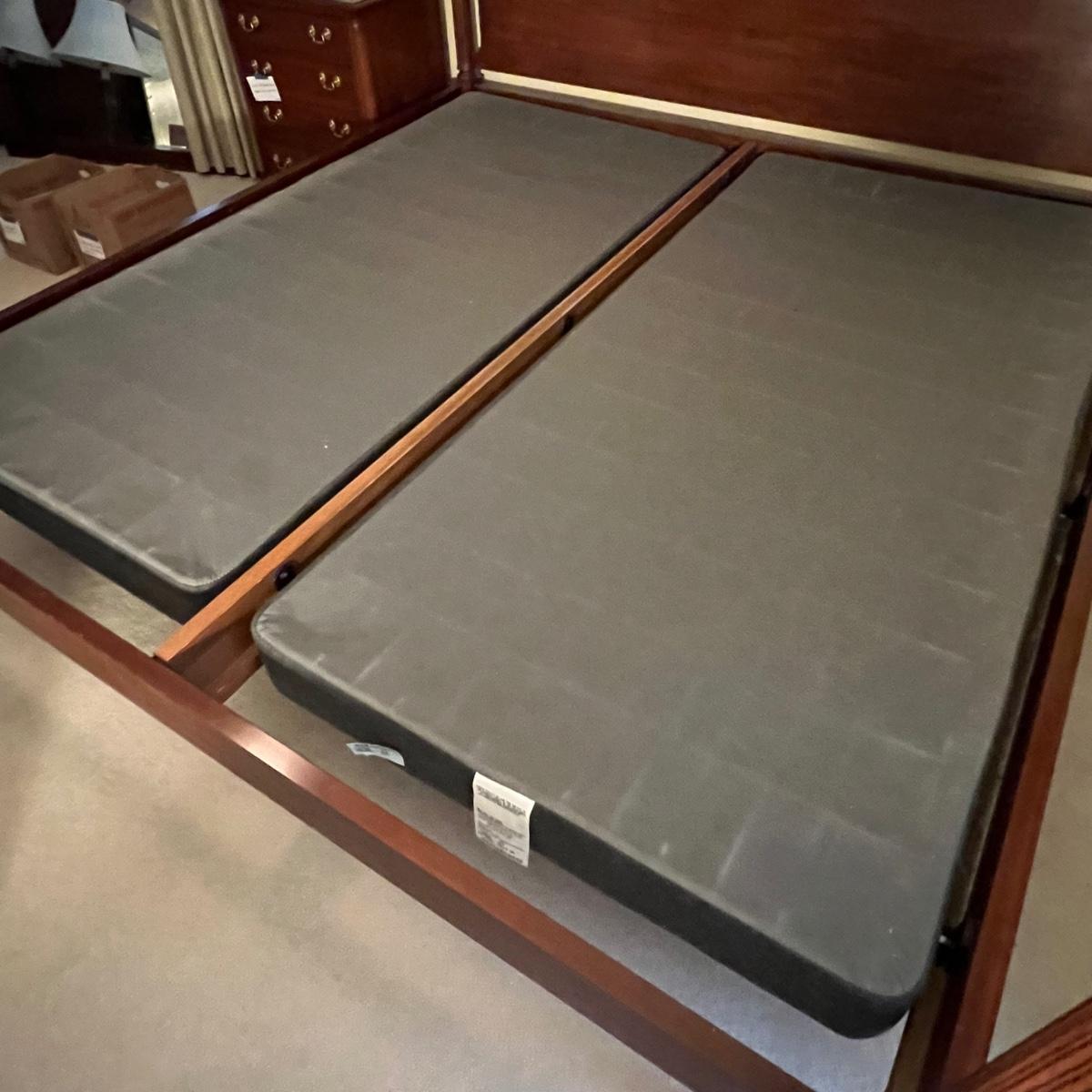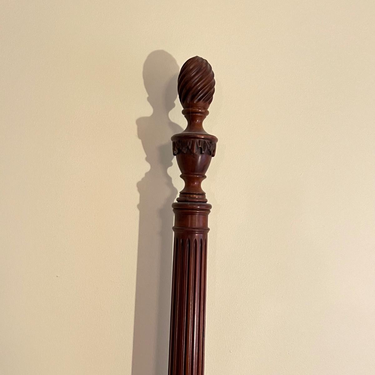 This elegant four poster bed is a rich mid-toned solid wood; it appears to match the Henkel Harris pieces in this sale but as no mfg label was found we cannot authenticate it. The winning bidder will be responsible for taking this down, a hex key and Phillips head screwdriver will be needed. The Posturepedic mattress and box springs are available to the winner if desired.