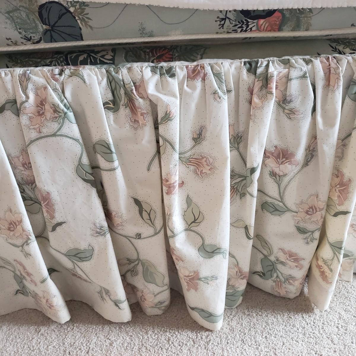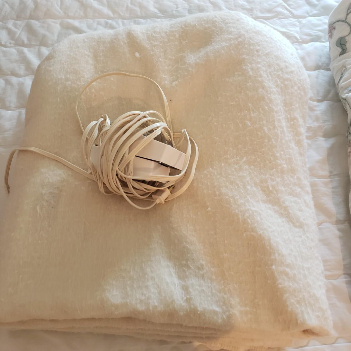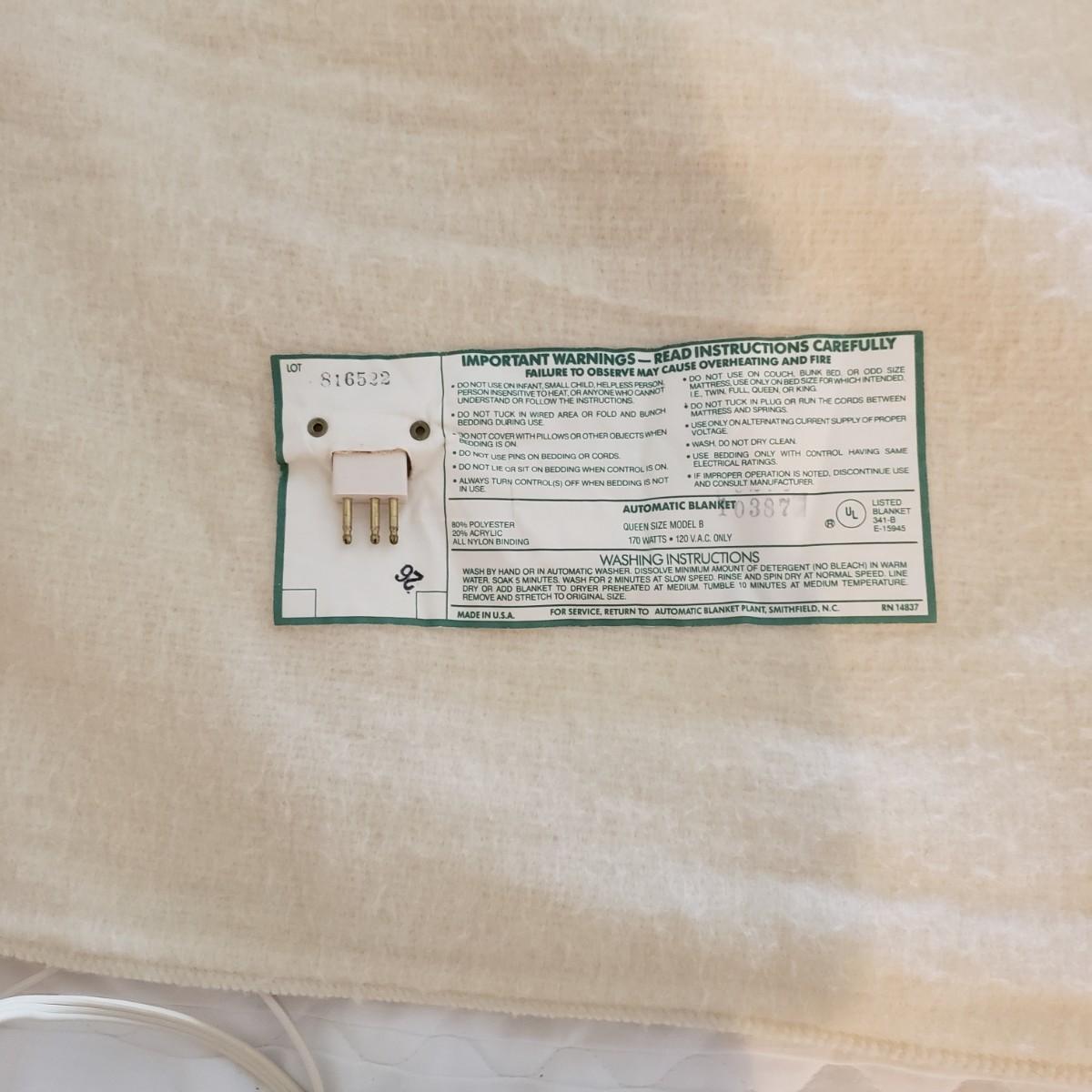 This four poster double size bed measures 57" x 77" x 67"H. The height is each of the four posts. The bed comes with a bed skirt and matching double comforter. The comforter is a cotton blend and quilted. The electric blanket is a cream color and comes with two cords and is a double size. Both cords power on when plugged in. The bed rails are slotted to get apart, see picture although it may be hard to see the slats.
