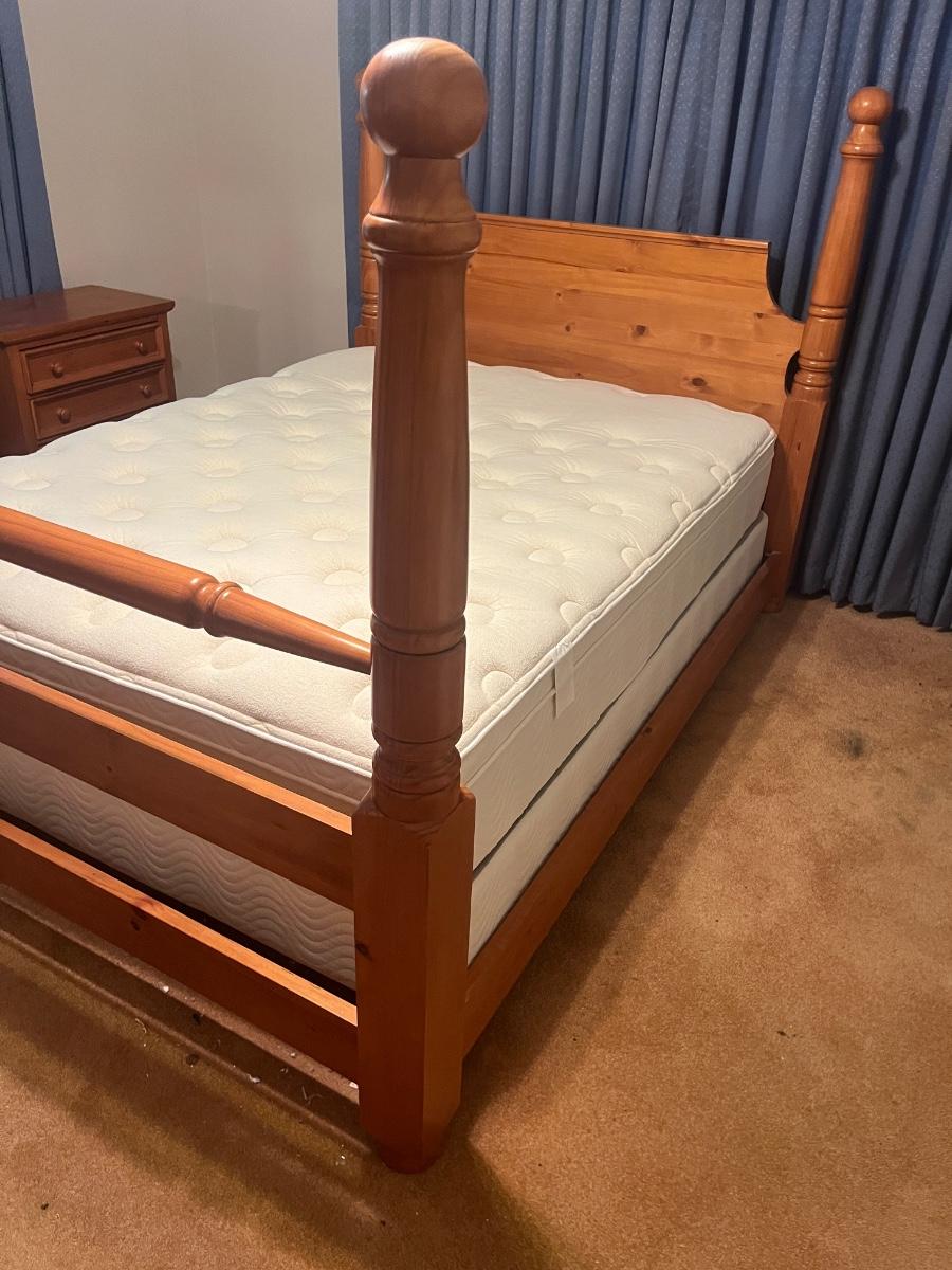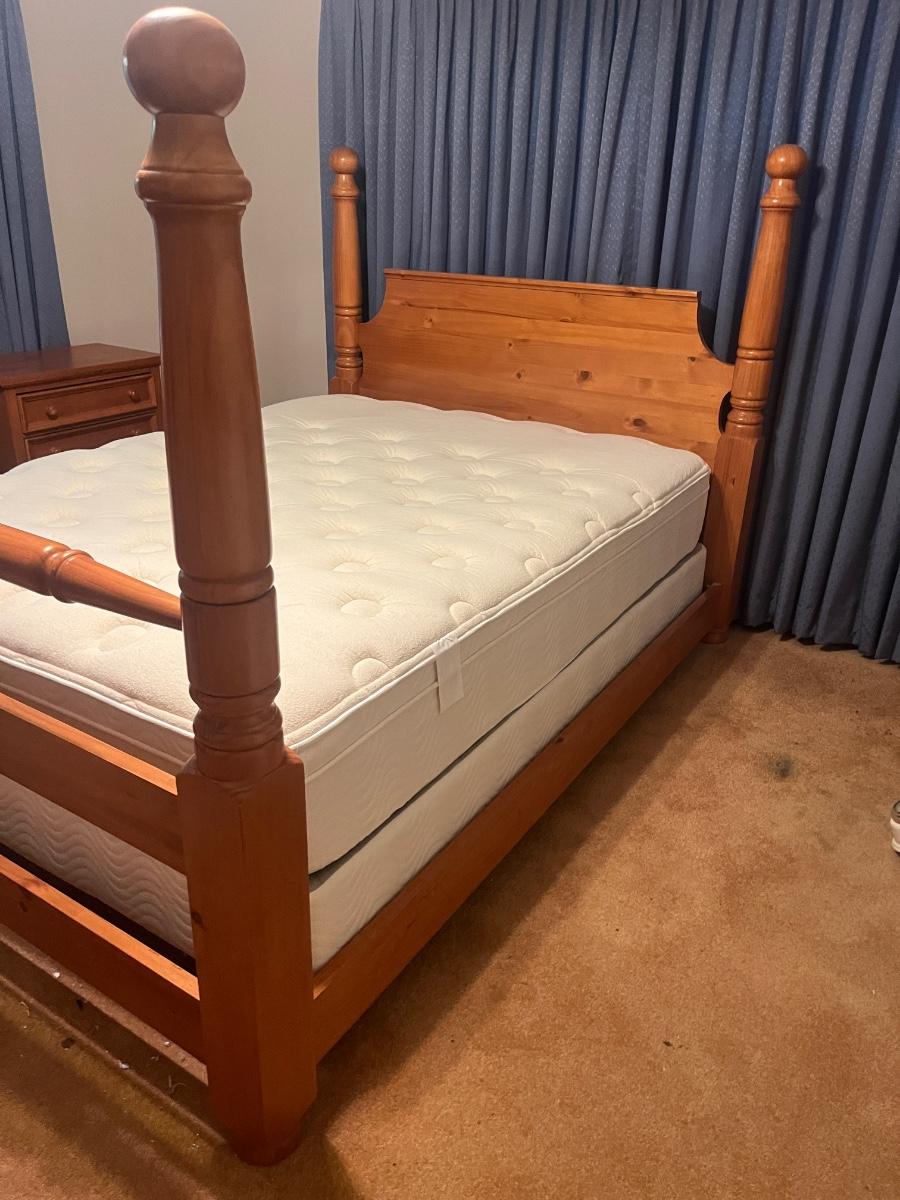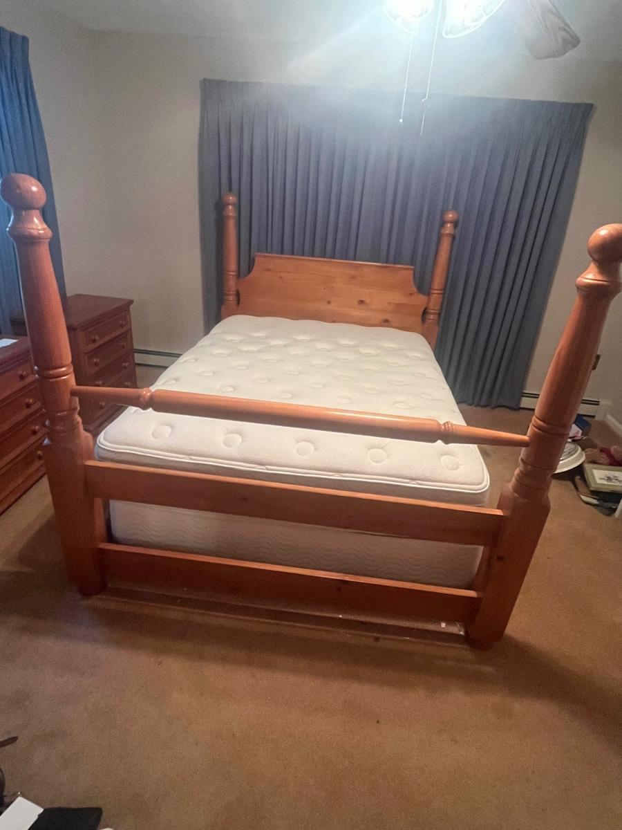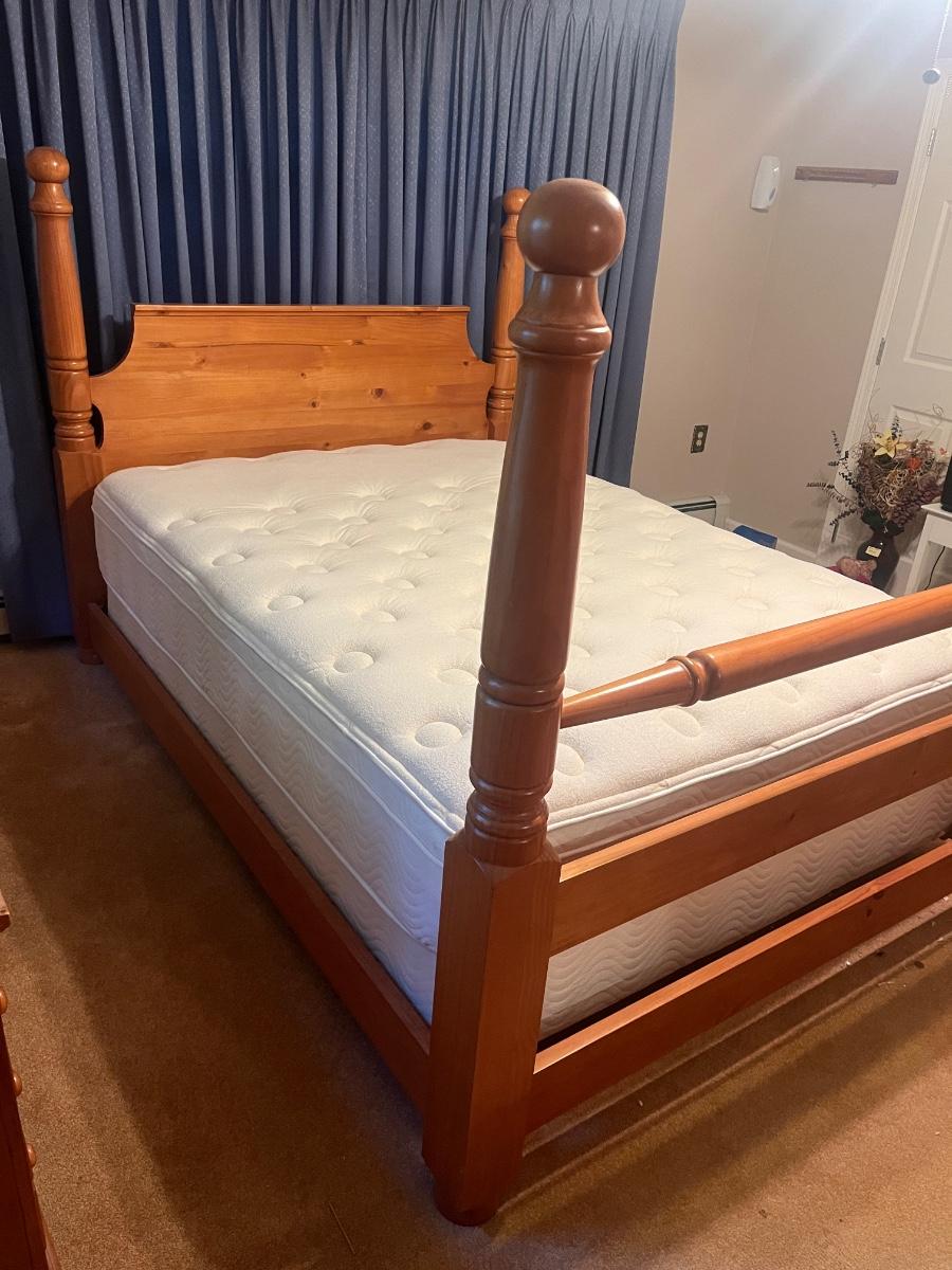 Lot includes a solid wood four poster Queen sized bed frame. Bed frame measures 66.5” x 90.5” x 59”H. The Simmons Beautyrest mattress is available to the winning bidder if desired, but the winning bidder is not required to take it. End tables are not included but available in auction. The bed frame will need to be taken apart and it appears you will need a wrench and a Phillips screwdriver, see the last two pictures.