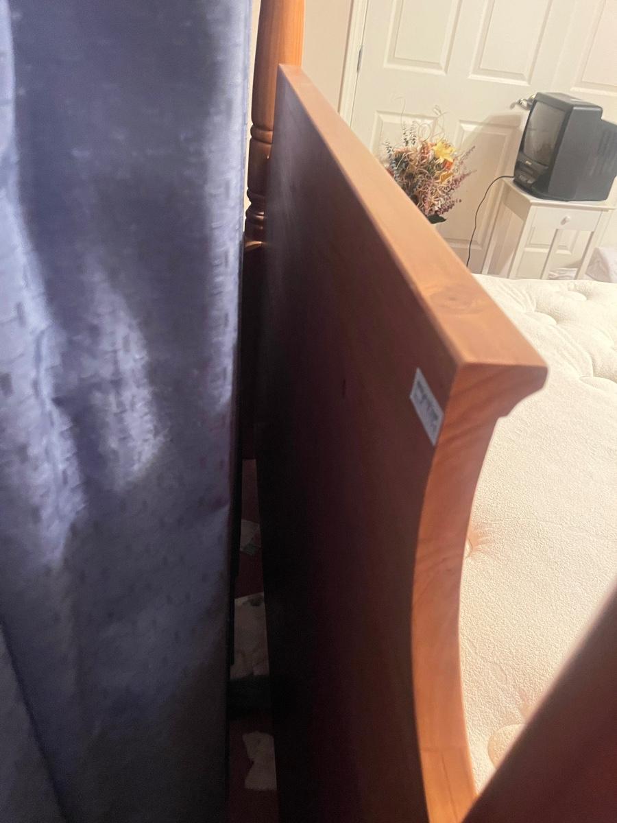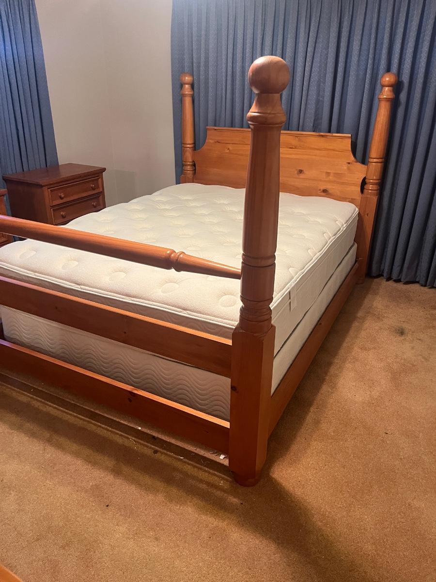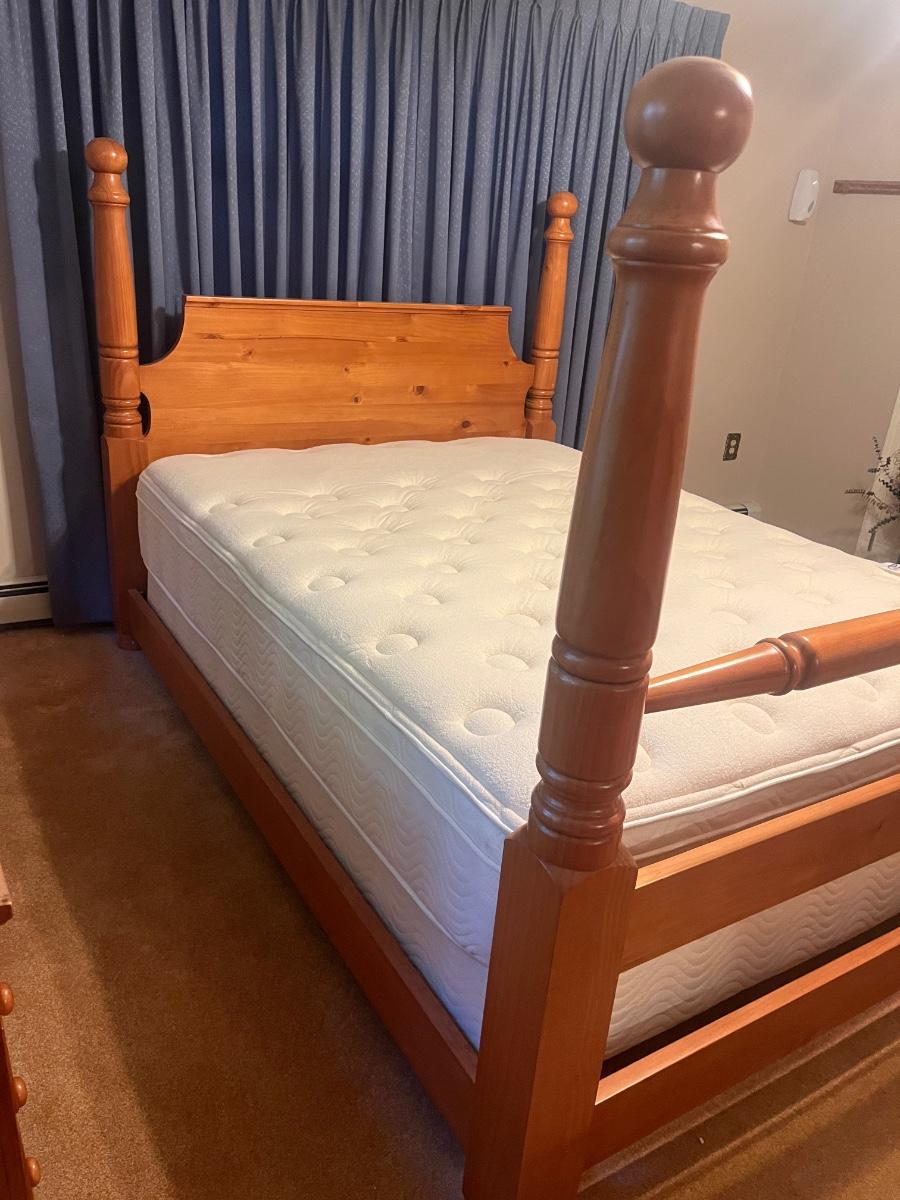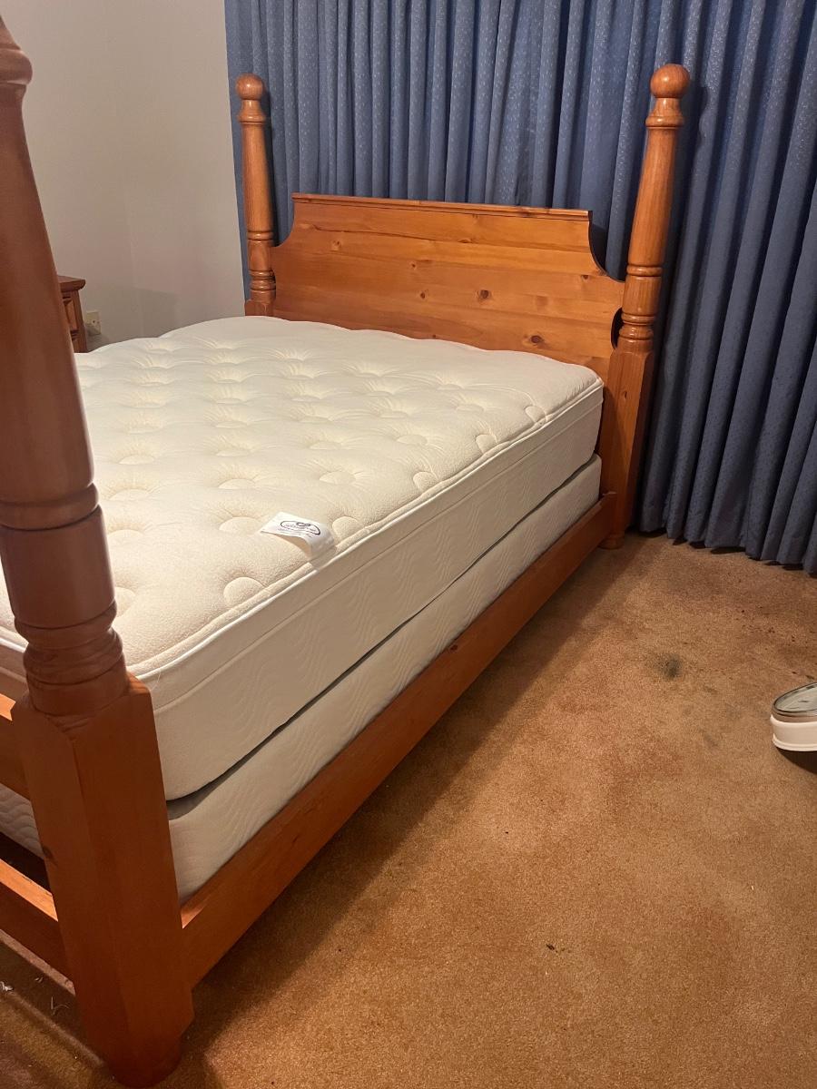 Lot includes a solid wood four poster Queen sized bed frame. Bed frame measures 66.5” x 90.5” x 59”H. The Simmons Beautyrest mattress is available to the winning bidder if desired, but the winning bidder is not required to take it. End tables are not included but available in auction. The bed frame will need to be taken apart and it appears you will need a wrench and a Phillips screwdriver, see the last two pictures.