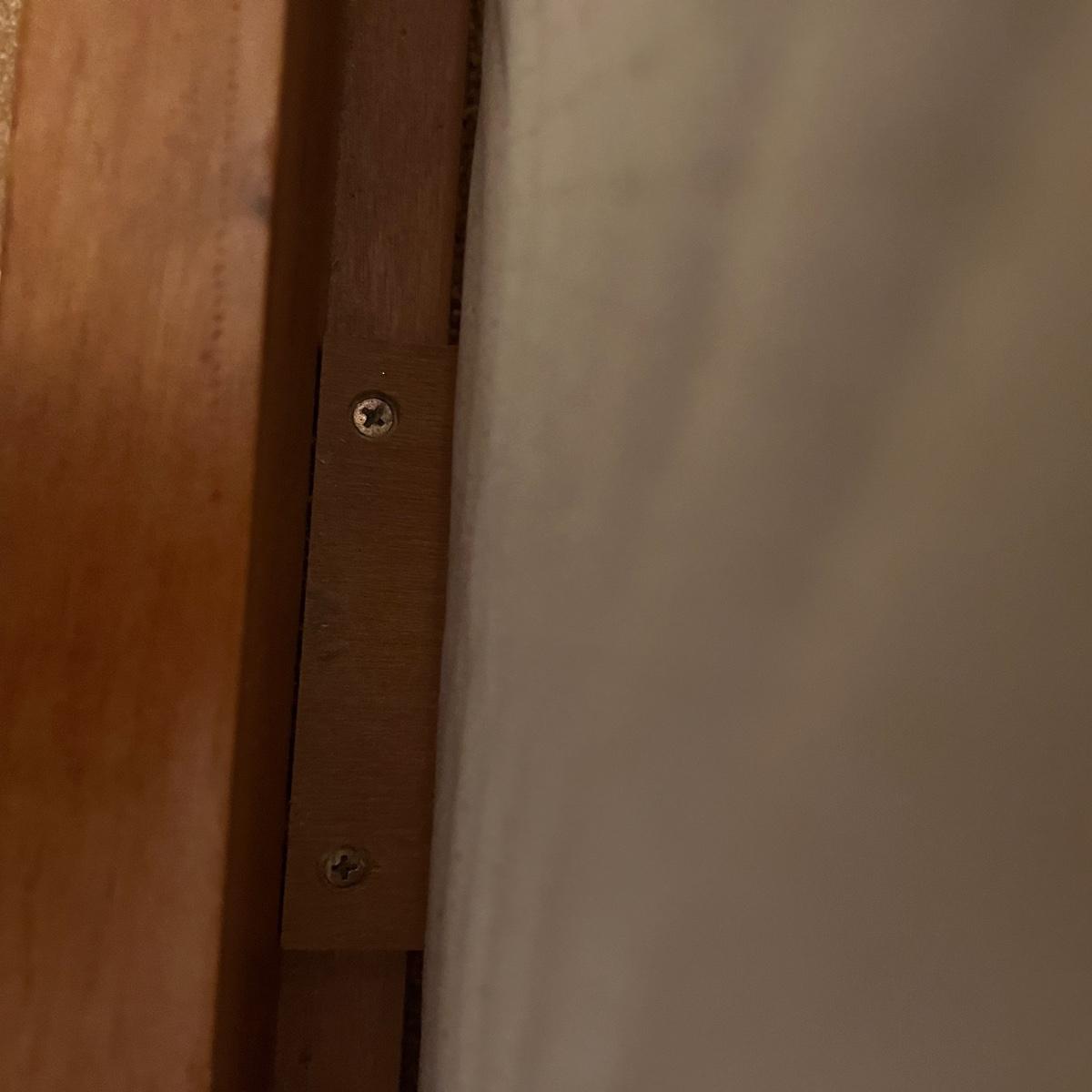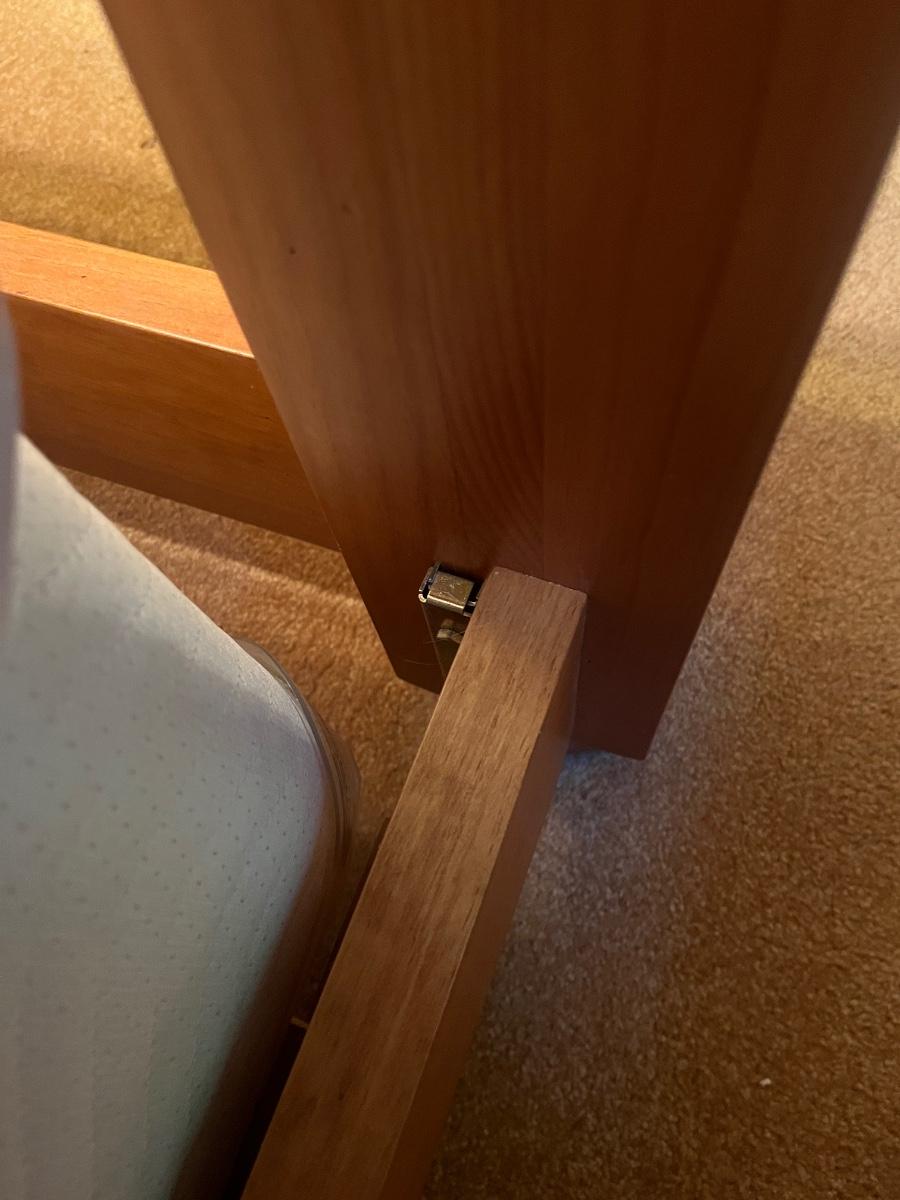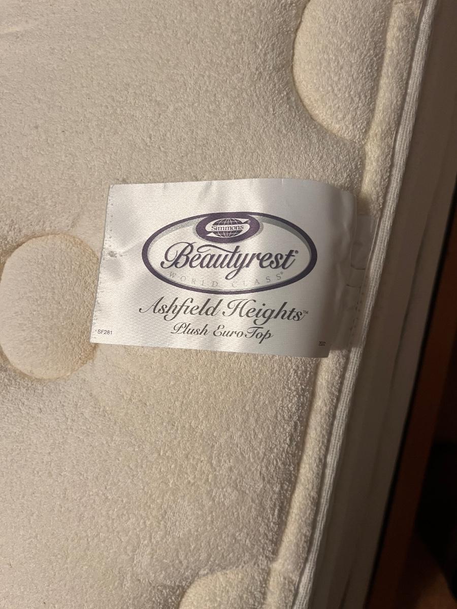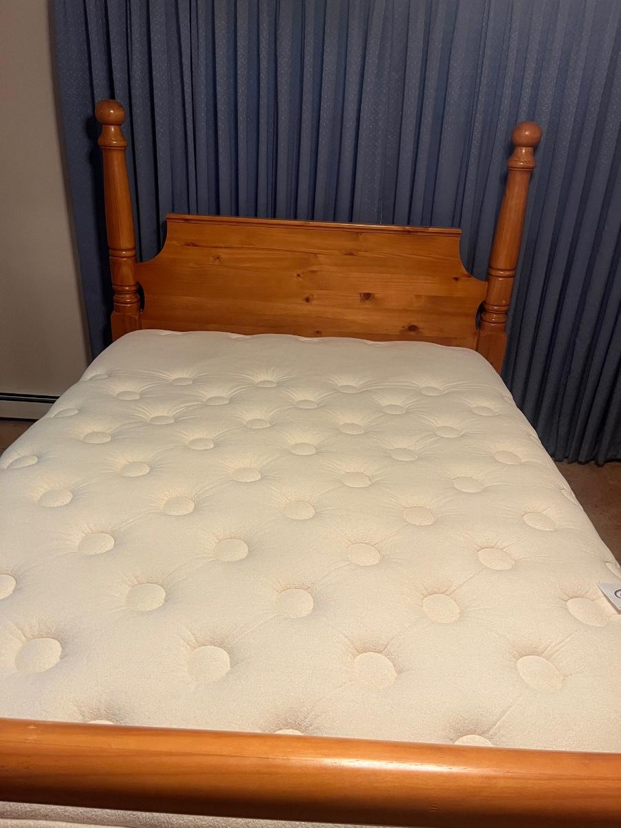 Lot includes a solid wood four poster Queen sized bed frame. Bed frame measures 66.5” x 90.5” x 59”H. The Simmons Beautyrest mattress is available to the winning bidder if desired, but the winning bidder is not required to take it. End tables are not included but available in auction. The bed frame will need to be taken apart and it appears you will need a wrench and a Phillips screwdriver, see the last two pictures.