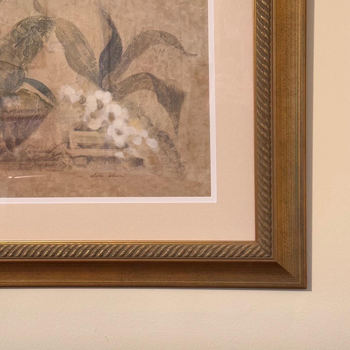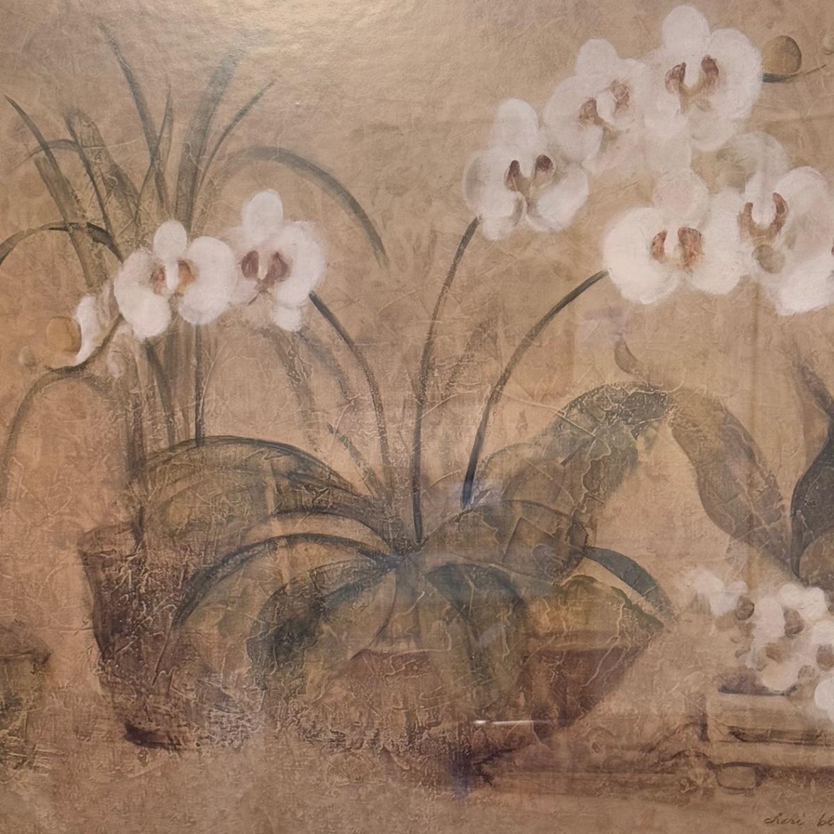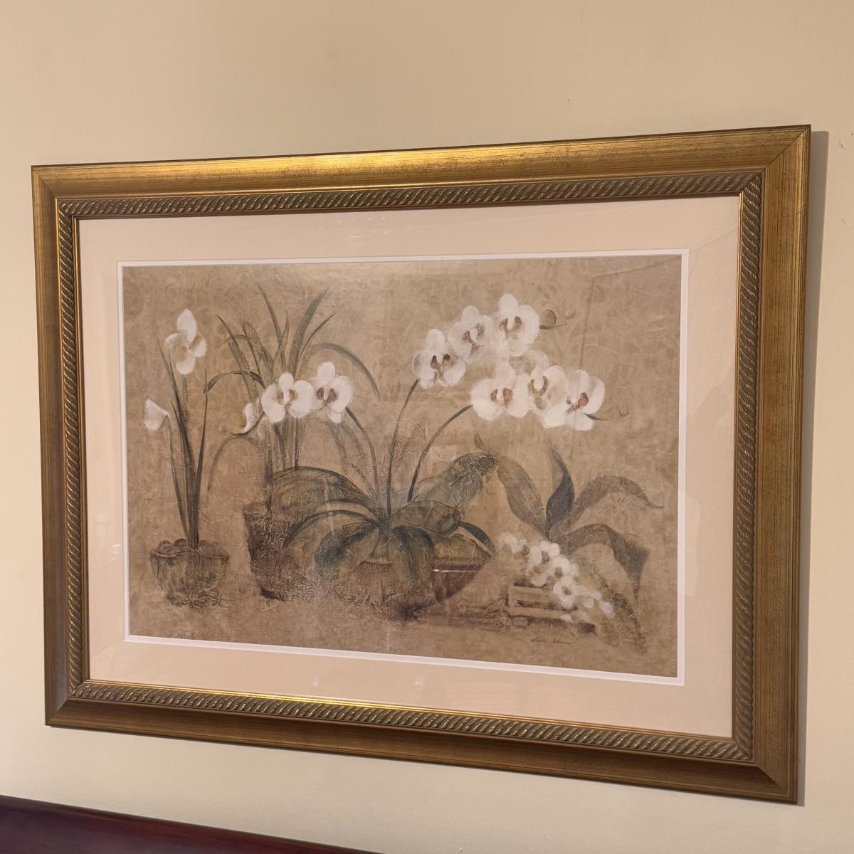 Lot includes one large print with a label on the back calling it “Four Potted Orchids” by Cheri Blum. The print is protected with glass, a matting, and a wooden frame. The frame measures 38” x 29”H. Shipping available. Shipping can be costly. We suggest contacting our preferred local shipping provider, Postage Express, with dimensions and getting an estimate before bidding: (828) 255-9250 or shipping@postageexpressnc.com.