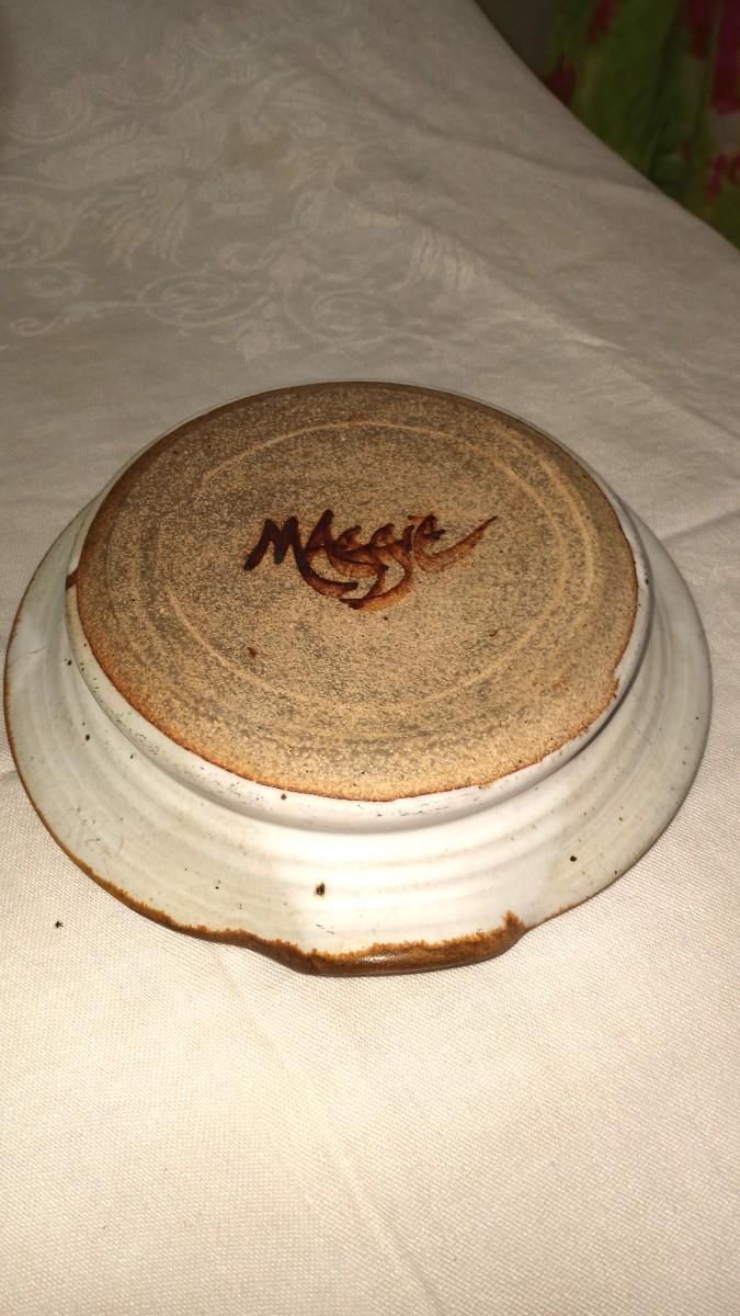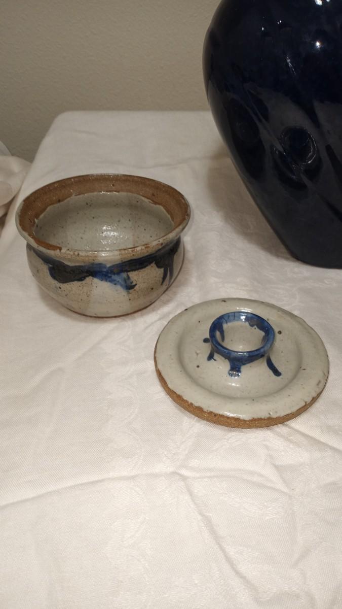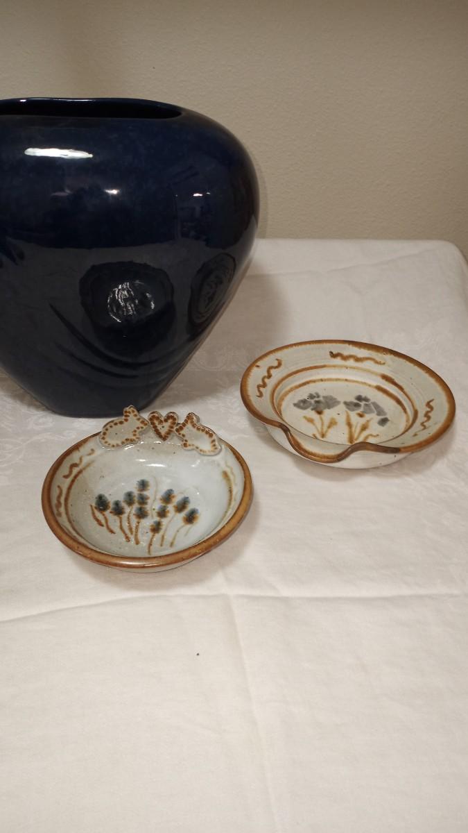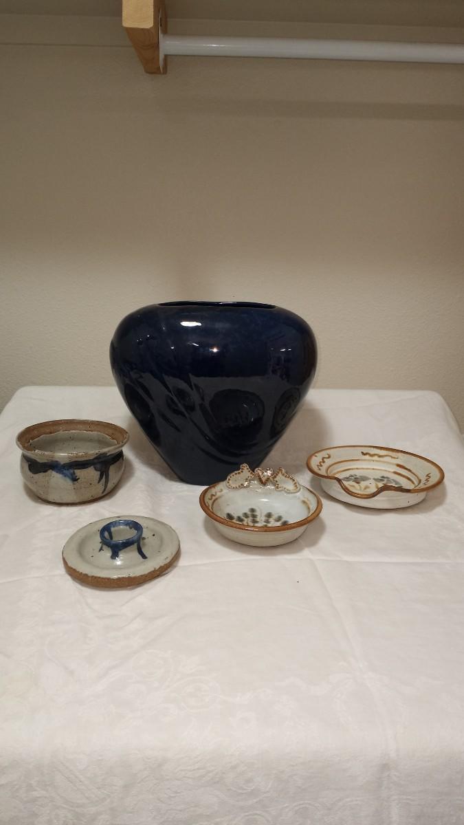 FOUR POTTERY DISHES AND CERAMIC VASE