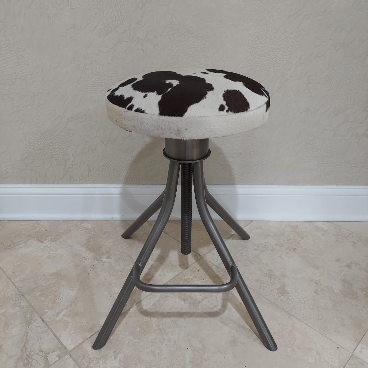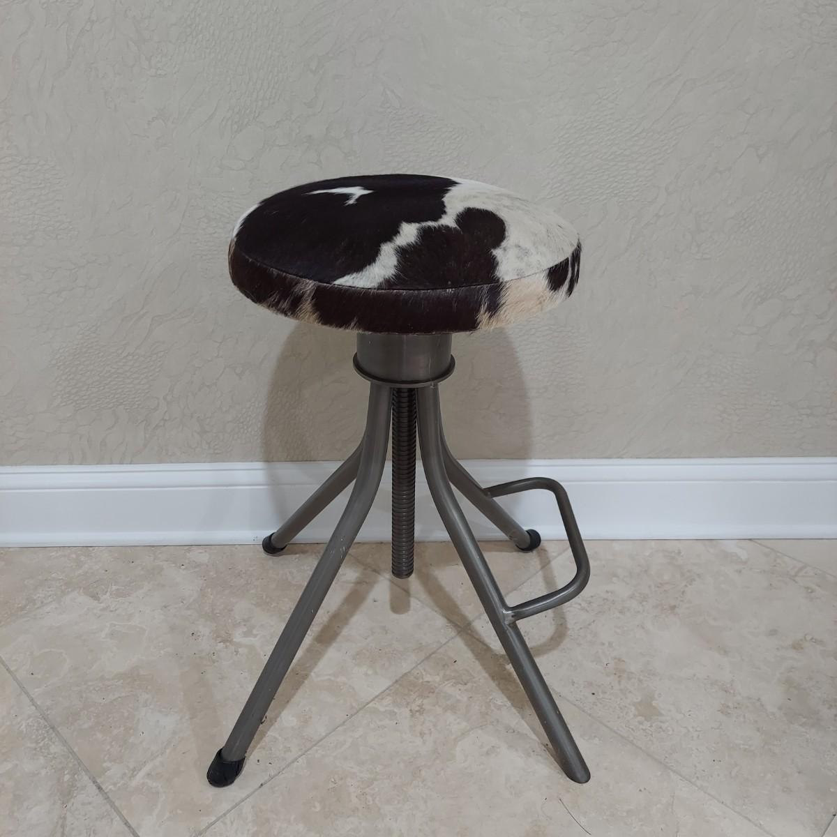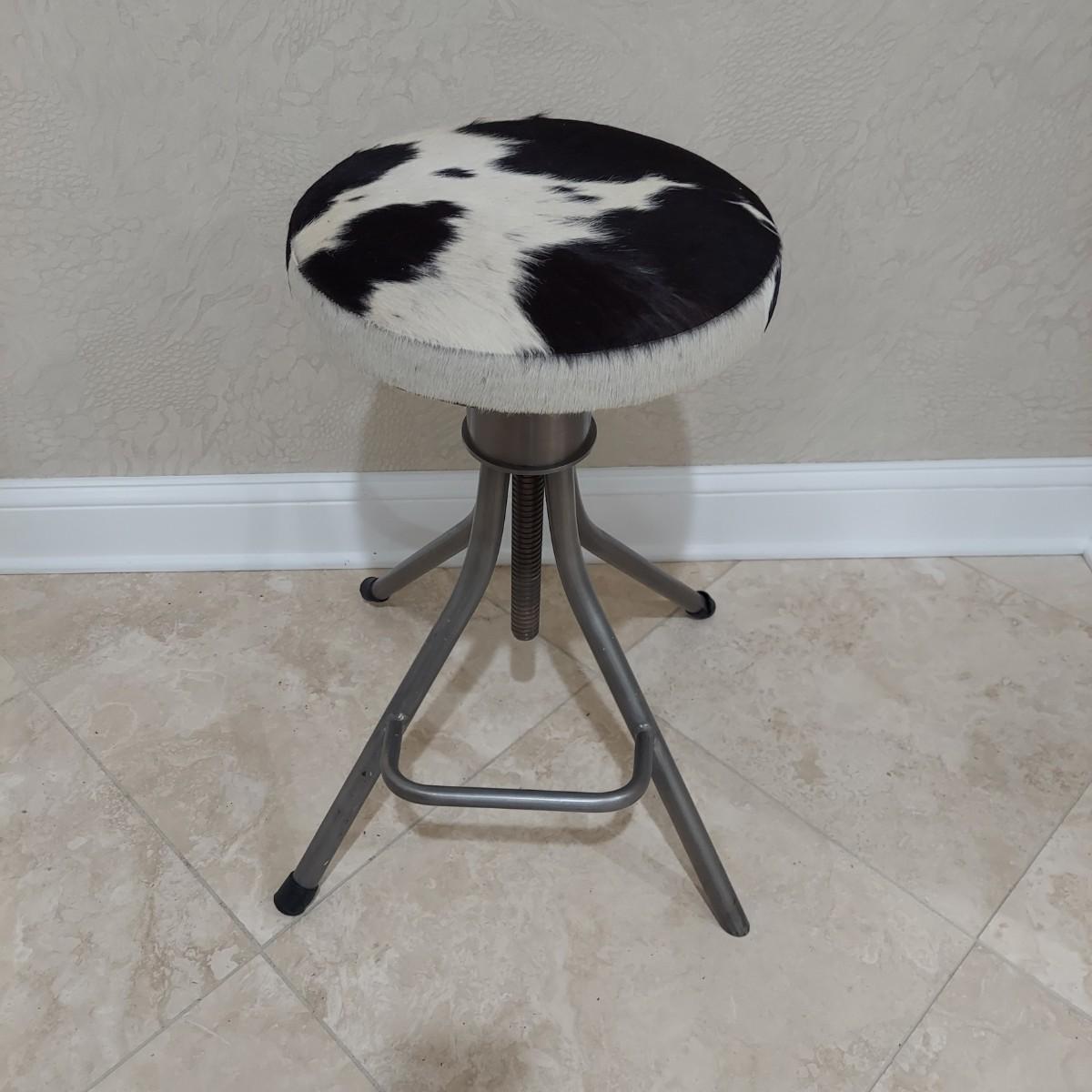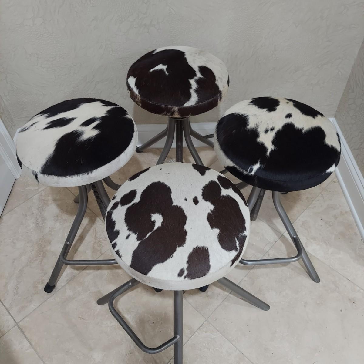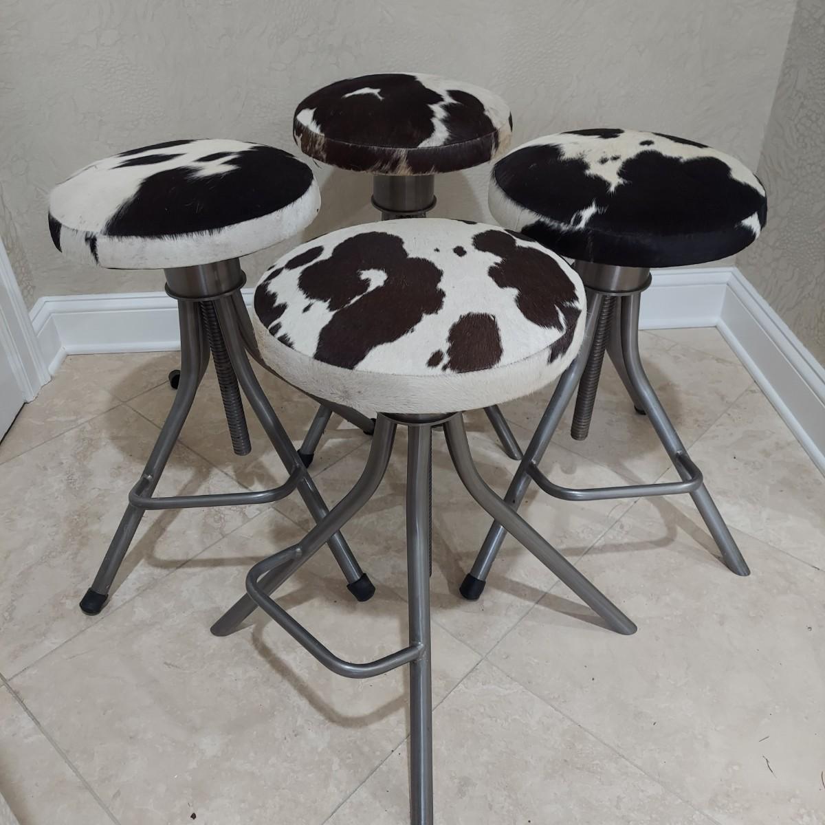 Lot of four animal print adjustable barstools. They are covered in what appears to be cow hide. We cannot verify if they are real cowhides. They have a padded seat and a metal base with foot rest. Each base is 17" square. Seat has 13.5" diameter with a height of 22-35". Local pickup only.