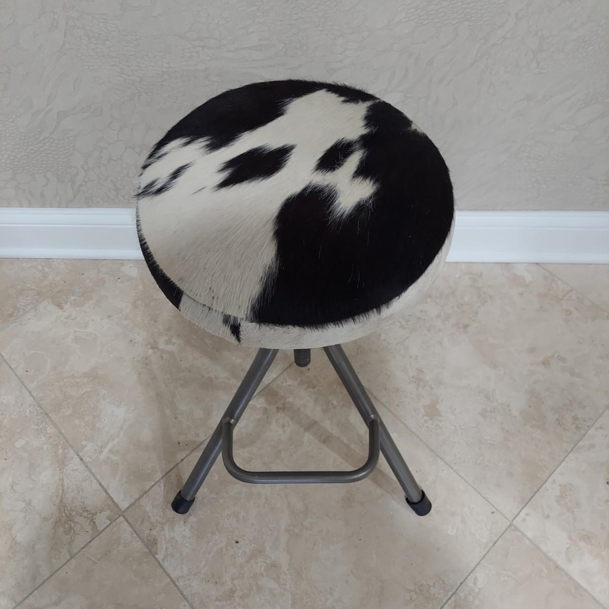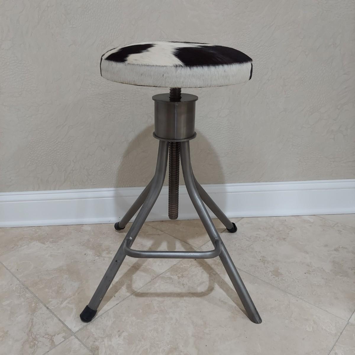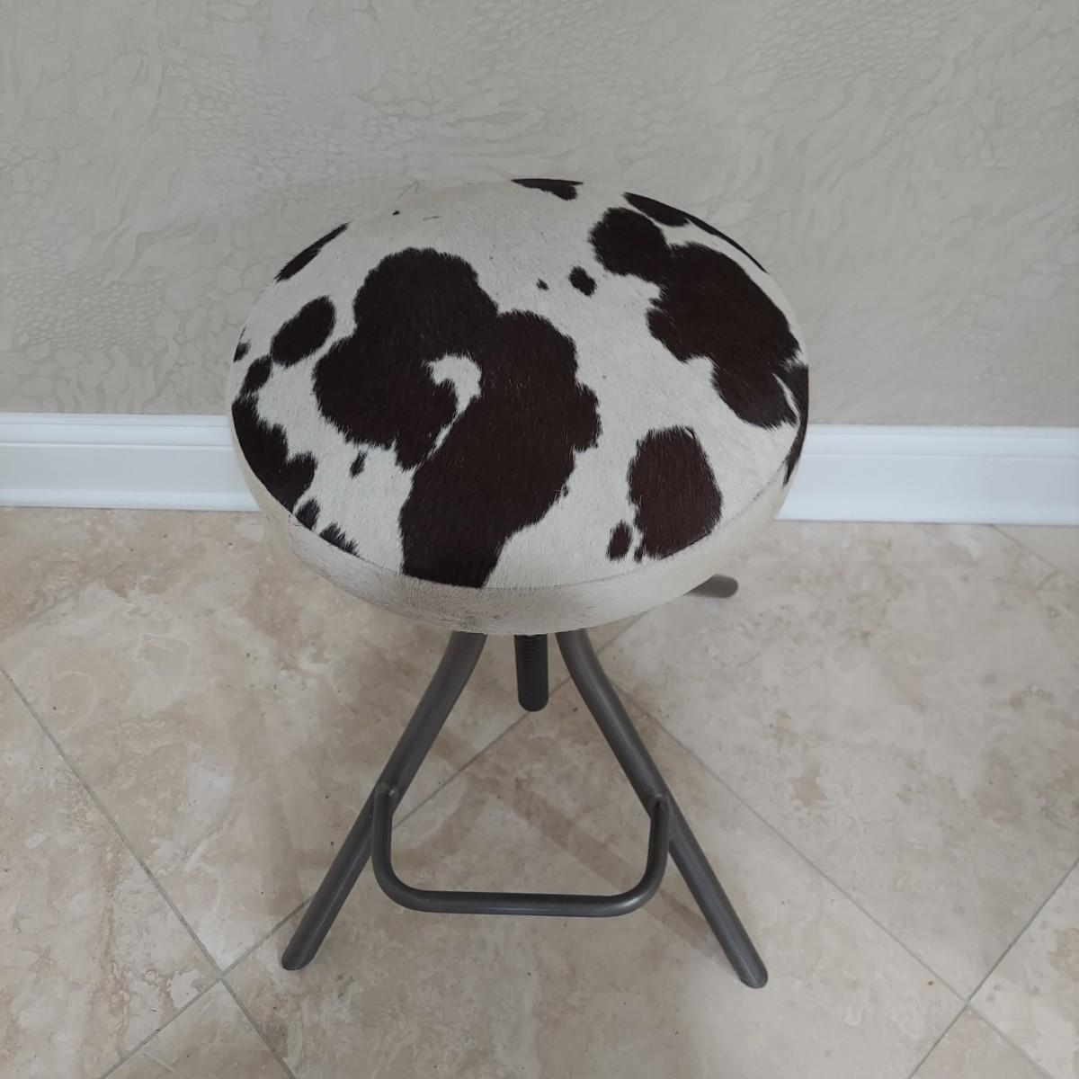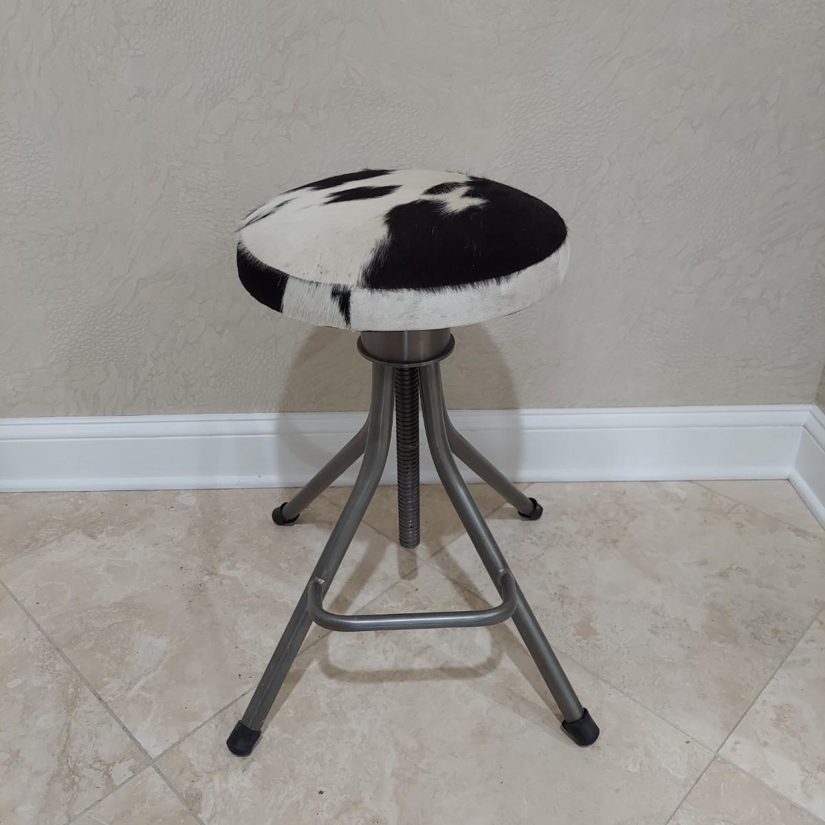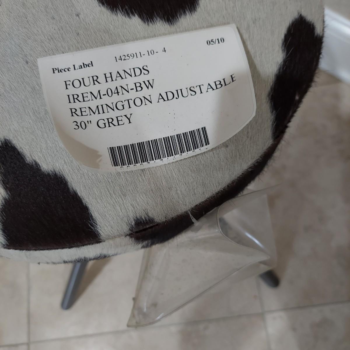 Lot of four animal print adjustable barstools. They are covered in what appears to be cow hide. We cannot verify if they are real cowhides. They have a padded seat and a metal base with foot rest. Each base is 17" square. Seat has 13.5" diameter with a height of 22-35". Local pickup only.