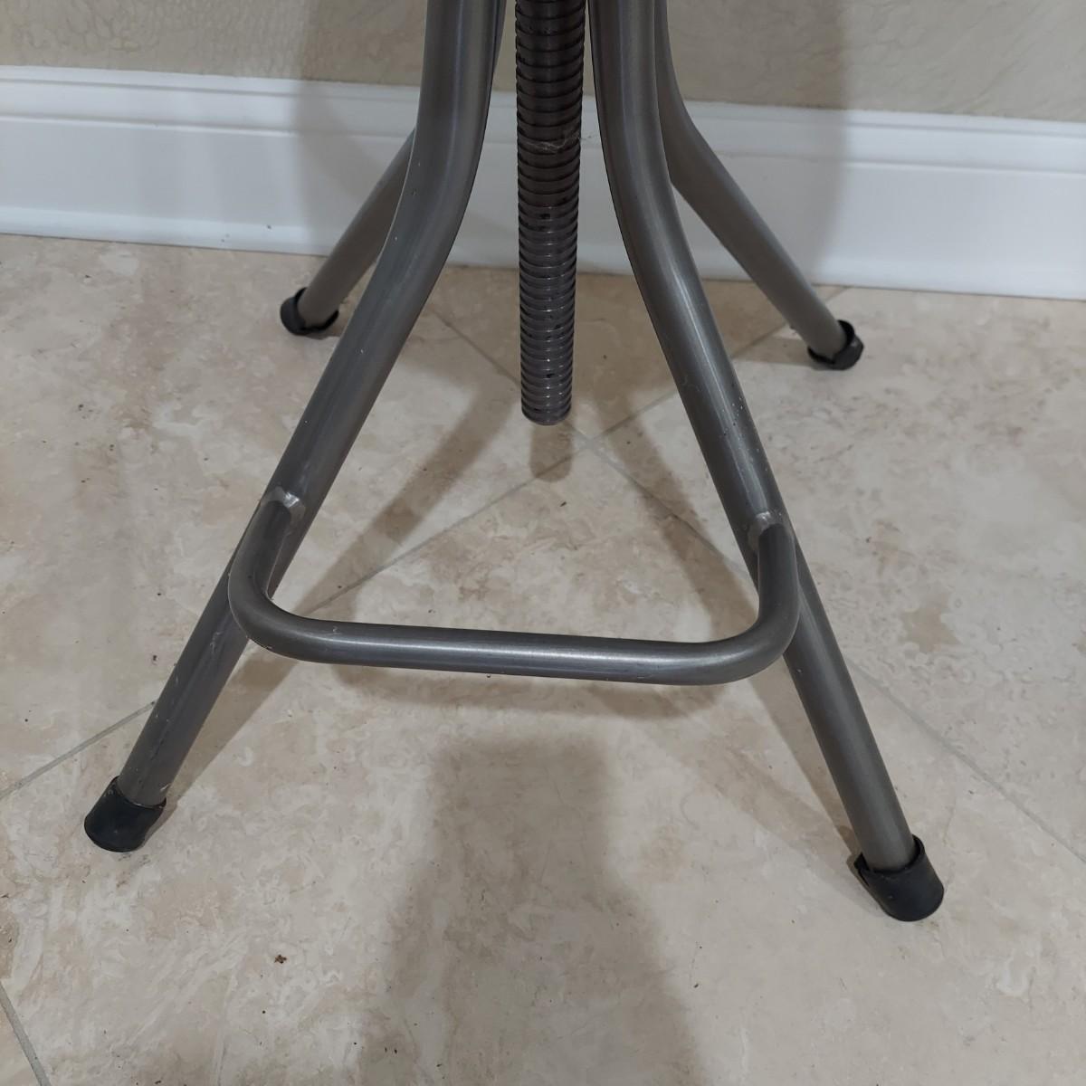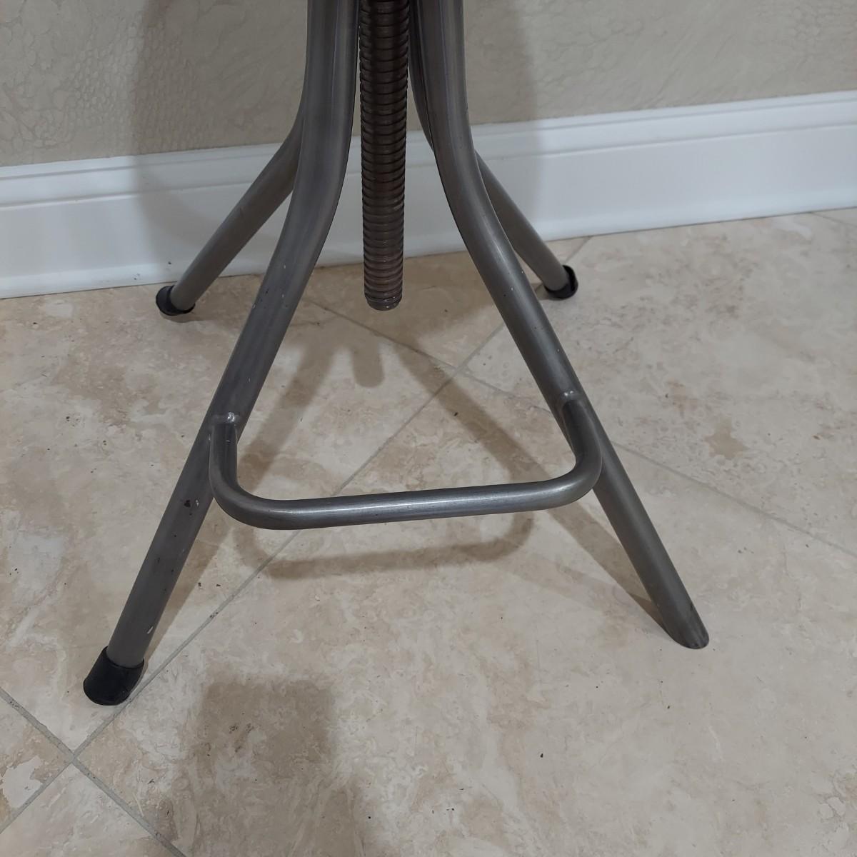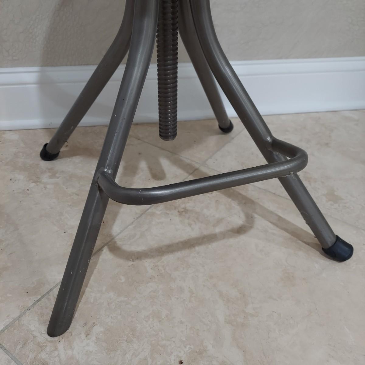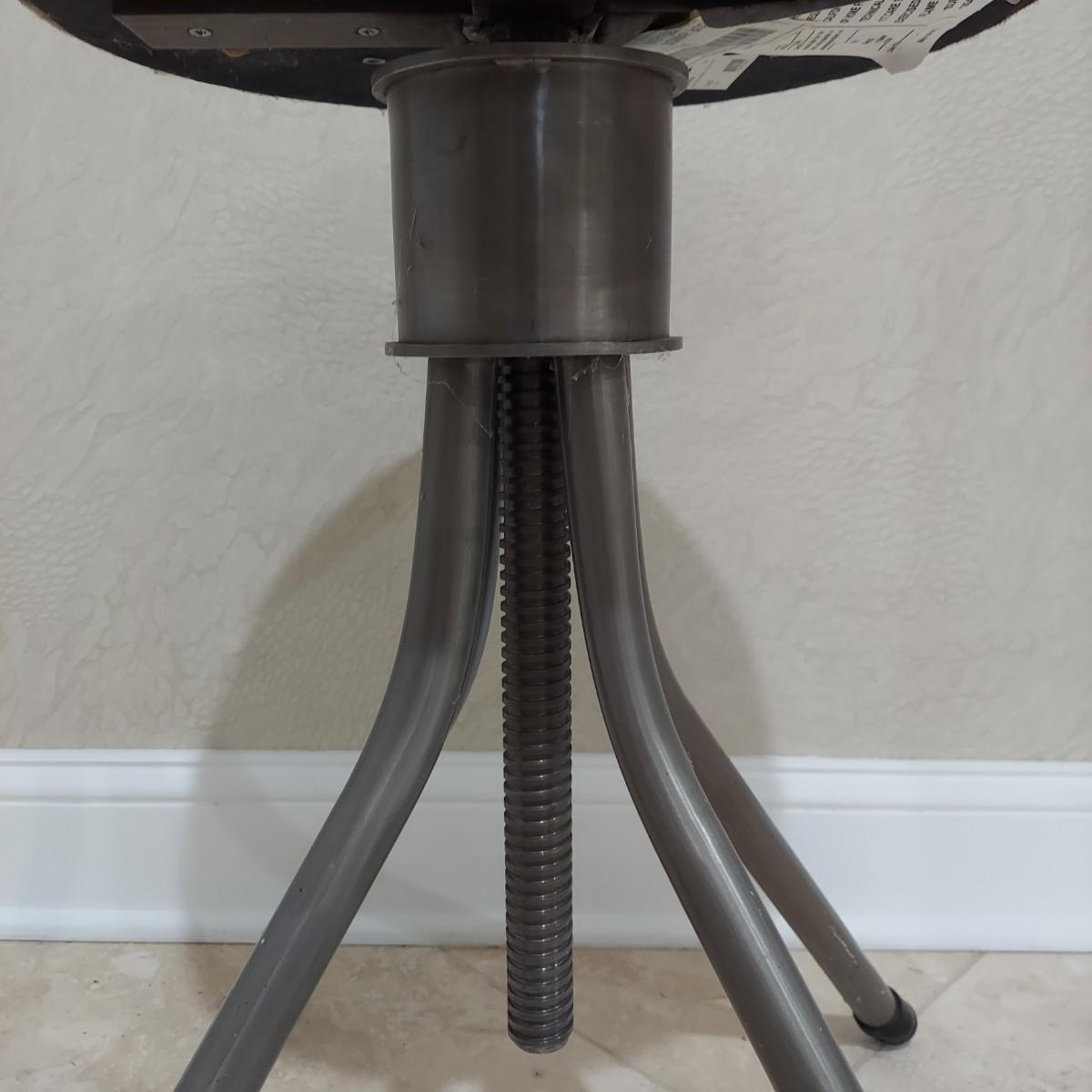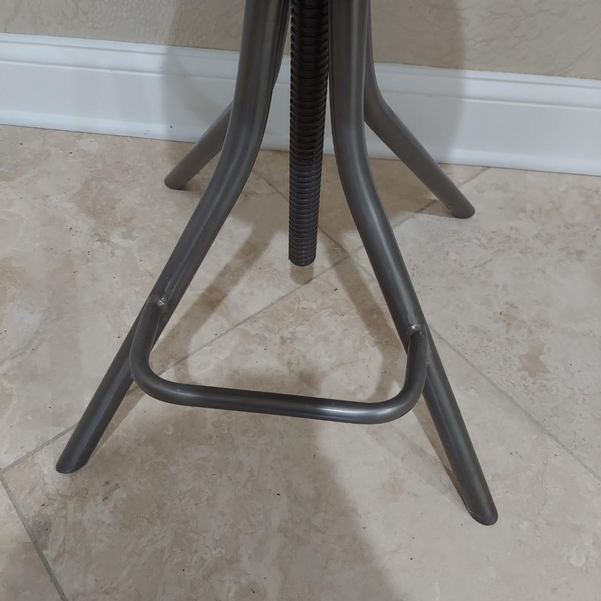 Lot of four animal print adjustable barstools. They are covered in what appears to be cow hide. We cannot verify if they are real cowhides. They have a padded seat and a metal base with foot rest. Each base is 17" square. Seat has 13.5" diameter with a height of 22-35". Local pickup only.
