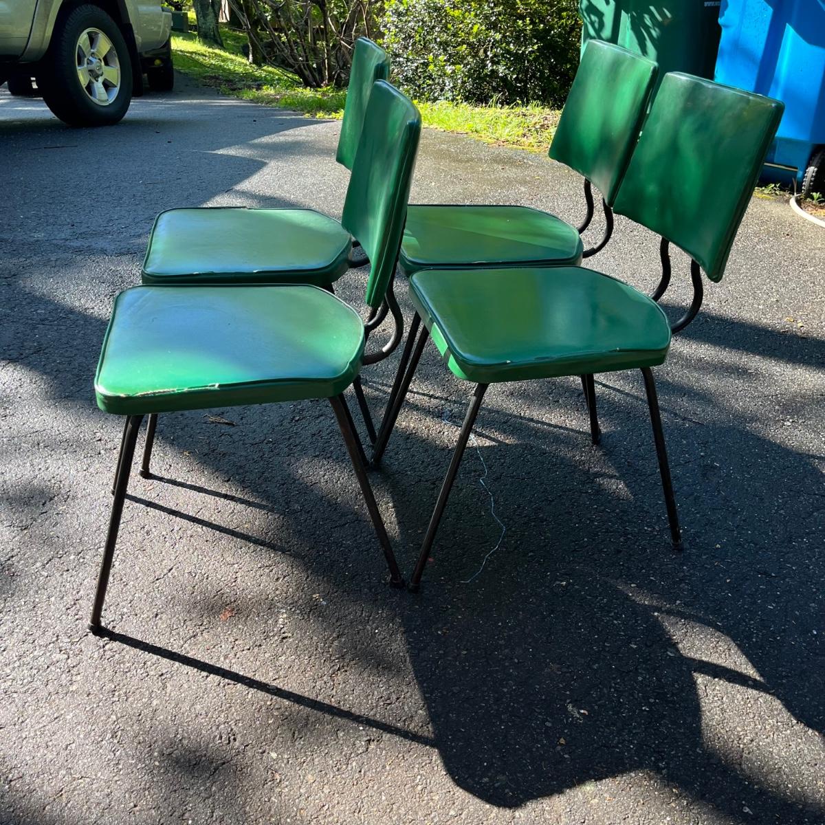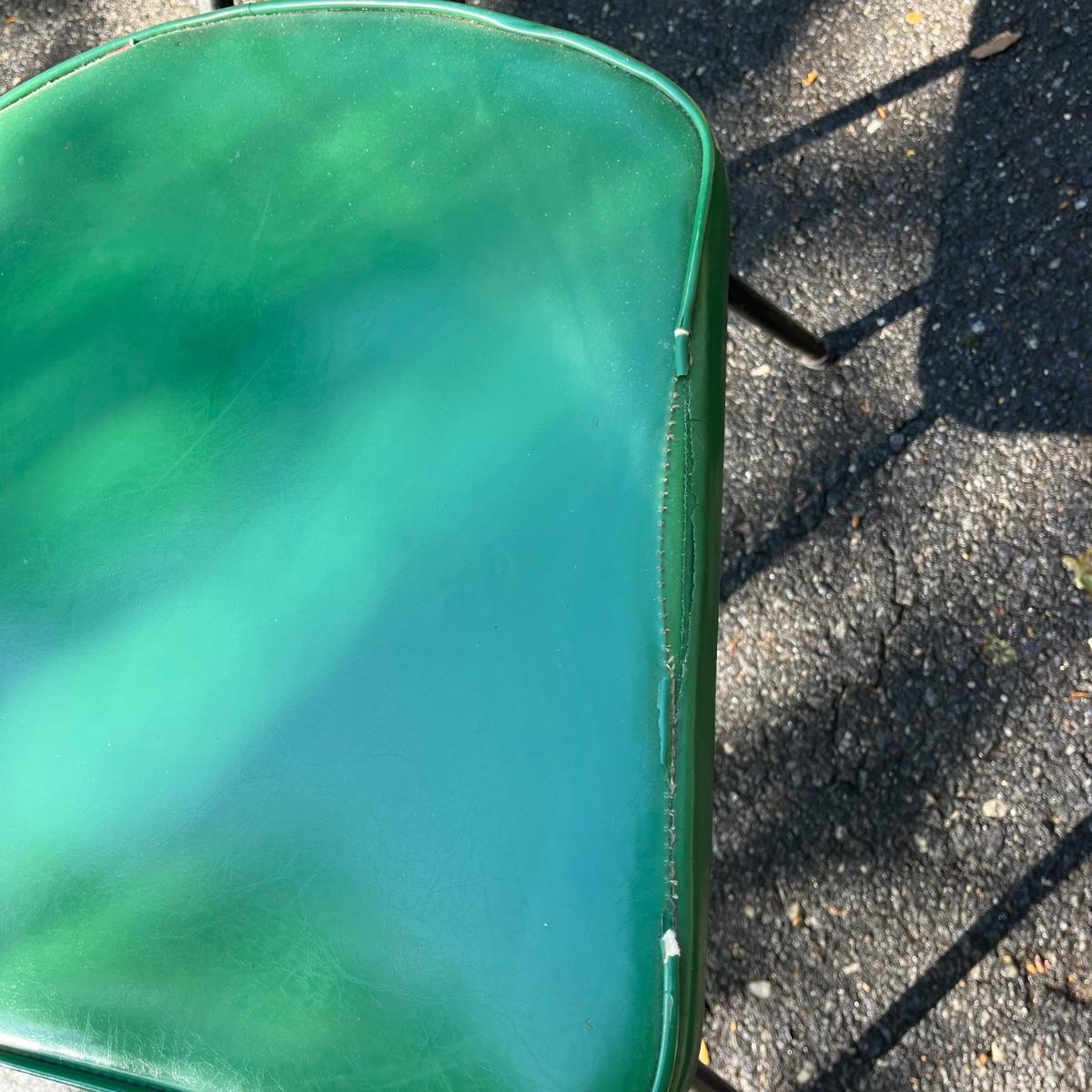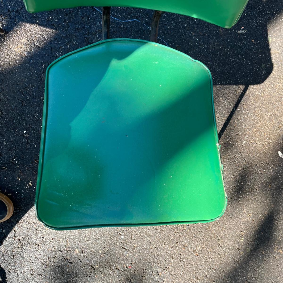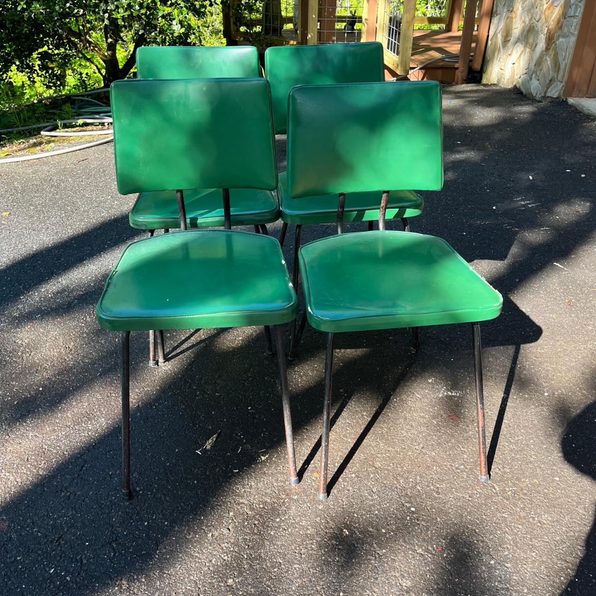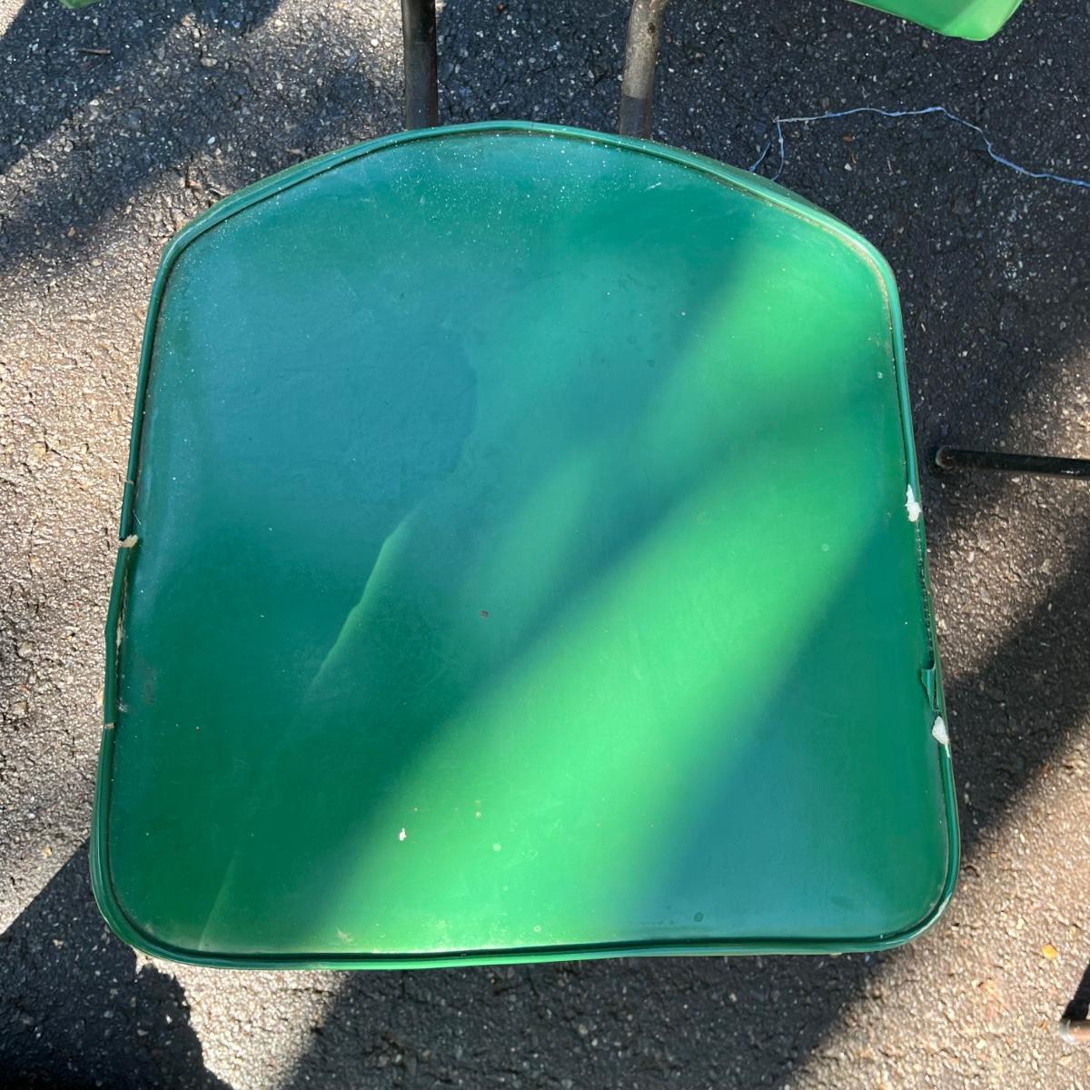 Lot includes four metal frame chairs with a groovy green vinyl covering on seat and backrest. Vinyl on seats are coming apart at seams, see pictures. Chairs measure 22” x17” x 29.5” with a 16.5” seat height. Local pick up only