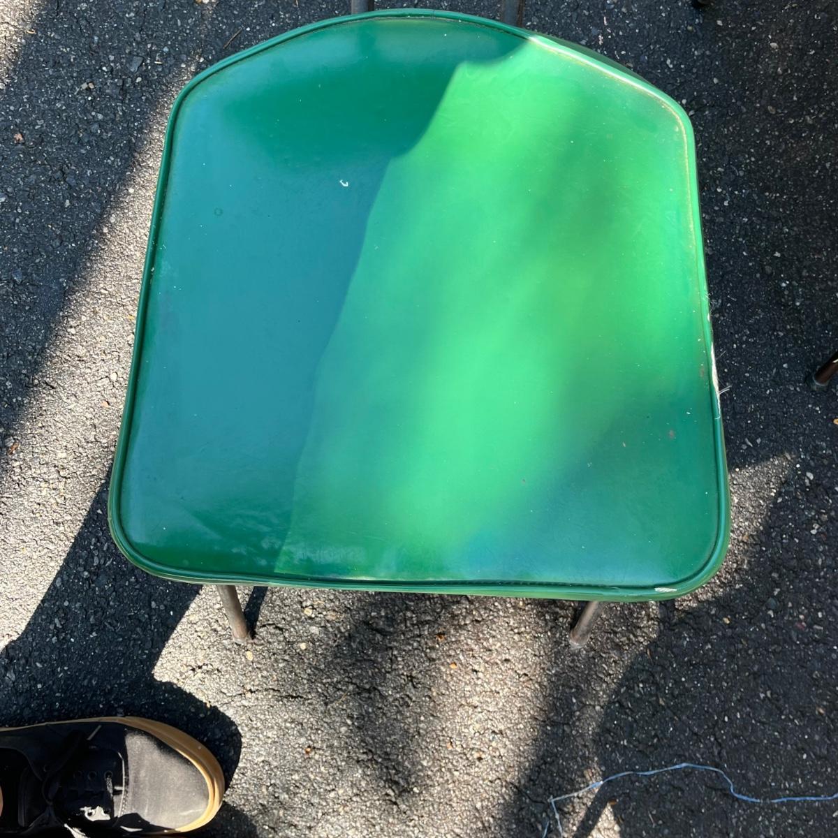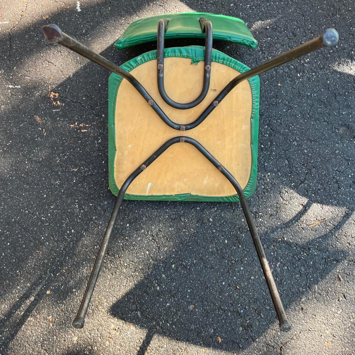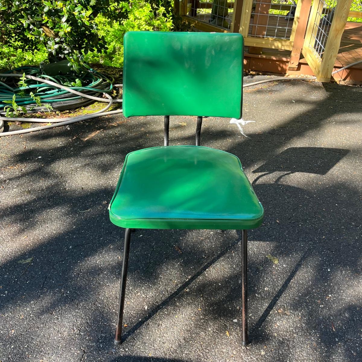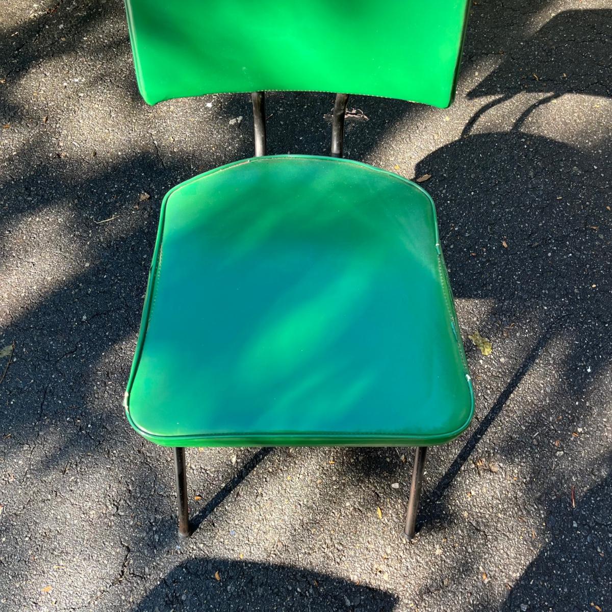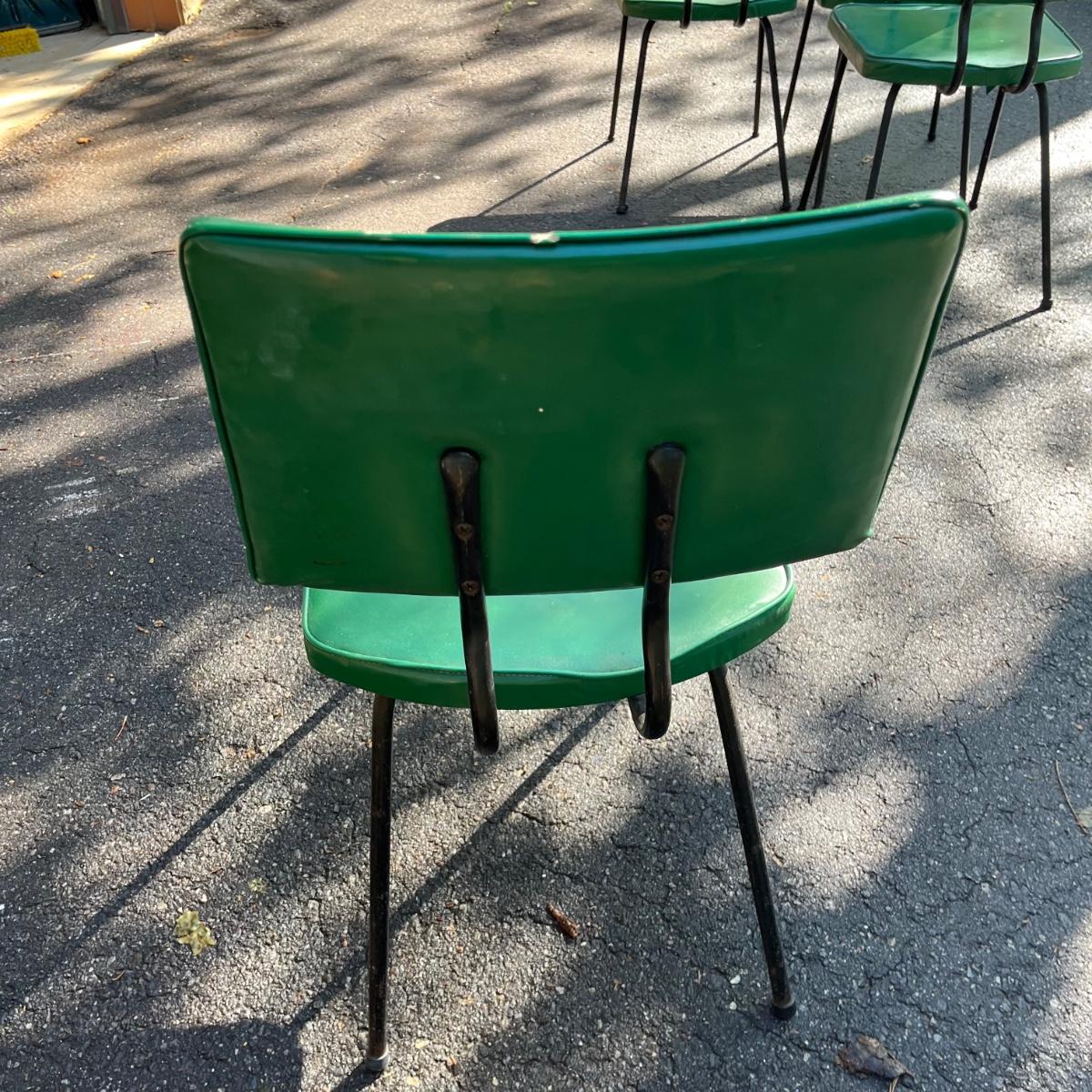 Lot includes four metal frame chairs with a groovy green vinyl covering on seat and backrest. Vinyl on seats are coming apart at seams, see pictures. Chairs measure 22” x17” x 29.5” with a 16.5” seat height. Local pick up only