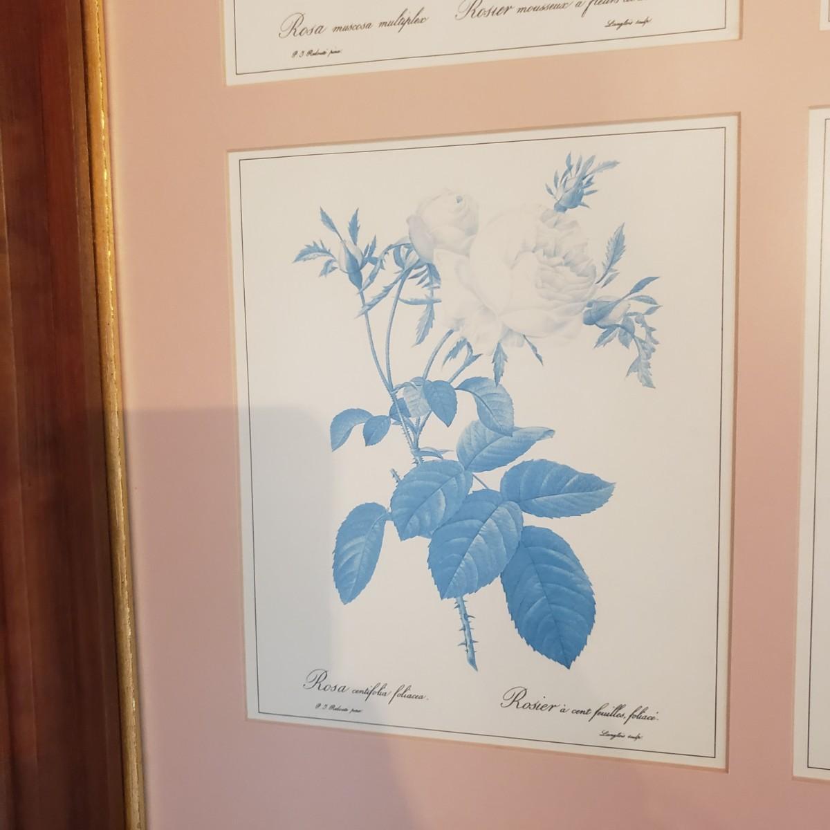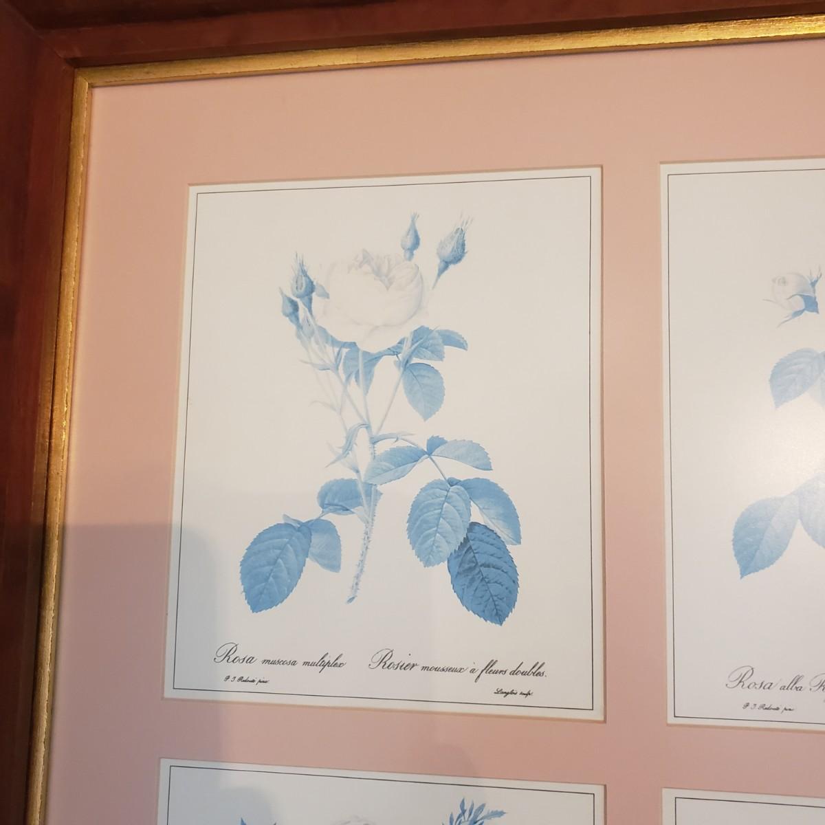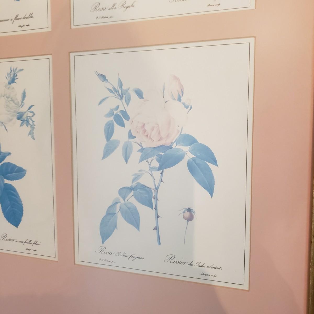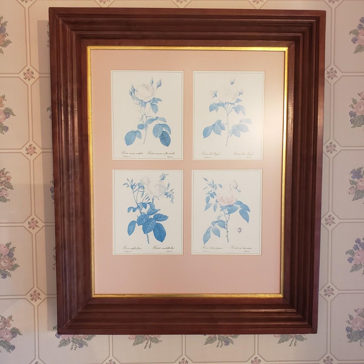 This beautifully framed piece has four different artistic roses matted in a soft pink color. The wood frame measures 23" x 3" x 28"H. There is a gold rim around the inside of the frame, see pictures. The rose pictures show some sun bleaching due to its location in the home near a sunny window. The picture is encased in glass, but it could possibly be a plexiglass type of material.