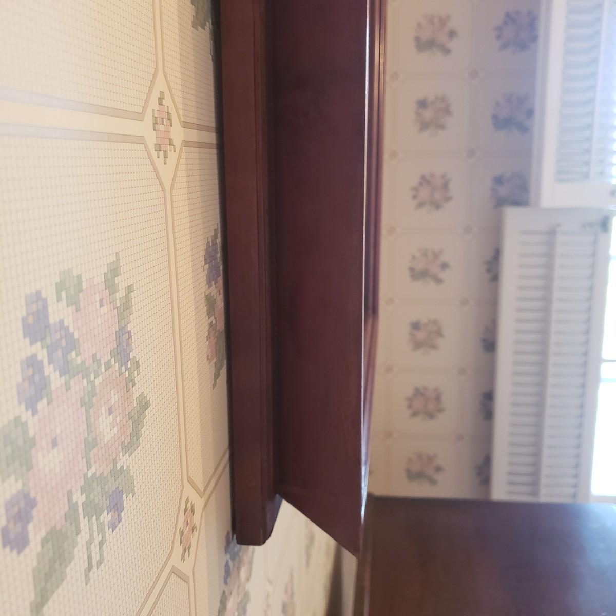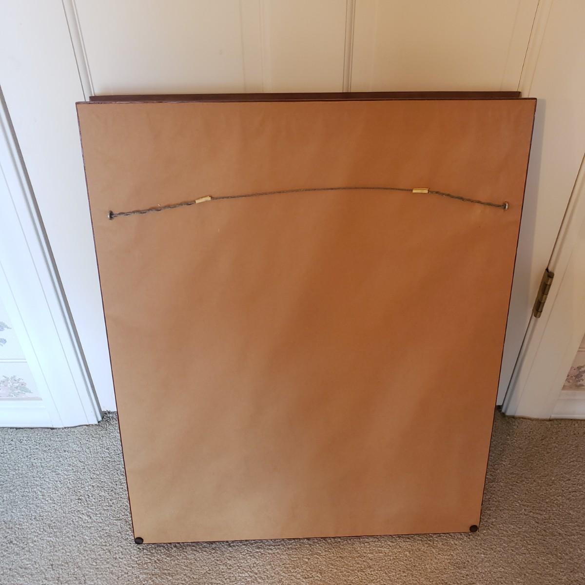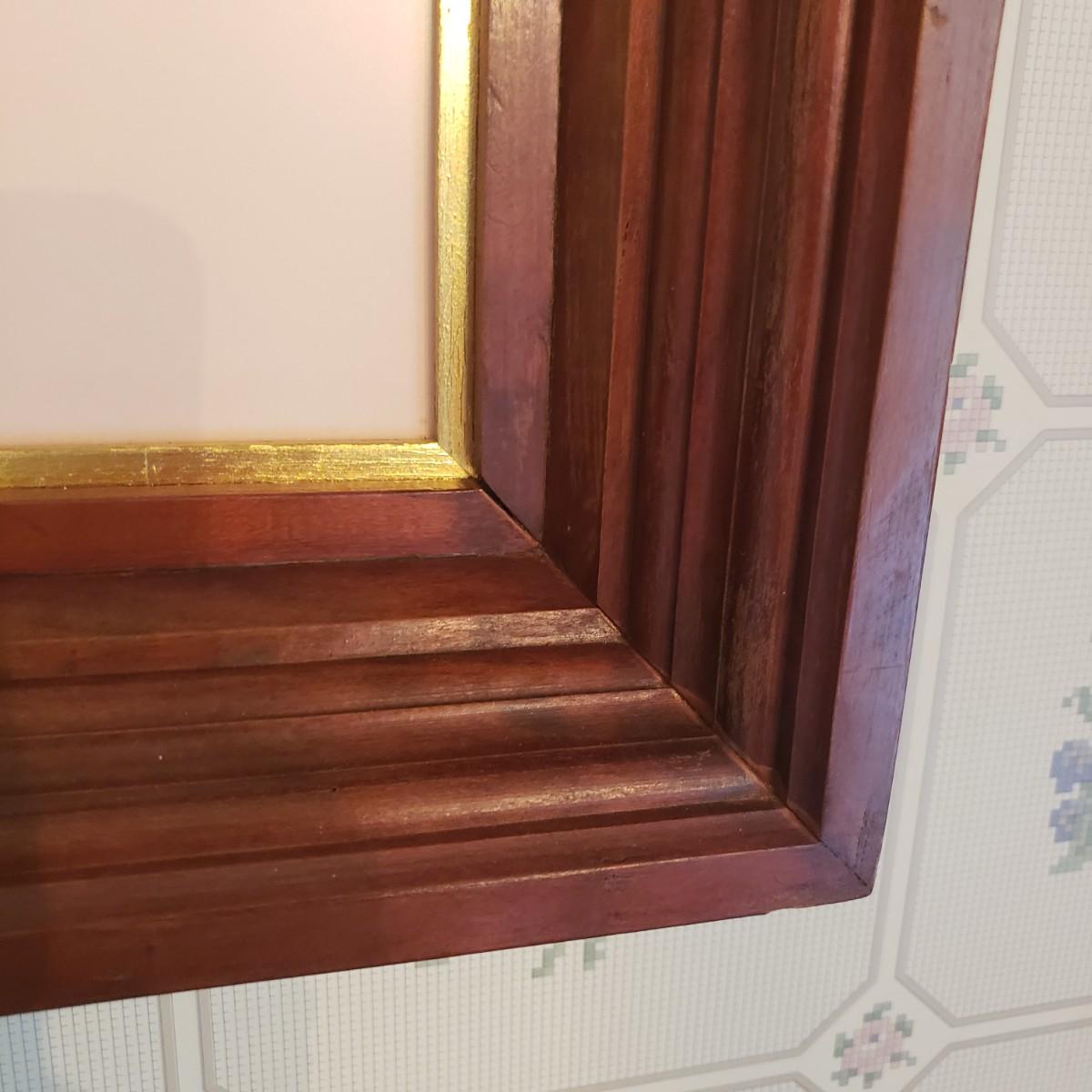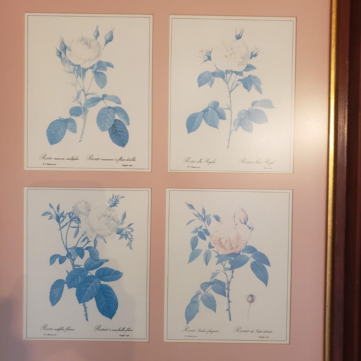 This beautifully framed piece has four different artistic roses matted in a soft pink color. The wood frame measures 23" x 3" x 28"H. There is a gold rim around the inside of the frame, see pictures. The rose pictures show some sun bleaching due to its location in the home near a sunny window. The picture is encased in glass, but it could possibly be a plexiglass type of material.